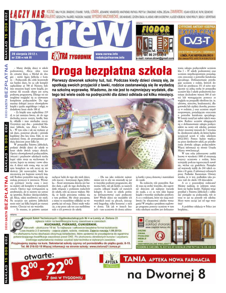 nakład 15 000 egz. ááááá gazeta B E Z P Ł AT N A nakład 15 000 egz. ááááá gazeta B E Z P Ł AT N A nakład 15 000 egz. reklama 28 sierpnia 2012 r. nr 236 n rok VI – Mamy dwójkę dzieci w szkole podstawowej, Alicja idzie teraz do czwartej klasy, a Michał do drugiej – mówi Agata Jabłecka z Łomży. – Podręczniki dla córki kosztowały nas bardzo dużo, bo za cały komplet zapłaciliśmy aż 700 zł. Niestety, byliśmy zmuszeni kupić nowe książki, ponieważ Ali rocznik objęty jest nową podstawą programową. Dlatego też nie mogliśmy rozglądać się za używanym kompletem podręczników. Do tego musimy dokupić jeszcze obowiązkowe książki z języka angielskiego i religii, to dodatkowy koszt około 100 zł. – Za książki syna zapłaciliśmy 219 zł, to już mniejsza kwota, ale do tego dochodzą jeszcze zeszyty, kredki, linijki, okładki i inne niezbędne rzeczy. Oczywiście razy dwa – powiedział Mariusz Jabłecki, tata Alicji i Michała. – W tym roku i tak nie wydamy aż tak dużo, ponieważ plecaki i piórniki kupiliśmy dwa lata temu. Fakt, że nie najtańszej firmy, ale przynajmniej posłużą dzieciom przez kilka lat. W przypadku Państwa Jabłeckich, posłanie dwójki dzieci do szkoły to koszt około dwóch tysięcy złotych. Oprócz obowiązkowych podręczników, ćwiczeń i przyborów szkolnych trzeba kupić także stroje na wychowanie fizyczne, kapcie na zmianę i nowe ubrania. A dzieci stale rosną, więc na jednym komplecie na rok raczej się nie skończy. Jak zaoszczędzić, kiedy koniecznością jest kupienie nowych książek? Rodzice pomysłów mają wiele, np. szukają promocji w internecie. Wystarczy poświęcić trochę czasu i można znaleźć całe komplety w okazyjnych cenach. Oprócz tego rozwiązaniem są antykwariaty, ale to niestety nie zawsze się sprawdza. Rodzice dziesięciolatków, jak Alicja, takiej możliwości nie mieli. Na szczęście syn państwa Jabłeckich może mieć już kilka książek po starszej siostrze. Chociaż też nie wszystkie. – To straszne, że państwo zamiast reklama www.narew.info [email protected] Droga bezpłatna szkoła Pierwszy dzwonek szkolny tuż, tuż. Podczas kiedy dzieci cieszą się, że spotkają swoich przyjaciół z ławki, rodzice zastanawiają się ile wydadzą na szkolną wyprawkę. Wiadomo, że nie jest to najmniejszy wydatek, dlatego też wiele osób na podręczniki dla dzieci odkłada od kilku miesięcy. zachęcać ludzi do tego aby mieli dzieci, robi inaczej – kontynuuje Agata Jabłecka. – Koszt utrzymania dziecka jest bardzo duży, a gdy do tego dochodzą wydatki związane z posłaniem maluchów do szkoły, robi się jeszcze większy. Myślę, że każda przeciętna rodzina ma z tym problem. My oboje pracujemy, a mimo to musieliśmy odkładać na wyprawkę już od maja. Dzieci miały wakacje, a my przez cały ten czas myśleliśmy stale o ich powrocie do szkoły. – Dla nas jako rodziców najważniejsze jest to aby nie zmieniały się już te wszystkie podstawy programowe, aby można było, tak jak kiedyś, za naszych czasów, odkupić książki od starszych kolegów. A może to szkoła powinna dofinansowywać część podręczników? Wtedy dzieci nie musiałyby ich wszystkich nosić na plecach, niszcząc swój kręgosłup, tylko korzystać z nich w domu. Tak jak w innych krajach – tam uczniowie do domu zabiera- ją kartki z pracą domową i materiałami do nauki. Ilu rodziców, tyle pomysłów. Każdy stara się zrobić wszystko, aby zapewnić dzieciom jak najlepsze warunki do nauki, a co za tym idzie kupuje książki i wszystkie niezbędne przybory. A co z rodzinami, które nie mają możliwości by sfinansować szkolne wymagania? W związku z projektem rządowego programu pomocy uczniom w tym roku szkolnym możliwe jest dofinanso- wania zakupu podręczników uczniom klas I – IV szkoły podstawowej oraz uczniom niepełnosprawnym posiadającym orzeczenie o potrzebie kształcenia specjalnego. Dofinansowanie przysługuje uczniom z rodzin, których dochód nie przekracza 351 zł netto miesięcznie na jedną osobę (w przypadku uczniów klas I szkoły podstawowej kryterium dochodowe wynosi 504 zł netto) lub wymagającym pomocy ze względu na przypadki określone (m. in. ubóstwa, sieroctwa, bezdomności, długotrwałej lub ciężkiej choroby, przemocy w rodzinie...) oraz uczniom niepełnosprawnym, posiadającym orzeczenie o potrzebie kształcenia specjalnego. W Łomży ruszył już nabór takich wniosków. Rodzice uczniów ubiegających się o dofinansowanie zakupu podręczników na nowy rok szkolny, powinni złożyć stosowny wniosek do 7 września br. dyrektorowi szkoły, do której będzie uczęszczał uczeń w roku szkolnym 2012/2013. Pomoc będzie wypłacana przez dyrektorów szkół, po przedłożeniu dowodu zakupu podręczników. Więcej informacji na stronie Urzędu Miasta: www.lomza.pl. W tym roku jednorazowy zasiłek losowy w wysokości 1000 zł otrzymają wszyscy uczniowie z rodzin, które ucierpiały podczas tegorocznych nawałnic, wichur czy gradobicia. Pieniądze od wojewody trafiły do 244 takich rodzin z 41 gmin. Z informacji zebranych przez Podlaskie Kuratorium Oświaty wynika, że w woj. podlaskim taka pomoc trafi do około 130 dzieciaków. A co z pozostałymi rodzicami? Miejmy nadzieję, że jedynym ratunkiem nie będzie kredyt. Najlepiej wziąć przykład z Państwa Jabłeckich i odkładać pieniądze na podręczniki, tyle że teraz to już na przyszły rok szkolny. Może warto zacząć już od tego września? A podobno edukacja w Polsce jest bezpłatna... 2 / WYDARZENIE NAREW EXTRA TYGODNIK – ŁOMŻA nnn wtorek 28 sierpnia 2012 Remont zabytkowej bramy na łomżyńskim cmentarzu Trwa remont 200-letniego cmentarza komunalnego przy ul. Kopernika w Łomży. Wymieniona zostanie część kamiennego ogrodzenia przy tzw. ewangelickiej części cmentarza. Odnowiona będzie również brama, która już dawno groziła zawaleniem. – Brama została postawiona