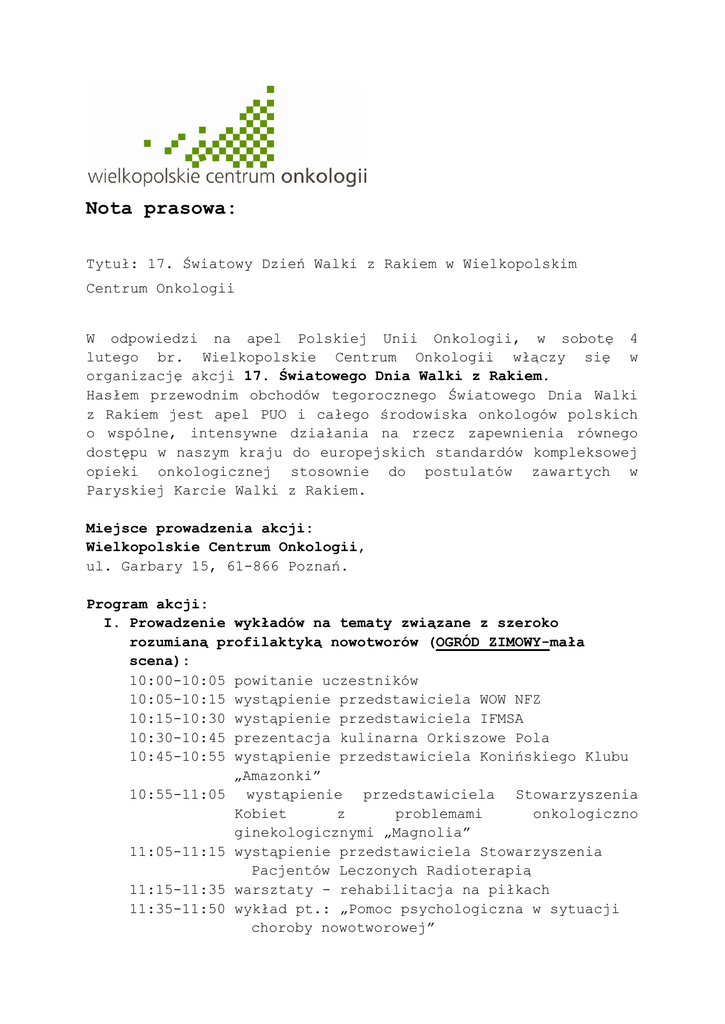 Nota prasowa: Tytuł: 17. Światowy Dzień Walki z Rakiem w Wielkopolskim Centrum Onkologii W odpowiedzi na apel Polskiej Unii Onkologii, w sobotę 4 lutego br. Wielkopolskie Centrum Onkologii włączy się w organizację akcji 17. Światowego Dnia Walki z Rakiem. Hasłem przewodnim obchodów tegorocznego Światowego Dnia Walki z Rakiem jest apel PUO i całego środowiska onkologów polskich o wspólne, intensywne działania na rzecz zapewnienia równego dostępu w naszym kraju do europejskich standardów kompleksowej opieki onkologicznej stosownie do postulatów zawartych w Paryskiej Karcie Walki z Rakiem. Miejsce prowadzenia akcji: Wielkopolskie Centrum Onkologii, ul. Garbary 15, 61-866 Poznań. Program akcji: I. Prowadzenie wykładów na tematy związane z szeroko rozumianą profilaktyką nowotworów (OGRÓD ZIMOWY-mała scena): 10:00-10:05 powitanie uczestników 10:05-10:15 wystąpienie przedstawiciela WOW NFZ 10:15-10:30 wystąpienie przedstawiciela IFMSA 10:30-10:45 prezentacja kulinarna Orkiszowe Pola 10:45-10:55 wystąpienie przedstawiciela Konińskiego Klubu „Amazonki” 10:55-11:05 wystąpienie przedstawiciela Stowarzyszenia Kobiet z problemami onkologiczno ginekologicznymi „Magnolia” 11:05-11:15 wystąpienie przedstawiciela Stowarzyszenia Pacjentów Leczonych Radioterapią 11:15-11:35 warsztaty - rehabilitacja na piłkach 11:35-11:50 wykład pt.: „Pomoc psychologiczna w sytuacji choroby nowotworowej” 11:50-12:00 wystąpienie przedstawiciela Stowarzyszenia Chorych na Czerniaka 12:00-12:20 wystąpienie wizażysty pt.: „Jak dobrze wyglądać?” 12:20-12:30 wystąpienie przedstawiciela Polskiego Towarzystwa Stomijnego „Polilko” 12:30-12:40 wystąpienie przedstawiciela Stowarzyszenia Mężczyzn z Chorobami Prostaty „Gladiator” 12:40-12:55 wykład pt.: „Nie pal. Nie używaj tytoniu w żadnej postaci.” 12:55-13:10 wykład pt.: „Przestrzegaj zaleceń prawidłowego sposobu żywienia” 13:10-13:25 wykład pt.: „Utrzymuj prawidłową masę ciała.” 13:25-13:40 nauka samobadania piersi na fantomach 13:40-13:55 wykład pt.: „Bądź aktywny fizycznie w codziennym życiu. Ogranicz czas spędzany na siedząco” 13:55-14:00 zakończenie i podsumowanie akcji II. Prowadzenie pogadanek na tematy profilaktyki, wczesnego rozpoznawania, możliwości skutecznego leczenia nowotworów we wczesnych stopniach zaawansowania, a także problemów związanych z terapią i życiem po leczeniu (OGRÓD ZIMOWY - stoiska): 1. Udzielanie prostych porad onkologicznych – rozmowa z lekarzem. 2. Rozpowszechnianie zaleceń Europejskiego Kodeksu Walki z Rakiem, wydawanie materiałów edukacyjnych propagujących postawy prozdrowotne i czujność onkologiczną (pomiar tlenku węgla, BMI i tkanki tłuszczowej). 3. Profilaktyka raka piersi (czynniki ryzyka, nauka samobadania piersi, informacje o badaniach profilaktycznych). 4. Międzynarodowe Stowarzyszenie Studentów Medycyny (IFMSA) porady zdrowotne, w tym dietetyka, pomiar ciśnienia tętniczego i poziomu cukru we krwi. 5. Wielkopolski Oddział Wojewódzki NFZ udzielanie informacji dotyczących świadczeń medycznych. 6. Stoisko Konińskiego Klubu „Amazonki”. 7. Stoisko Stowarzyszenia Kobiet z Problemami Onkologiczno-Ginekologicznymi „Magnolia”. 8. Stoisko Stowarzyszenia Chorych na Czerniaka. 9. Stoisko Polskiego Towarzystwa Stomijnego „Polilko”. 10. Stoisko Stowarzyszenia Mężczyzn z Chorobami Prostaty „Gladiator”. 11. Stoisko Stowarzyszenia Pacjentów Leczonych Radioterapią. 12. Stoisko Orkiszowe Pola (edukacja żywieniowa i porady). III. Warsztaty (ROTUNDA): 10:00-12:30 warsztaty makijażu 12:30-13:00 przerwa na obiad dla pacjentów na oddziałach 13:00-15:00 zajęcia z decoupage IV. Wystawa zdjęć z kalendarza przygotowanego przez Koniński Klub „Amazonki” (hol główny) oraz wystawa zdjęć z kalendarza przygotowanego przez Wielkopolskie Centrum Onkologii (Ogród Zimowy). V. Zwiedzanie oddziałów i zakładów diagnostyczno-leczniczych 10:30-12:00 zwiedzanie oddziałów i zakładów diagnostycznoleczniczych w 2 równoległych grupach Osobą odpowiedzialną za organizację akcji jest dr n. med. A. Dyzmann-Sroka (tel. 605 828 873; e-mail:[email protected]
