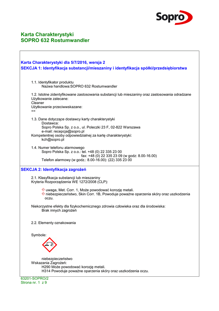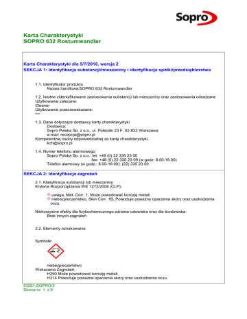 Karta Charakterystyki SOPRO 632 Rostumwandler Karta Charakterystyki dla 5/7/2016, wersja 2 SEKCJA 1: Identyfikacja substancji/mieszaniny i identyfikacja spółki/przedsiębiorstwa 1.1. Identyfikator produktu Nazwa handlowa:SOPRO 632 Rostumwandler 1.2. Istotne zidentyfikowane zastosowania substancji lub mieszaniny oraz zastosowania odradzane UŜytkowanie zalecane: Cleaner UŜytkowanie przeciwwskazane: == 1.3. Dane dotyczące dostawcy karty charakterystyki Dostawca: Sopro Polska Sp. z o.o., ul. Poleczki 23 F, 02-822 Warszawa e-mail: [email protected] Kompetentnej osoby odpowiedzialnej za kartę charakterystyki: [email protected] 1.4. Numer telefonu alarmowego Sopro Polska Sp. z o.o.: tel. +48 (0) 22 335 23 00 fax: +48 (0) 22 335 23 09 (w godz: 8.00-16.00) Telefon alarmowy (w godz.: 8.00-16.00): (22) 335 23 00 SEKCJA 2: Identyfikacja zagroŜeń 2.1. Klasyfikacja substancji lub mieszaniny Kryteria Rozporządzenia WE 1272/2008 (CLP): uwaga, Met. Corr. 1, MoŜe powodować korozję metali. niebezpieczeństwo, Skin Corr. 1B, Powoduje powaŜne oparzenia skóry oraz uszkodzenia oczu. Niekorzystne efekty dla fizykochemicznego zdrowia człowieka oraz dla środowiska: Brak innych zagroŜeń 2.2. Elementy oznakowania Symbole: niebezpieczeństwo Wskazania ZagroŜeń: H290 MoŜe powodować korozję metali. H314 Powoduje powaŜne oparzenia skóry oraz uszkodzenia oczu. 63201-SOPRO/2 Strona nr. 1 z 9 Karta Charakterystyki SOPRO 632 Rostumwandler Środki OstroŜności: P102 Chronić przed dziećmi. P234 Przechowywać wyłącznie w oryginalnym pojemniku. P280 Stosować rękawice ochronne/odzieŜ ochronną/ochronę oczu/ochronę twarzy. P305+P351+P338 W PRZYPADKU DOSTANIA SIĘ DO OCZU: OstroŜnie płukać wodą przez kilka minut. Wyjąć soczewki kontaktowe, jeŜeli są i moŜna je łatwo usunąć. Nadal płukać. P310 Natychmiast skontaktować się z OŚRODKIEM ZATRUĆ. P405 Przechowywać pod zamknięciem. Polecenia specjalne: śadna Zawiera: Kwas fosforowy V; kwas ortofosforowy P102 Chronić przed dziećmi P332+P313 W przypadku wystąpienia podraŜnienia skóry: Zasięgnąć porady/zgłosić się pod opiekę lekarza. Specjalne postanowienia zgodna z Załącznikiem XVII Rozporządzenia REACH i kolejnymi nowelizacjami: śadna 2.3. Inne zagroŜenia Substancje vPvB: śadna - Substancje PBT: śadna Inne zagroŜenia: Brak innych zagroŜeń SEKCJA 3:Skład/informacja o składnikach 3.1. Substancje N.A. 3.2. Mieszaniny Składniki niebezpieczne według Rozporządzenia CLP oraz odpowiedniej klasyfikacji: >= 25% - < 50% Kwas fosforowy V; kwas ortofosforowy REACH No.: 01-2119485924-24-XXXX, Numer Index: 015-011-00-6, CAS: 7664-38-2, EC: 231-633-2 3.2/1B Skin Corr. 1B H314 SEKCJA 4: Środki pierwszej pomocy 4.1. Opis środków pierwszej pomocy W przypadku kontaktu ze skórą: Natychmiast zdjąć skaŜoną odzieŜ. Natychmiast umyć obficie biezącą wodą i ewentualnie mydłem strefy ciała, które weszły w kontakt z trucizną, nawet jeśli tylko podejrzane o to. NATYCHMIAST SKONSULTOWAĆ SIĘ Z LEKARZEM. Umyć dokładnie ciało (prysznic lub kąpiel). Zdjąć natychmiast skaŜoną odzieŜ i pozbyć się jej w bezpieczny sposób. Przy kontakcie ze skórą umyć się natychmiast przy uŜyciu mydła i duŜej ilości wody. W przypadku kontaktu z oczami: Przy kontakcie z oczami, płukać przy uŜyciu wody otwarte powieki przez wystarczająco długi okres czasu, po czym natychmiast zwrócić się do okulisty. Chronić oko, które nie odniosło obraŜeń. 63201-SOPRO/2 Strona nr. 2 z 9 Karta Charakterystyki SOPRO 632 Rostumwandler W przypadku Połknięcia: NIE powodować wymiotów. W przypadku Wdychania: Wyprowadzić ofiary na świeŜe powietrze, zapewnić im ciepło i odpoczynek. 4.2. NajwaŜniejsze ostre i opóźnione objawy oraz skutki naraŜenia Produkt jest korozyjny i doprowadzony do kontaktu ze skórą powoduje oparzenia, niszcząc całą warstwę tkanki skórnej. 4.3. Wskazania dotyczące wszelkiej natychmiastowej pomocy lekarskiej i szczególnego postępowania z poszkodowanym W razie wypadku lub złego poczucia się naleŜy natychmiast zwrócić się o poradę lekarską (jeśli to moŜliwe, pokazać instrukcje uŜytkowania lub kartę danych bezpieczeństwa). Leczenie: (zob. pkt 4.1) SEKCJA 5: Postępowanie w przypadku poŜaru 5.1. Środki gaśnicze Odpowiednie środki gaśnicze: Wszystkie srodki gasnicze sa dozwolone.. Woda. Dwutlenek węgla (CO2). Środki gaśnicze, których nie wolno stosować z powodów bezpieczeństwa: Wszystkie srodki gasnicze sa dozwolone.. 5.2. Szczególne zagroŜenia związane z substancją lub mieszaniną Nie wdychać gazów wybuchowych i palnych. Palenie powoduje cięŜki dym. Uwalniający się dym podczas zapalenia moŜe zawierać składniki lub związki toksyczne i/lub podraŜniające. 5.3. Informacje dla straŜy poŜarnej Zastosować odpowiedni inhalator. Gromadzić oddzielnie skaŜoną wodę pochodzącą z gaszenia poŜaru. Nie wolno odprowadzać jej do kanalizacji. Usunąć ze strefy bezpośredniego zagroŜenia nieuszkodzone pojemniki, jeŜeli jest to moŜliwe ze względów bezpieczeństwa. SEKCJA 6: Postępowanie w przypadku niezamierzonego uwolnienia do środowiska 6.1. Indywidualne środki ostroŜności, sprzęt ochronny i procedury w sytuacjach awaryjnych NałoŜyć środki ochrony osobistej. Usunąć wszystkie źródła zapalne. Wyprowadzić osoby w bezpieczne miejsce. Patrz środki ochronne w punkcie 7 i 8. 6.2. Środki ostroŜności w zakresie ochrony środowiska Powstrzymać wyciek przy uŜyciu ziemi lub piasku. UniemoŜliwić przedostanie się do gruntu i przygruntu. UniemoŜliwić przedostanie się do wód powierzchniowych lub kanalizacji. Zatrzymać skaŜoną wodę z mycia i usunąć ją. W przypadku ucieczki gazu do dróg wodnych, gruntu lub kanalizacji naleŜy poinformować o tym odpowiednie władze. Materiały odpowiednie do pochłaniania: materiały wchłaniające, materiały organiczne, piasek 6.3. Metody i materiały zapobiegające rozprzestrzenianiu się skaŜenia i