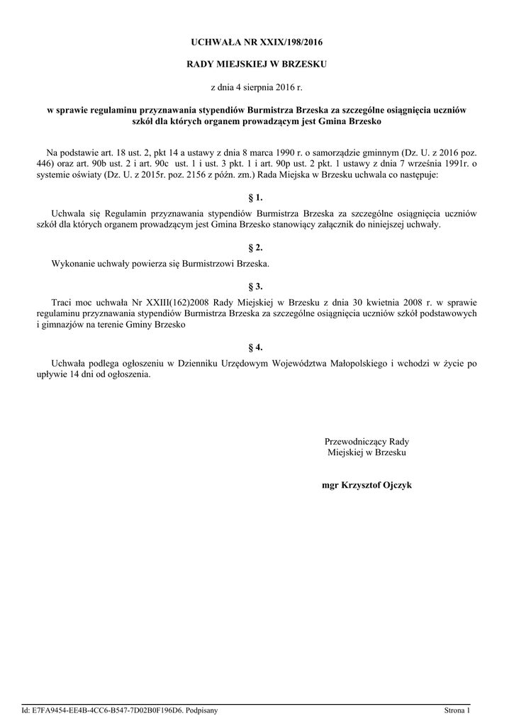 UCHWAŁA NR XXIX/198/2016 RADY MIEJSKIEJ W BRZESKU z dnia 4 sierpnia 2016 r. w sprawie regulaminu przyznawania stypendiów Burmistrza Brzeska za szczególne osiągnięcia uczniów szkół dla których organem prowadzącym jest Gmina Brzesko Na podstawie art. 18 ust. 2, pkt 14 a ustawy z dnia 8 marca 1990 r. o samorządzie gminnym (Dz. U. z 2016 poz. 446) oraz art. 90b ust. 2 i art. 90c ust. 1 i ust. 3 pkt. 1 i art. 90p ust. 2 pkt. 1 ustawy z dnia 7 września 1991r. o systemie oświaty (Dz. U. z 2015r. poz. 2156 z późn. zm.) Rada Miejska w Brzesku uchwala co następuje: § 1. Uchwala się Regulamin przyznawania stypendiów Burmistrza Brzeska za szczególne osiągnięcia uczniów szkół dla których organem prowadzącym jest Gmina Brzesko stanowiący załącznik do niniejszej uchwały. § 2. Wykonanie uchwały powierza się Burmistrzowi Brzeska. § 3. Traci moc uchwała Nr XXIII(162)2008 Rady Miejskiej w Brzesku z dnia 30 kwietnia 2008 r. w sprawie regulaminu przyznawania stypendiów Burmistrza Brzeska za szczególne osiągnięcia uczniów szkół podstawowych i gimnazjów na terenie Gminy Brzesko § 4. Uchwała podlega ogłoszeniu w Dzienniku Urzędowym Województwa Małopolskiego i wchodzi w życie po upływie 14 dni od ogłoszenia. Przewodniczący Rady Miejskiej w Brzesku mgr Krzysztof Ojczyk Id: E7FA9454-EE4B-4CC6-B547-7D02B0F196D6. Podpisany Strona 1 Załącznik do Uchwały Nr XXIX/198/2016 Rady Miejskiej w Brzesku z dnia 4 sierpnia 2016 r. Regulamin przyznawania stypendiów Burmistrza Brzeska za szczególne osiągnięcia uczniów szkół dla których organem prowadzącym jest Gmina Brzesko. I. Postanowienia ogólne: § 1. Ilekroć w dalszych przepisach niniejszego regulaminu jest mowa bez bliższego określenia o: 1) Burmistrzu - rozumie się przez to Burmistrza Brzeska. 2) Radzie Miejskiej - rozumie się przez to Radę Miejską w Brzesku. § 2. Celem przyznania stypendium jest: 1) promowanie i wyróżnianie uczniów szczególnie uzdolnionych, wyróżniających się szczególnymi osiągnięciami naukowymi, artystycznymi i sportowymi. 2) propagowanie postaw aktywności. 3) motywowanie młodzieży do pracy nad własnym rozwojem i pokonywaniem trudności w realizacji podejmowanych zamierzeń. 4) zachęcanie uczniów do reprezentowania i promowania Gminy Brzesko w konkursach na szczeblu wojewódzkim, krajowym i międzynarodowym. 5) kreowanie postaw i zachowań pożądanych społecznie. § 3. Stypendium przyznawane jest uczniom szkół dla których organem prowadzącym jest Gmina Brzesko. § 4. 1. Stypendium może być przyznane uczniowi za osiągnięcia w następujących dziedzinach: 1) Olimpiadach i konkursach przedmiotowych, organizowanych pod patronatem Małopolskiego Kuratora Oświaty, Ministra Edukacji Narodowej oraz towarzystw naukowych o charakterze ogólnopolskim, bądź wyższej uczelni posiadającej akceptację wyżej wymienionych organów i zajęciu: a) uzyskaniu tytułu laureata lub finalisty na szczeblu wojewódzkim, b) zakwalifikowaniu się do olimpiad na szczeblu krajowym. 2) Zawodach sportowych, organizowanych przez Małopolski Szkolny Związek Sportowy w Krakowie, przez poszczególne związki sportowe w Małopolsce w kategoriach do 13 i do 16 lat, Ministerstwo Edukacji Narodowej, Ministerstwo Sportu i związki sportowe na szczeblu centralnym i zajęciu: a) miejsca I-III w Mistrzostwach Małopolski szkół podstawowych i gimnazjalnych, b) miejsca I-XII w Mistrzostwach Polski oraz Pucharach Polski, c) udział w Mistrzostwach Europy, świata, olimpiadach. 3) Kulturalnych, organizowanych przez Stowarzyszenia Kultury na szczeblu wojewódzkim, bądź pod patronatem Małopolskiego Kuratora Oświaty, Ministra Kultury i Dziedzictwa Narodowego i zajęciu: Id: E7FA9454-EE4B-4CC6-B547-7D02B0F196D6. Podpisany Strona 1 a) miejsca I-III na szczeblu wojewódzkim, b) laureata na szczeblu krajowym. 2. Stypendium może być przyznane za osiągnięcia artystyczne uczniowi, który jest laureatem międzynarodowego, ogólnopolskiego, regionalnego lub wojewódzkiego konkursu, przeglądu, wystawy lub olimpiady ujętych w "Kalendarzu międzynarodowych i ogólnopolskich konkursów i przesłuchań" wydanym przez Ministerstwo Kultury i Dziedzictwa Narodowego oraz Małopolskiego Kuratora Oświaty- w zakresie przedmiotów artystyczno- zawodowych. II. Zgłaszanie kandydatów. § 5. 1. Kandydatów do stypendiów może zgłaszać: 1) Dyrektor szkoły na wniosek: a) Rady Pedagogicznej, b) Wychowawcy klasy, c) Rady Rodziców, d) Szkolnego samorządu uczniowskiego, e) Dyrektorów placówek kulturalnych i sportowych działających na terenie Gminy Brzesko, f) Stowarzyszeń i klubów sportowych, których celem statutowym jest rozwijanie uzdolnień dzieci i młodzieży. 2. Zgłoszenia kandydatów dokonywane są na odpowiednim formularzu dostępnym w Wydziale Edukacji, Kultury i Sportu Urzędu Miejskiego w Brzesku lub na stronie internetowej: www.brzesko.pl. 3. Zgłoszenie, o którym mowa w ust. 2 przekazuje się do Wydziału Edukacji, Kultury i Sportu Urzędu Miejskiego w Brzesku w terminie do 30 września danego roku. 4. Wydział przekazuje zgłoszenie do komisji weryfikacyjnej niezwłocznie, nie później niż do 7 października danego roku. III. Zasady i tryb przyznawania stypendiów § 6. 1. Stypendium jest przyznawane na okres 1 roku szkolnego. 2. Wysokość, termin i tryb wypłacania stypendium zatwierdza Burmistrz na podstawie ustaleń komisji weryfikacyjnej. 3. Środki finansowe na stypendia określa corocznie Rada Miejska w uchwale budżetowej. 4. Burmistrz określa także wzór formularza, o którym mowa w § 5 ust. 2 Regulaminie. IV. Tryb pracy komisji weryfikacyjnej § 7. 1. Wnioski o stypendia rozpatruje komisja weryfikacyjna powoływana zarządzeniem Burmistrza na okres kadencji Rady Miejskiej. Komisja składa się z 7 osób, w tym 4 radnych wybranych przez Radę Miejską. Przewodniczącego i z-cę przewodniczącego komisji wskazuje Burmistrz w zarządzeniu. 2. Pierwsze posiedzenie komisji wer