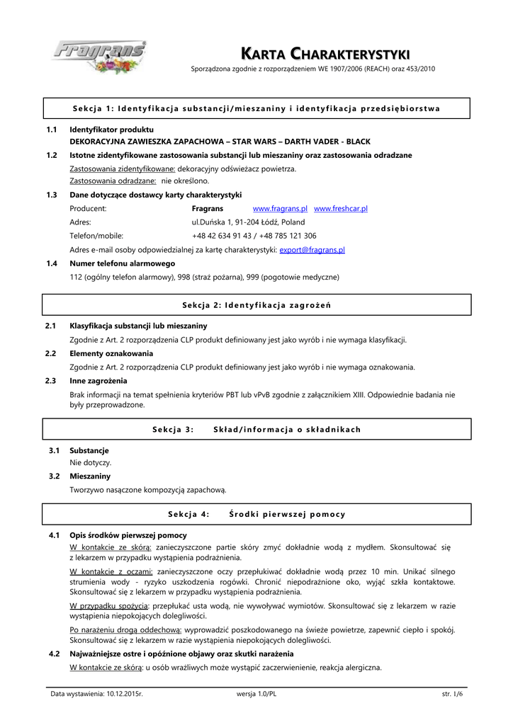 KARTA CHARAKTERYSTYKI Sporządzona zgodnie z rozporządzeniem WE 1907/2006 (REACH) oraz 453/2010 Sekcja 1: Identyfikacja substancji/mieszaniny i identyfikacja przedsiębiorstwa 1.1 Identyfikator produktu DEKORACYJNA ZAWIESZKA ZAPACHOWA – STAR WARS – DARTH VADER - BLACK 1.2 Istotne zidentyfikowane zastosowania substancji lub mieszaniny oraz zastosowania odradzane Zastosowania zidentyfikowane: dekoracyjny odświeżacz powietrza. Zastosowania odradzane: nie określono. 1.3 Dane dotyczące dostawcy karty charakterystyki Producent: Fragrans www.fragrans.pl www.freshcar.pl Adres: ul.Duńska 1, 91-204 Łódź, Poland Telefon/mobile: +48 42 634 91 43 / +48 785 121 306 Adres e-mail osoby odpowiedzialnej za kartę charakterystyki: [email protected] 1.4 Numer telefonu alarmowego 112 (ogólny telefon alarmowy), 998 (straż pożarna), 999 (pogotowie medyczne) Sekcja 2: I d e n t y f i k a c j a z a g r o ż e ń 2.1 Klasyfikacja substancji lub mieszaniny Zgodnie z Art. 2 rozporządzenia CLP produkt definiowany jest jako wyrób i nie wymaga klasyfikacji. 2.2 Elementy oznakowania Zgodnie z Art. 2 rozporządzenia CLP produkt definiowany jest jako wyrób i nie wymaga oznakowania. 2.3 Inne zagrożenia Brak informacji na temat spełnienia kryteriów PBT lub vPvB zgodnie z załącznikiem XIII. Odpowiednie badania nie były przeprowadzone. Sekcja 3: 3.1 Skład/informacja o składnikach Substancje Nie dotyczy. 3.2 Mieszaniny Tworzywo nasączone kompozycją zapachową. Sekcja 4: 4.1 Środki pierwszej pomocy Opis środków pierwszej pomocy W kontakcie ze skórą: zanieczyszczone partie skóry zmyć dokładnie wodą z mydłem. Skonsultować się z lekarzem w przypadku wystąpienia podrażnienia. W kontakcie z oczami: zanieczyszczone oczy przepłukiwać dokładnie wodą przez 10 min. Unikać silnego strumienia wody - ryzyko uszkodzenia rogówki. Chronić niepodrażnione oko, wyjąć szkła kontaktowe. Skonsultować się z lekarzem w przypadku wystąpienia podrażnienia. W przypadku spożycia: przepłukać usta wodą, nie wywoływać wymiotów. Skonsultować się z lekarzem w razie wystąpienia niepokojących dolegliwości. Po narażeniu drogą oddechową: wyprowadzić poszkodowanego na świeże powietrze, zapewnić ciepło i spokój. Skonsultować się z lekarzem w razie wystąpienia niepokojących dolegliwości. 4.2 Najważniejsze ostre i opóźnione objawy oraz skutki narażenia W kontakcie ze skórą: u osób wrażliwych może wystąpić zaczerwienienie, reakcja alergiczna. Data wystawienia: 10.12.2015r. wersja 1.0/PL str. 1/6 KARTA CHARAKTERYSTYKI Sporządzona zgodnie z rozporządzeniem WE 1907/2006 (REACH) oraz 453/2010 4.3 Wskazania dotyczące wszelkiej natychmiastowej pomocy lekarskiej i szczególnego postępowania z poszkodowanym Decyzję o sposobie postępowania ratunkowego podejmuje lekarz po dokładnej ocenie stanu poszkodowanego. Sekcja 5: 5.1 Postępowanie w przypadku pożaru Środki gaśnicze Odpowiednie środki gaśnicze: dostosować środki gaśnicze do materiałów magazynowanych w otoczeniu. Niewłaściwe środki gaśnicze: zwarty strumień wody – niebezpieczeństwo rozprzestrzenienia pożaru. 5.2 Szczególne zagrożenia związane z substancją lub mieszaniną Podczas spalania mogą tworzyć się toksyczne spaliny zawierające tlenki węgla. Unikać wdychania produktów spalania, mogą stwarzać zagrożenie dla zdrowia. 5.3 Informacje dla straży pożarnej Środki ochrony ogólnej typowe w przypadku pożaru. Nie należy przebywać w zagrożonej ogniem strefie bez odpowiedniego ubrania odpornego na chemikalia i aparatu do oddychania z niezależnym obiegiem powietrza. Sekcja 6: P o s t ę p ow a n i e w p r z y p a d k u n ie z a m i e r z o n e g o u w o l n ie n i a do ś r od o w is k a 6.1 Indywidualne środki ostrożności, wyposażenie ochronne i procedury w sytuacjach awaryjnych Przestrzegać przepisów prawnych w zakresie ochrony i bezpieczeństwa. Unikać zanieczyszczenia skóry i oczu. Zapewnić odpowiednią wentylację. 6.2 Środki ostrożności w zakresie ochrony środowiska W przypadku uwolnienia większych ilości produktu należy poczynić kroki w celu niedopuszczenia do rozprzestrzenienia się w środowisku naturalnym. Powiadomić odpowiednie służby ratownicze. 6.3 Metody i materiały zapobiegające rozprzestrzenianiu się skażenia i służące do usuwania skażenia Zebrać mechanicznie. Oczyścić zanieczyszczone miejsce. 6.4 Odniesienia do innych sekcji Postępowanie z odpadami produktu – patrz sekcja 13. Sekcja 7: Postępowanie z substancjami i mieszaninami oraz ich magazynowanie 7.1 Środki ostrożności dotyczące bezpiecznego postępowania Pracować zgodnie z zasadami bezpieczeństwa i higieny. Unikać zanieczyszczenia oczu i skóry. Przed przerwą i po zakończeniu pracy umyć ręce. Stosować zgodnie z przeznaczeniem. 7.2 Warunki bezpiecznego magazynowania, łącznie z informacjami dotyczącymi wszelkich wzajemnych niezgodności Przechowywać tylko w oryginalnych, szczelnie zamkniętych opakowaniach. Nie przechowywać razem z artykułami żywnościowymi i paszami dla zwierząt. Unikać bezpośredniego nasłonecznienia. Zalecana temperatura magazynowania: 5-30C. 7.3 Specyficzne zastosowanie(-a) końcowe Dekoracyjny odwieżacz powietrza. Sekcja 8: 8.1 Kontrola narażenia/środki ochrony indywidualnej Parametry dotyczące kontroli Produkt nie zawiera w swoim składzie komponentów dla których określono najwyższe dopuszczalne stężenia w miejscu pracy. Data wystawienia: 10.12.2015r. wersja 1.0/PL str. 2/6 KARTA CHARAKTERYSTYKI Sporządzona zgodnie z rozporządzeniem WE 1907/2006 (REACH) oraz 453/2010 8.2. Kontrola narażenia Przestrzegać ogólnych zasad bezpieczeństwa i higieny. Podczas pracy nie jeść, nie pić i nie palić tytoniu. Przed przerwą i po zakończeniu pracy dokładnie umyć ręce. Ochrona rąk i ciała Nie jest wymagana. Ochrona oczu Nie jest wymagana. Ochrona dróg oddechowych Nie jest wymagana. Kontrola narażenia środowiska Nie należy dopu