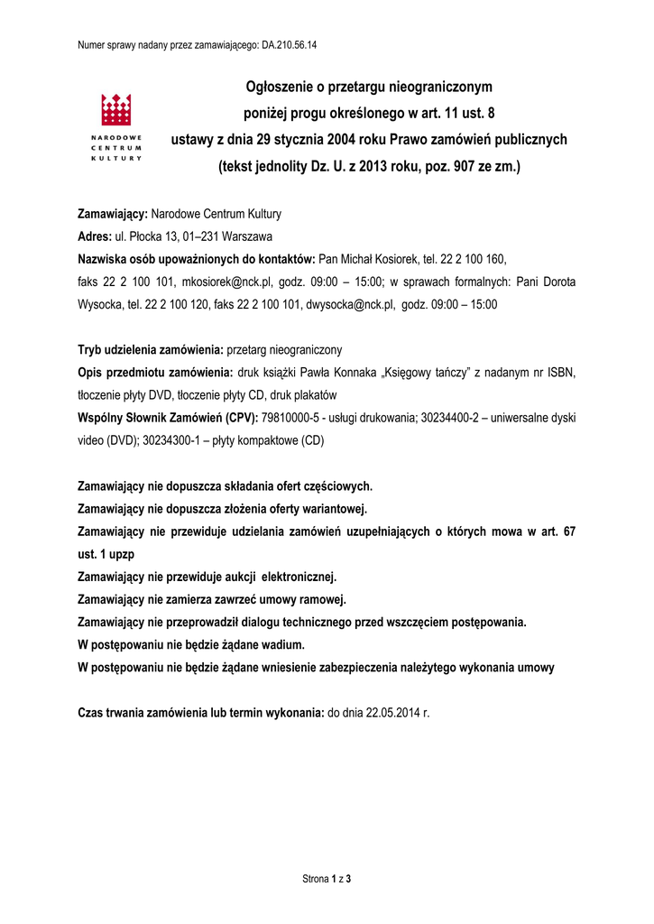 Numer sprawy nadany przez zamawiającego: DA.210.56.14 Ogłoszenie o przetargu nieograniczonym poniżej progu określonego w art. 11 ust. 8 ustawy z dnia 29 stycznia 2004 roku Prawo zamówień publicznych (tekst jednolity Dz. U. z 2013 roku, poz. 907 ze zm.) Zamawiający: Narodowe Centrum Kultury Adres: ul. Płocka 13, 01–231 Warszawa Nazwiska osób upoważnionych do kontaktów: Pan Michał Kosiorek, tel. 22 2 100 160, faks 22 2 100 101, [email protected], godz. 09:00 – 15:00; w sprawach formalnych: Pani Dorota Wysocka, tel. 22 2 100 120, faks 22 2 100 101, [email protected], godz. 09:00 – 15:00 Tryb udzielenia zamówienia: przetarg nieograniczony Opis przedmiotu zamówienia: druk książki Pawła Konnaka „Księgowy tańczy” z nadanym nr ISBN, tłoczenie płyty DVD, tłoczenie płyty CD, druk plakatów Wspólny Słownik Zamówień (CPV): 79810000-5 - usługi drukowania; 30234400-2 – uniwersalne dyski video (DVD); 30234300-1 – płyty kompaktowe (CD) Zamawiający nie dopuszcza składania ofert częściowych. Zamawiający nie dopuszcza złożenia oferty wariantowej. Zamawiający nie przewiduje udzielania zamówień uzupełniających o których mowa w art. 67 ust. 1 upzp Zamawiający nie przewiduje aukcji elektronicznej. Zamawiający nie zamierza zawrzeć umowy ramowej. Zamawiający nie przeprowadził dialogu technicznego przed wszczęciem postępowania. W postępowaniu nie będzie żądane wadium. W postępowaniu nie będzie żądane wniesienie zabezpieczenia należytego wykonania umowy Czas trwania zamówienia lub termin wykonania: do dnia 22.05.2014 r. Strona 1 z 3 Numer sprawy nadany przez zamawiającego: DA.210.56.14 Wymagania od Wykonawców: O zamówienie mogą ubiegać się Wykonawcy, którzy spełniają warunki dotyczące: 1. posiadania uprawnień do wykonywania określonej działalności lub czynności, jeżeli przepisy prawa nakładają obowiązek ich posiadania; 2. posiadania wiedzy i doświadczenia, tj. wykonanie - w okresie ostatnich 3 lat przed upływem terminu składania ofert, a jeżeli okres prowadzenia działalności jest krótszy to w tym okresie – co najmniej 3 usług polegających na druku książek o wartości co najmniej 30 000,00 zł brutto każde, 3. dysponowania odpowiednim potencjałem technicznym oraz osobami zdolnymi do wykonania zamówienia, 4. sytuacji ekonomicznej i finansowej; Opis sposobu dokonania oceny spełniania warunków udziału w postępowaniu Ocena spełniania warunków udziału w postępowaniu zostanie dokonana na podstawie dokumentów złożonych przez Wykonawcę oraz Oświadczeń stanowiących załączniki do Specyfikacji Istotnych Warunków Zamówienia. Ocena spełniania warunków udziału w postępowaniu zostanie dokonana metodą: spełnia – nie spełnia. Kryteria oceny ofert: Kryterium Znaczenie Cena za druk książki Pawła Konnaka „Księgowy tańczy” z nadanym nr ISBN, tłoczenie płyty DVD, tłoczenie płyty CD, druk plakatów 100 % Termin i miejsce składania ofert: do godziny 10:00 w dniu 24.04.2014 r., Narodowe Centrum Kultury, ul. Płocka 13, 01–231 Warszawa, recepcja. Termin związania z ofertą: 30 dni, licząc od upływu terminu składania ofert. Strona 2 z 3 Numer sprawy nadany przez zamawiającego: DA.210.56.14 Określenie sposobu uzyskania specyfikacji istotnych warunków zamówienia oraz adres strony internetowej, na której została zamieszczona Specyfikacja Istotnych Warunków Zamówienia: 1. Specyfikacja Istotnych Warunków Zamówienia jest dostępna w siedzibie Zamawiającego w Narodowym Centrum Kultury 2. Specyfikacja Istotnych Warunków Zamówienia została zamieszczona na stronie internetowej Zamawiającego http://www.nck.pl/kategorie/przetargi.html Data wywieszenia: 16.04.2014 r. Kazimierz Monkiewicz Zastępca Dyrektora Narodowego Centrum Kultury Strona 3 z 3