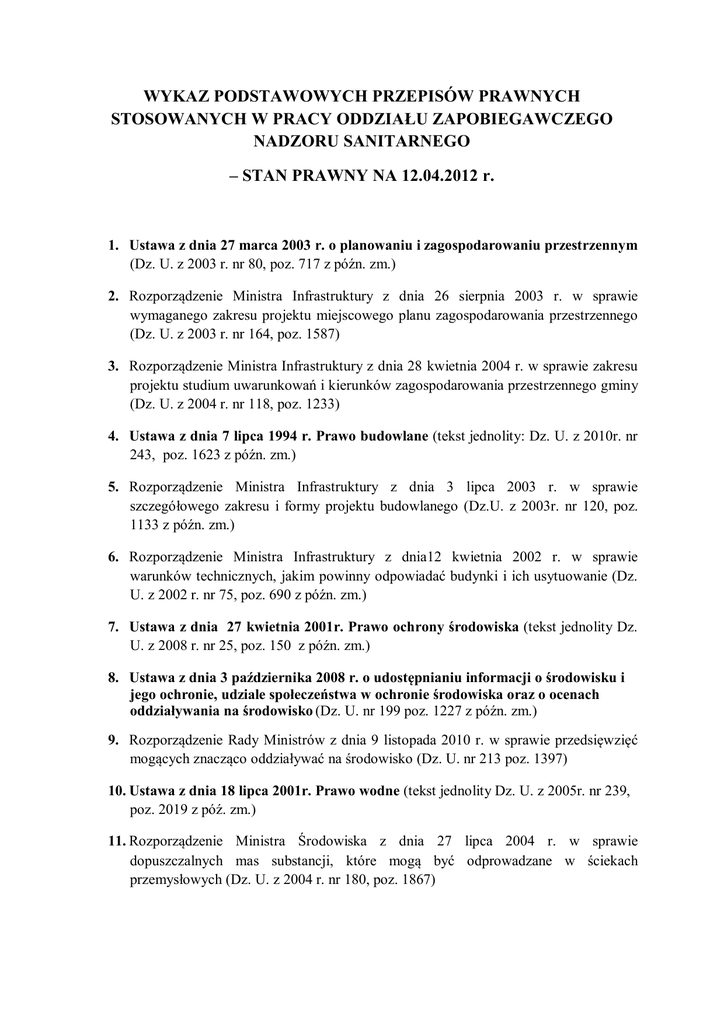 WYKAZ PODSTAWOWYCH PRZEPISÓW PRAWNYCH STOSOWANYCH W PRACY ODDZIAŁU ZAPOBIEGAWCZEGO NADZORU SANITARNEGO – STAN PRAWNY NA 12.04.2012 r. 1. Ustawa z dnia 27 marca 2003 r. o planowaniu i zagospodarowaniu przestrzennym (Dz. U. z 2003 r. nr 80, poz. 717 z późn. zm.) 2. Rozporządzenie Ministra Infrastruktury z dnia 26 sierpnia 2003 r. w sprawie wymaganego zakresu projektu miejscowego planu zagospodarowania przestrzennego (Dz. U. z 2003 r. nr 164, poz. 1587) 3. Rozporządzenie Ministra Infrastruktury z dnia 28 kwietnia 2004 r. w sprawie zakresu projektu studium uwarunkowań i kierunków zagospodarowania przestrzennego gminy (Dz. U. z 2004 r. nr 118, poz. 1233) 4. Ustawa z dnia 7 lipca 1994 r. Prawo budowlane (tekst jednolity: Dz. U. z 2010r. nr 243, poz. 1623 z późn. zm.) 5. Rozporządzenie Ministra Infrastruktury z dnia 3 lipca 2003 r. w sprawie szczegółowego zakresu i formy projektu budowlanego (Dz.U. z 2003r. nr 120, poz. 1133 z późn. zm.) 6. Rozporządzenie Ministra Infrastruktury z dnia12 kwietnia 2002 r. w sprawie warunków technicznych, jakim powinny odpowiadać budynki i ich usytuowanie (Dz. U. z 2002 r. nr 75, poz. 690 z późn. zm.) 7. Ustawa z dnia 27 kwietnia 2001r. Prawo ochrony środowiska (tekst jednolity Dz. U. z 2008 r. nr 25, poz. 150 z późn. zm.) 8. Ustawa z dnia 3 października 2008 r. o udostępnianiu informacji o środowisku i jego ochronie, udziale społeczeństwa w ochronie środowiska oraz o ocenach oddziaływania na środowisko (Dz. U. nr 199 poz. 1227 z późn. zm.) 9. Rozporządzenie Rady Ministrów z dnia 9 listopada 2010 r. w sprawie przedsięwzięć mogących znacząco oddziaływać na środowisko (Dz. U. nr 213 poz. 1397) 10. Ustawa z dnia 18 lipca 2001r. Prawo wodne (tekst jednolity Dz. U. z 2005r. nr 239, poz. 2019 z póź. zm.) 11. Rozporządzenie Ministra Środowiska z dnia 27 lipca 2004 r. w sprawie dopuszczalnych mas substancji, które mogą być odprowadzane w ściekach przemysłowych (Dz. U. z 2004 r. nr 180, poz. 1867) 12. Rozporządzenie Ministra Środowiska z dnia 24 lipca 2006 r. w sprawie warunków, jakie należy spełnić przy wprowadzaniu ścieków do wód lub do ziemi, oraz w sprawie substancji szczególnie szkodliwych dla środowiska wodnego (Dz. U. z 2006 r. nr 137, poz. 984 z późn. zm.) 13. Rozporządzenie Ministra Środowiska z dnia 10 listopada 2005 r. w sprawie substancji szczególnie szkodliwych dla środowiska wodnego, których wprowadzanie w ściekach przemysłowych do urządzeń kanalizacyjnych wymaga uzyskania pozwolenia wodno prawnego (Dz. U. z 2005 r. nr 233, poz. 1988 z późn. zm.) 14. Ustawa z dnia 27 kwietnia 2001 r. o odpadach (tekst jednolity Dz. U. z 2007 r. nr 39 poz. 251 z późn. zm.) 15. Ustawa z dnia 13 września 1996 r. o utrzymaniu czystości i porządku w gminach (tekst jednolity: Dz. U. z 2005 r. nr 236 poz. 2008 z późn. zm.) 16. Ustawa z dnia 31 stycznia 1959 r. o cmentarzach i chowaniu zmarłych (tekst jednolity: Dz. U. z 2000 r. nr 23, poz. 295 z późn. zm.) 17. Rozporządzenie Ministra Gospodarki Komunalnej z dnia 25 sierpnia 1959 r. w sprawie określenia, jakie tereny pod względem sanitarnym są odpowiednie na cmentarze (Dz. U. z 1959 r. nr 52, poz. 315) 18. Rozporządzenie Ministra Zdrowia z dnia 23 marca 2011 r. w sprawie sposobu przechowywania zwłok i szczątków (Dz. U. nr 75 poz. 405) 19. Ustawa z dnia 6 września 2001 r. Prawo farmaceutyczne (tekst jednolity: Dz. U. z 2008 r. nr 45, poz. 271 z późn. zm.) 20. Rozporządzenie Ministra Zdrowia z dnia 30 września 2002 r. w sprawie szczegółowych wymogów, jakim powinien odpowiadać lokal apteki (Dz. U. z 2002 r. nr 171, poz. 1395) 21. Rozporządzenie Ministra Zdrowia z dnia 18 października 2002 r. w sprawie podstawowych warunków prowadzenia apteki (Dz. U. z 2002r. nr 187, poz. 1565) 22. Rozporządzenie Ministra Zdrowia z dnia 26 września 2002 r. w sprawie danych wymaganych w opisie technicznym lokalu przeznaczonego na aptekę ogólnodostępną (Dz. U. z 2002 r. nr 161, poz. 1337) 23. Rozporządzenie Ministra Zdrowia z dnia 26 września 2002 r. w sprawie wykazu pomieszczeń wchodzących w skład powierzchni podstawowej i pomocniczej apteki (Dz. U. z 2002 r. nr 161, poz. 1338) 24. Rozporządzenie Ministra Zdrowia z dnia 2 lutego 2009r. w sprawie kwalifikacji osób wydających produkty lecznicze w placówkach obrotu pozaaptecznego, a także wymogów, jakim powinien odpowiadać lokal i wyposażenie tych placówek oraz punktów aptecznych (Dz. U. nr 21 poz. 118) 25. Rozporządzenie Ministra Zdrowia z dnia 26 lipca 2002 r. w sprawie procedur Dobrej Praktyki Dystrybucyjnej (Dz. U. z 2002 r. nr 144, poz. 1216) 26. Ustawa z dnia 29 sierpnia 1997 r. o usługach turystycznych (tekst jednolity: Dz. U. z 2004 r. nr 223, poz. 2268 z późn. zm.) 27. Rozporządzenie Ministra Gospodarki i Pracy z dnia 19 sierpnia 2004 r. w sprawie obiektów hotelarskich i innych obiektów, w których są świadczone usługi hotelarskie (jednolity tekst Dz. U. z 2006 r. nr 22, poz. 169 z późn. zm.) 28. Ustawa z dnia 12 marca 2004 r. o pomocy społecznej (jednolity tekst Dz. U. z 2009 r. nr 175, poz. 1362 z późn. zm.) 29. Rozporządzenie Ministra Pracy i Polityki Społecznej z dnia 19 października 2005 r. w sprawie domów pomocy społecznej (Dz.U. z 2005r. nr 217, poz. 1837 ) 30. Rozporządzenie Ministra Polityki Społecznej z dnia 19 października 2007 r. w sprawie placówek opiekuńczo-wychowawczych (Dz. U. z 2007 r. nr 201, poz. 1455) 31. Rozporządzenie Ministra Gospodarki z dnia 27 kwietnia 2000 r. w sprawie bezpieczeństwa i higieny pracy w pralniach i farbiarniach (Dz. U. z 2000 r. nr 40, poz. 469) 32. Rozporządzenie (WE) nr 852/2004 Parlamentu Europejskiego i Rady z dnia 29 kwietnia 2004 r. w sprawie higieny środków spożywczych (Dz.UE.L.04.139.1 późn. zm.) 33. Ustawa z dnia 25 sierpnia 2006 r. o bezpieczeństwie żywności i żywienia (jednolity tekst Dz. U. z 2010r. nr 136, poz. 914 z późn.zm.) 34. Ustawa z dnia 26 czerwca 1974 r. Kodeks Pracy (je