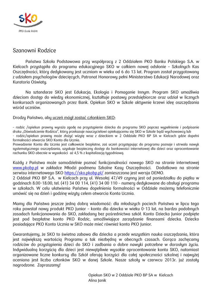 Szanowni Rodzice Państwa Szkoła Podstawowa przy współpracy z 2 Oddziałem PKO Banku Polskiego S.A. w Kielcach przystąpiła do programu edukacyjnego SKO w całkiem nowej odsłonie – Szkolnych Kas Oszczędności, który dedykowany jest uczniom w wieku od 6 do 13 lat. Program został przygotowany z udziałem psychologów dziecięcych, Patronat Honorowy pełni Ministerstwo Edukacji Narodowej oraz Kuratoria Oświaty. Na sztandarze SKO jest Edukacja, Ekologia i Pomaganie Innym. Program SKO umożliwia dzieciom dostęp do wiedzy ekonomicznej, kształtuje postawy przedsiębiorcze oraz udział w licznych konkursach organizowanych przez Bank. Opiekun SKO w Szkole aktywnie krzewi ideę oszczędzania wśród uczniów. Drodzy Państwo, aby uczeń mógł zostać członkiem SKO: – rodzic /opiekun prawny wyraża zgodę na przystąpienie dziecka do programu SKO poprzez wypełnienie i podpisanie druku „Oświadczenie Rodzica”, który przekazuje nauczycielowi opiekującemu się SKO w Szkole bądź wychowawcy lub - rodzic/opiekun prawny może złożyć wizytę wraz z dzieckiem w 2 Oddziale PKO BP SA w Kielcach gdzie dopełni formalności otwarcia SKO Konto dla Ucznia. Prowadzenie Konta dla Ucznia jest całkowicie bezpłatne, zaś uczeń przystępując do programu poznaje i utrwala nawyk systematycznego oszczędzania, uzyskuje bezpieczny dostęp do bankowości internetowej dla dzieci oraz oprocentowanie rachunku SKO obecnie w wysokości aż 4,5 % z kapitalizacją tygodniową. Każdy z Państwa może samodzielnie poznać funkcjonalności nowego SKO na stronie internetowej www.pkobp.pl w zakładce Młodzi podmenu Szkolne Kasy Oszczędności. Dodatkowo na stronie serwisu internetowego SKO https://sko.pkobp.pl/ zamieszczona jest wersja DEMO. 2 Oddział PKO BP S.A. w Kielcach przy ul. Wesołej 47/49 czynny jest od poniedziałku do piątku w godzinach 8.00-18.00, tel. (41) 34 00 114, (41) 34 00 110 – numery dedykowane do obsługi programu w szkołach. W celu ułatwienia Państwu dopełnienia formalności w Oddziale możemy telefonicznie umówić się na dzień i godzinę wizyty celem otwarcia Konta Ucznia. Mamy dla Państwa jeszcze jedną dobrą wiadomość: dla młodszych pociech Państwa w lipcu tego roku powstał nowy produkt PKO Junior – konto dla dziecka w wieku 0-13 lat, na bardzo podobnych zasadach funkcjonowania do SKO, zakładany bez pośrednictwa szkół. Konto Dziecka Junior podpięte jest pod bezpłatne konto PKO Rodzic, umożliwiające zarządzanie finansami dziecka. Dziecko posiadające PKO Konto Ucznia w SKO może mieć również konto PKO Junior. Gwarantujemy, że SKO to świetna zabawa dla dziecka a przede wszystkim nauka oszczędzania, która jest największą wartością Programu a tak niezbędną w obecnych czasach. Gorąco zachęcamy rodziców do przystąpienia dzieci do SKO i zadbania o dobre nawyki potrzebne w dorosłym życiu. Indywidualną korzyścią dla dzieci jest niewątpliwie wysokie oprocentowanie konta SKO, natomiast organizowane liczne konkursy dla Szkół oferują korzyści dla całej społeczności szkolnej i najwyżej oceniana jest liczba członków SKO w danej Szkole. Nasze szkoły w czerwcu 2013r. już zostały nagrodzone. Zapraszamy! Opiekun SKO w 2 Oddziale PKO BP SA w Kielcach Alina Janik