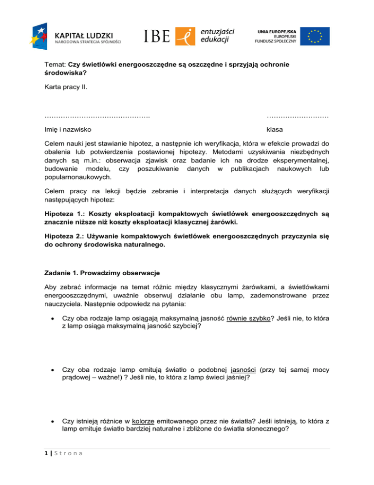 Temat: Czy świetlówki energooszczędne są oszczędne i sprzyjają ochronie środowiska? Karta pracy II. ………………………………………. ……………………… Imię i nazwisko klasa Celem nauki jest stawianie hipotez, a następnie ich weryfikacja, która w efekcie prowadzi do obalenia lub potwierdzenia postawionej hipotezy. Metodami uzyskiwania niezbędnych danych są m.in.: obserwacja zjawisk oraz badanie ich na drodze eksperymentalnej, budowanie modelu, czy poszukiwanie danych w publikacjach naukowych lub popularnonaukowych. Celem pracy na lekcji będzie zebranie i interpretacja danych służących weryfikacji następujących hipotez: Hipoteza 1.: Koszty eksploatacji kompaktowych świetlówek energooszczędnych są znacznie niższe niż koszty eksploatacji klasycznej żarówki. Hipoteza 2.: Używanie kompaktowych świetlówek energooszczędnych przyczynia się do ochrony środowiska naturalnego. Zadanie 1. Prowadzimy obserwacje Aby zebrać informacje na temat różnic między klasycznymi żarówkami, a świetlówkami energooszczędnymi, uważnie obserwuj działanie obu lamp, zademonstrowane przez nauczyciela. Następnie odpowiedz na pytania: Czy oba rodzaje lamp osiągają maksymalną jasność równie szybko? Jeśli nie, to która z lamp osiąga maksymalną jasność szybciej? Czy oba rodzaje lamp emitują światło o podobnej jasności (przy tej samej mocy prądowej – ważne!) ? Jeśli nie, to która z lamp świeci jaśniej? Czy istnieją różnice w kolorze emitowanego przez nie światła? Jeśli istnieją, to która z lamp emituje światło bardziej naturalne i zbliżone do światła słonecznego? 1|Strona Zadanie 2. Zbieramy opinie i fakty W nauce istotnym źródłem wiedzy są również publikacje, wykłady, prezentacje, opinie ekspertów, itd. Nie zawsze jednak te źródła wiedzy są wiarygodne. Ważna jest zatem umiejętność krytycznej oceny wniosków oraz umiejętność odróżniania opinii od faktów. Po zapoznaniu się z materiałami zaprezentowanymi na lekcji (wykład, filmy), wypełnij tabelę: Uwaga: jeśli w dwóch różnych źródłach znajdziesz sprzeczne informacje, podaj obie odpowiedzi wraz z ich źródłami. Tak Nie Źródło informacji Problem Czy widma żarówki światła słonecznego, klasycznej i świetlówki są takie same? Czy świetlówki energooszczędne zawierają jakąś szkodliwą dla środowiska naturalnego substancję? Czy świetlówka energooszczędna przekształca całą pobraną energię elektryczną w światło? Czy w każdym przypadku koszty eksploatacji świetlówki energooszczędnej są niższe niż koszty eksploatacji klasycznej żarówki? Czy świetlówki energooszczędne nadają się do wszystkich zastosowań, do których używane są klasyczne żarówki? Zadanie 3. Weryfikujemy dane i opinie a) Częsta jest opinia, że świetlówka energooszczędna przekształca całą energię elektryczną w światło, natomiast energia klasycznej żarówki zostaje „zmarnowana” na ciepło. Zweryfikuj to stwierdzenie na drodze doświadczalnej: 1. Umieść końcówkę termometru w odległości około 1 cm od bańki klasycznej żarówki. 2. Końcówkę drugiego termometru umieść w takiej samej odległości od bańki świetlówki energooszczędnej. 3. Zapisz temperaturę początkową na obu termometrach (będzie to temperatura pokojowa). 4. Włącz obie lampy. 2|Strona 5. Sprawdź, czy powietrze wokół obu lamp nagrzewa się. Wskazania termometru przy żarówce będą w większym stopniu wynikiem promieniowania niż temperatury powietrza. 6. Zanotuj, jaką temperaturę wskazują termometry po 10 minutach od włączenia lamp. 7. Czy tylko klasyczna żarówka przekształca część energii elektrycznej na ciepło? 8. Czy energia ta naprawdę zostaje zmarnowana? Czym ona jest dla nas i co będzie, jak się jej pozbędziemy? Zanotuj obserwacje oraz wnioski: b) Charakterystyczną cechą świetlówki energooszczędnej jest fakt, że maksymalną intensywność świecenia osiąga w temperaturze pokojowej, czyli w zakresie około 0– C. Zarówno poniżej, jak i powyżej tych temperatur jasność świetlówki gwałtownie spada (przy stałym poborze mocy z sieci, a więc stałych kosztach eksploatacji)1. Problem ten nie istnieje w przypadku klasycznej żarówki, dla której intensywność świecenia praktycznie nie zależy od temperatury otoczenia. W jakich zatem miejscach i warunkach świetlówka energooszczędna jest najbardziej wydajna, a w jakich nie? Odpowiedź uzasadnij. Przygotuj się do zaprezentowania klasie wyników i wniosków z Zadania 3. 1 Andrzej Gawryluk, „Nowoczesne zapłonniki elektroniczne”, Elektronika praktyczna, / 009. 3|Strona Zadanie 4. Wyciągamy wnioski W celu zweryfikowania postawionych hipotez, zbierz możliwie dużo danych, wypełniając poniższą tabelę. Wykorzystaj zarówno zaprezentowane na lekcji materiały źródłowe, dane wynikające z Zadania 3., jak i wnioski przedstawione przez inne zespoły. Hipoteza 1. Koszty eksploatacji Hipoteza 2. Używanie świetlówek świetlówek energooszczędnych są energooszczędnych przyczynia się znacznie niższe niż koszty do ochrony środowiska naturalnego. eksploatacji klasycznej żarówki. Dane potwierdzające hipotezę Dane zaprzeczające hipotezie 4|Strona Po uwzględnieniu wszystkich faktów sformułuj ostateczne wnioski wynikające z zajęć, będące odpowiedzią na pytanie: „Czy świetlówki energooszczędne są oszczędne i sprzyjają ochronie środowiska?”. Wniosek 1.: Wniosek 2.: 5|Strona