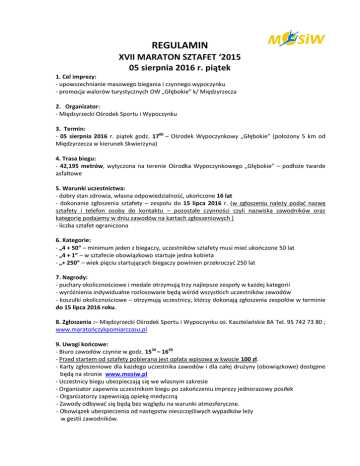 REGULAMIN XVII MARATON SZTAFET ‘2015 05 sierpnia 2016 r. piątek 1. Cel imprezy: - upowszechnianie masowego biegania i czynnego wypoczynku - promocja walorów turystycznych OW „Głębokie” k/ Międzyrzecza 2. Organizator: - Międzyrzecki Ośrodek Sportu i Wypoczynku 3. Termin: - 05 sierpnia 2016 r. piątek godz. 1700 – Ośrodek Wypoczynkowy „Głębokie” (położony 5 km od Międzyrzecza w kierunek Skwierzyna) 4. Trasa biegu: - 42,195 metrów, wytyczona na terenie Ośrodka Wypoczynkowego „Głębokie” – podłoże twarde asfaltowe 5. Warunki uczestnictwa: - dobry stan zdrowia, własna odpowiedzialność, ukończone 16 lat - dokonanie zgłoszenia sztafety – zespołu do 15 lipca 2016 r. (w zgłoszeniu należy podać nazwę sztafety i telefon osoby do kontaktu – pozostałe czynności czyli nazwiska zawodników oraz kategorię podajemy w dniu zawodów na kartach zgłoszeniowych ) - liczba sztafet ograniczona 6. Kategorie: - „4 + 50” – minimum jeden z biegaczy, uczestników sztafety musi mieć ukończone 50 lat - „4 + 1” – w sztafecie obowiązkowo startuje jedna kobieta - „+ 250” – wiek pięciu startujących biegaczy powinien przekroczyć 250 lat 7. Nagrody: - puchary okolicznościowe i medale otrzymują trzy najlepsze zespoły w każdej kategorii - wyróżnienia indywidualne rozlosowane będą wśród wszystkich uczestników zawodów - koszulki okolicznościowe – otrzymują uczestnicy, którzy dokonają zgłoszenia zespołów w terminie do 15 lipca 2016 roku. 8. Zgłoszenia :– Międzyrzecki Ośrodek Sportu i Wypoczynku os. Kasztelańskie 8A Tel. 95 742 73 80 ; www.maratończykpomiarczasu.pl 9. Uwagi końcowe: - Biuro zawodów czynne w godz. 1530 – 1650 - Przed startem od sztafety pobierana jest opłata wpisowa w kwocie 100 zł. - Karty zgłoszeniowe dla każdego uczestnika zawodów i dla całej drużyny (obowiązkowe) dostępne będą na stronie www.mosiw.pl - Uczestnicy biegu ubezpieczają się we własnym zakresie - Organizator zapewnia uczestnikom biegu po zakończeniu imprezy jednorazowy posiłek - Organizatorzy zapewniają opiekę medyczną - Zawody odbywać się będą bez względu na warunki atmosferyczne. - Obowiązek ubezpieczenia od następstw nieszczęśliwych wypadków leży w gestii zawodników. - Organizatorzy nie odpowiadają za rzeczy pozostawione bez opieki. - Uczestnik startuje wyłącznie na własną odpowiedzialność i ponosi związane z tym ryzyko. Wszyscy Uczestnicy przyjmują do wiadomości, że udział w Biegu wiąże się z wysiłkiem fizycznym i pociąga za sobą naturalne ryzyko i zagrożenie wypadkami, możliwość odniesienia obrażeń ciała i urazów fizycznych (w tym śmierci). Przekazanie Organizatorowi prawidłowo wypełnionego Formularza Rejestracyjnego oraz dokonanie Opłaty Rejestracyjnej oznacza, że Uczestnik rozważył i ocenił charakter, zakres i stopień ryzyka wiążącego się z uczestnictwem w Biegu i dobrowolnie zdecydował się podjąć to ryzyko, startując w Biegu wyłącznie na własną odpowiedzialność. -Uczestnik posiada aktualne badania lekarskie dopuszczające do startu w biegu lub podpisze własnoręcznie oświadczenie o braku przeciwwskazań do udziału w biegu. - Organizator zaleca uczestnikom wykonanie profilaktycznych badań lekarskich mogących potwierdzić brak przeciwwskazań do udziału w biegu; - Podczas biegu wszyscy zawodnicy muszą posiadać: - Numery startowe przymocowane do koszulek na piersiach. Pod karą dyskwalifikacji niedopuszczalne jest zasłanianie numeru startowego w części lub w całości. - Prawo interpretacji niniejszego regulaminu przysługuje organizatorom - Parkowanie pojazdów w dniu zawodów na terenie ośrodka OW „Głębokie” - bezpłatne - Organizator zastrzega sobie prawo interpretacji oraz do zmian w powyższym regulaminie, które zostaną przedstawione uczestnikom najpóźniej w dniu zawodów *Maraton Sztafet: - rozgrywany jest na pętli zamkniętej wytyczonej na terenie ośrodka liczącej 1,215 metrów, którą każdy startujący zespół musi pokonać 34 razy *w fazie początkowej rywalizacji każdy uczestnik sztafety obowiązkowo pokonuje dystans – 5 km. tj. 4 okrążenia, jedynie zawodnik rozpoczynający zawody ma do pokonania dystans dłuższy, czyli 5,745 metrów jest to wyrównanie dla uzyskania pełnej długości maratonu tj. – 42,195 metrów *w drugiej fazie organizator zezwala na dowolność w dokonywaniu zmian, ale zawodnik kontynuujący bieg nie może pokonywać dystansu krótszego niż 2 pełne okrążenia *wszystkie zmiany następują w kolejności uzgodnionej z sędzią głównym zawodów i w miejscu do tego wyznaczonym *zgłoszenie zmian i uwag z sędzią głównym zawodów dokonuje kapitan zespołu lub osoba do tego upoważniona *Warunkiem zaliczenia startu i sklasyfikowania sztafety jest: - przebiegnięcie przez sztafetę dystansu 42,195 m. w sportowej rywalizacji – zgodnie z zasadami fair paly - pokonanie przez każdego z uczestników zawodów minimum ~ 5 kilometrów = 4 pełne okrążenia *Każdego zawodnika obowiązuje numer startowy przydzielony przez kierownika zawodów, który po zakończeniu imprezy należy zwrócić organizatorowi – jest to obowiązek kapitana/kierownika zespołu. UWAGA ! – w przypadku nie respektowania uwag i zaleceń zarówno sędziego głównego, jak i organizatora zawodów – sztafeta zostanie zdyskwalifikowana i wycofana z zawodów bez możliwości zwrotu poniesionych kosztów. ORGANIZATOR