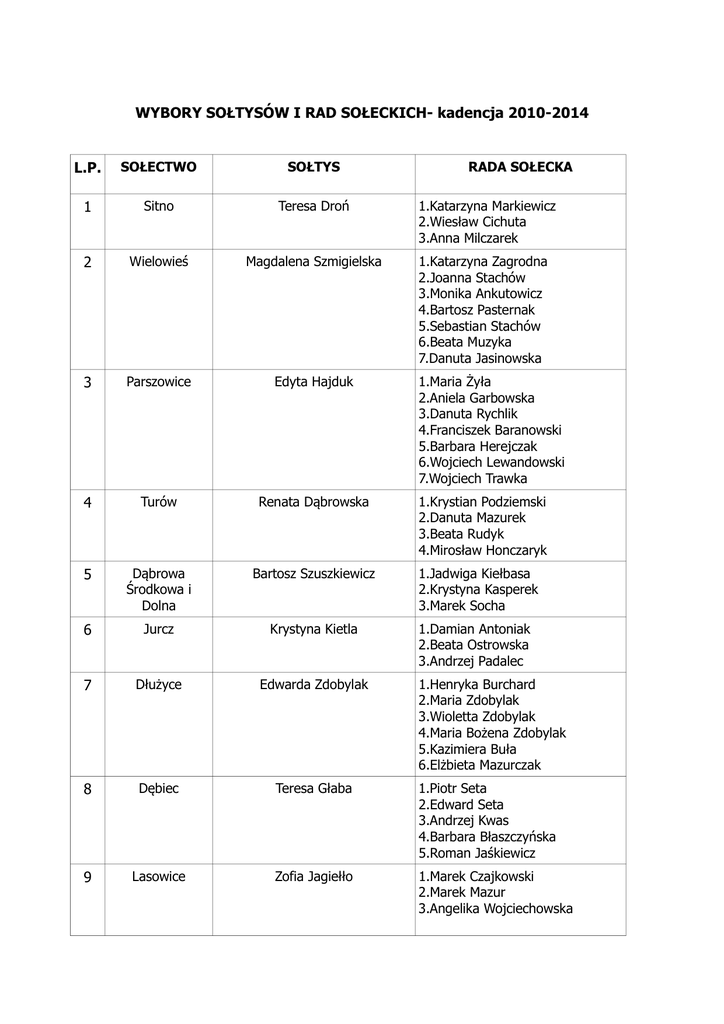 WYBORY SOŁTYSÓW I RAD SOŁECKICH- kadencja 2010-2014 L.P. SOŁECTWO SOŁTYS RADA SOŁECKA 1 Sitno Teresa Droń 2 Wielowieś Magdalena Szmigielska 3 Parszowice Edyta Hajduk 4 Turów Renata Dąbrowska 5 Dąbrowa Środkowa i Dolna Bartosz Szuszkiewicz 1.Jadwiga Kiełbasa 2.Krystyna Kasperek 3.Marek Socha 6 Jurcz Krystyna Kietla 1.Damian Antoniak 2.Beata Ostrowska 3.Andrzej Padalec 7 Dłużyce Edwarda Zdobylak 8 Dębiec Teresa Głaba 1.Piotr Seta 2.Edward Seta 3.Andrzej Kwas 4.Barbara Błaszczyńska 5.Roman Jaśkiewicz 9 Lasowice Zofia Jagiełło 1.Marek Czajkowski 2.Marek Mazur 3.Angelika Wojciechowska 1.Katarzyna Markiewicz 2.Wiesław Cichuta 3.Anna Milczarek 1.Katarzyna Zagrodna 2.Joanna Stachów 3.Monika Ankutowicz 4.Bartosz Pasternak 5.Sebastian Stachów 6.Beata Muzyka 7.Danuta Jasinowska 1.Maria Żyła 2.Aniela Garbowska 3.Danuta Rychlik 4.Franciszek Baranowski 5.Barbara Herejczak 6.Wojciech Lewandowski 7.Wojciech Trawka 1.Krystian Podziemski 2.Danuta Mazurek 3.Beata Rudyk 4.Mirosław Honczaryk 1.Henryka Burchard 2.Maria Zdobylak 3.Wioletta Zdobylak 4.Maria Bożena Zdobylak 5.Kazimiera Buła 6.Elżbieta Mazurczak 10 Przychowa Czesław Jastrzębski 1.Łukasz Sośnicki 2.Piotr Fydryk 3.Agnieszka Hromiak 4.Ryszard Ogrodniczak 5.Józef Kulik 6.Stanisław Hawryluk 7.Sylwia Cieślarczyk 11 Buszkowice Jan Śliwa 1.Teresa Omachil 2.Lesław Białowąs 3.Tadeusz Nowakowski 4.Ewa Zygler 5.Tomasz Stasiuk 6.Daniel Omachil 12 Chełmek Wołowski Aneta Pałac 13 Tymowa Halina Chałupa 14 Dziewin Andrzej Sajak 15 Redlice Marcin Myśków 1.Jadwiga Dębicka 2.Anna Legutko 3.Irena Sitarska 4.Emil Myśków 5.Wioletta Bieleń 16 Krzyżowa Janina Makuła 1.Anna Szymańska 2.Bogusława Pawlak 3.Iwona Magoń 4.Małgorzata Chirowska 5.Anna Turczyn 6.Grzegorz Chirowski 7.Renata Winnik 17 Ręszów Maria Gębalska 1.Katarzyna Basińska 2.Zdzisław Gębalski 3.Mariusz Haschke 4.Irena Mrowiec 18 Dziesław Danuta Pawłoszyńska 19 Zaborów Józef Zaleski 1.Alina Śliwińska 2.Dominik Szczerbień 3.Grzegorz Pastuszka 1.Urszula Znamirowska 2.Grzegorz Pacura 3.Gabriela Wróblewska 4.Halina Dudła 5.Paweł Pałac 1.Zuzanna Gambal 2.Agnieszka Wisiecka 3.Justyna Chomont 4.Janina Ściana 5.Kazimierz Kuriata 1.Adam Radliński 2.Justyna Sośnicka 3.Maria Zięba 1. 2. 3. 4. 5. Krystyna Augustyniak Anna Maksym Anna Mańdziak Jacek Ruszlewicz Józef Szebeszowicz