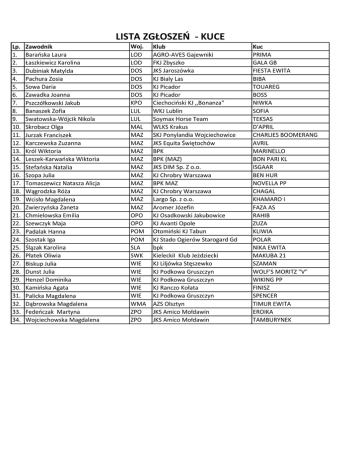 LISTA ZGŁOSZEŃ - KUCE Lp. 1. 2. 3. 4. 5. 6. 7. 8. 9. 10. 11. 12. 13. 14. 15. 16. 17. 18. 19. 20. 21. 22. 23. 24. 25. 26. 27. 28. 29. 30. 31. 32. 33. 34. Zawodnik Baraoska Laura Łaszkiewicz Karolina Dubiniak Matylda Pachura Zosia Sowa Daria Zawadka Joanna Pszczółkowski Jakub Banaszek Zofia Swatowska-Wójcik Nikola Skrobacz Olga Jurzak Franciszek Karczewska Zuzanna Król Wiktoria Leszek-Karwaoska Wiktoria Stefaoska Natalia Szopa Julia Tomaszewicz Natasza Alicja Wągrodzka Róża Wcisło Magdalena Zwierzyoska Żaneta Chmielowska Emilia Szewczyk Maja Padalak Hanna Szostak Iga Ślązak Karolina Płatek Oliwia Biskup Julia Dunst Julia Henzel Dominika Kamioska Agata Palicka Magdalena Dąbrowska Magdalena Fedeoczak Martyna Wojciechowska Magdalena Woj. LOD LOD DOS DOS DOS DOS KPO LUL LUL MAL MAZ MAZ MAZ MAZ MAZ MAZ MAZ MAZ MAZ MAZ OPO OPO POM POM SLA SWK WIE WIE WIE WIE WIE WMA ZPO ZPO Klub AGRO-AVES Gajewniki FKJ Zbyszko JKS Jaroszówka KJ Bialy Las KJ Picador KJ Picador Ciechocioski KJ ,,Bonanza" WKJ Lublin Soymax Horse Team WLKS Krakus SKJ Ponylandia Wojciechowice JKS Equita Świętochów BPK BPK (MAZ) JKS DIM Sp. Z o.o. KJ Chrobry Warszawa BPK MAZ KJ Chrobry Warszawa Largo Sp. z o.o. Aromer Józefin KJ Osadkowski Jakubowice KJ Avanti Opole Otomioski KJ Tabun KJ Stado Ogierów Starogard Gd bpk KieleckiI Klub Jeżdziecki KJ Liljówka Stęszewko KJ Podkowa Gruszczyn KJ Podkowa Gruszczyn KJ Ranczo Kołata KJ Podkowa Gruszczyn AZS Olsztyn JKS Amico Mołdawin JKS Amico Mołdawin Kuc PRIMA GALA GB FIESTA EWITA BIBA TOUAREG BOSS NIWKA SOFIA TEKSAS D'APRIL CHARLIES BOOMERANG AVRIL MARINELLO BON PARI KL ISGAAR BEN HUR NOVELLA PP CHAGAL KHAMARO I FAZA AS RAHIB ZUZA KLIWIA POLAR NIKA EWITA MAKUBA 21 SZAMAN WOLF'S MORITZ "V" WIKING PP FINISZ SPENCER TIMUR EWITA EROIKA TAMBURYNEK LISTA ZGŁOSZEŃ - DUŻE KONIE Lp. 1. 2. 3. 4. 5. 6. 7. 8. 9. 10. 11. 12. 13. 14. 15. 16. 17. 18. 19. 20. 21. 22. 23. 24. 25. 26. 27. 28. 29. 30. 31. 32. 33. 34. 35. 36. Zawodnik Dubiniak Matylda Parkitny Maximilian Wojnowski Hubert Kaniewska Weronika Sumioska Ewa Baraoski Mikołaj Hrabska Ludwika Szlufik Aniela Albrecht Wiktoria Filipowska Olimpia Romankiewicz Hanna Zagdaoska Julia Dzierżak Maja Niewiadomski Kacper Kawa Aleksandra Łyś Karolina Millan Natasza Pyrek Filip Skrobacz Olga Korecka Oliwia Pilkiewicz Krystyna Stefaoska Nicole Czekaj Przemysław Szewczyk Maja Regucka Julia Paulina Kołodziej Golicka Zuzanna Szostak Iga Wrooska Agnieszka Skrzypiec Agata Gardas Dominika Kosmalewicz Maria Kaczmarczyk Maciej Babiak Filip Niewiadomska Oliwia Zybała Aleksandra Woj. DOS DOS DOS KPO KPO LOD LOD LOD LUB LUB LUB LUB LUL LUL MAL MAL MAL MAL MAL MAZ MAZ MAZ OPO OPO PDL PKA POM POM POM SLA WIE WIE WMA ZPO ZPO ZPO Klub JKS Jaroszówka KKJ bpk KJ Dilmar Kobylarnia KJ Młyoska Struga AGRO-AVES Gajewniki JKS Salio Besiekierz Rudny Tuszyoski KJ Garbówek ZKS Drzonków KJ Stajnia Modelewscy Stajnia Modelewscy KJ Stajnia Modelewscy BPK WKJ Lublin KJ Facimiech KJ Facimiech WLKS Krakus bpk WLKS Krakus Stowarzyszenie KS Chojnów JKS Equita Świętochów JKS DIM Sp. z o.o. KJ OKOŁY KJ Avanti Opole KS Nad Wigrami Sp. z o.o. Klub Jeździecki "Leśna Wola" Sopocki Klub Jezdziecki KJ Stado Ogierów Starogard Gd kj la scalla KJK Elizar JKS FER Więckowice JKS FER Więckowice KJ Kaczmarczyk JKS Elcon Szczecin JKS Tornado Szczecin LKS Dragon Nowielice Koń KOLIA EWITA SOPRAN CONTENDROS LIVE BIANCA W BARRICHELLO FALCON BALOU QUANTICO CADOZO GOLDIKA U-COFFI L-KARAT LINETTE BELWEDER PREZYDENT II W OSTIANA MEGI REMEMBER KG ANABELLA GRANDEZA HRABINKA C LAKRO PAPILLON 142 NIKIDAM DU CHATEAU WERBEL ETOS RADON MON CHERIE LADY-S ANCONA MALAJKA WIEDŹMIN EVISTO II FORMOSA ACHILEUS