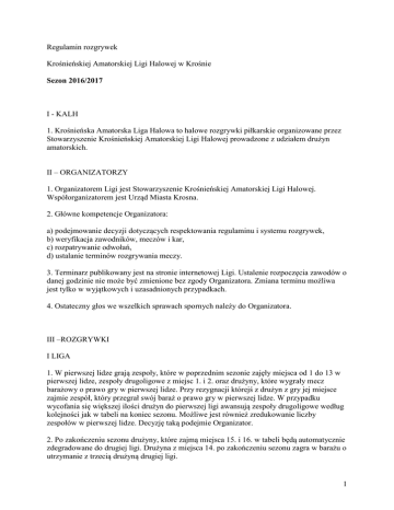 Regulamin rozgrywek Krośnieńskiej Amatorskiej Ligi Halowej w Krośnie Sezon 2016/2017 I - KALH 1. Krośnieńska Amatorska Liga Halowa to halowe rozgrywki piłkarskie organizowane przez Stowarzyszenie Krośnieńskiej Amatorskiej Ligi Halowej prowadzone z udziałem drużyn amatorskich. II – ORGANIZATORZY 1. Organizatorem Ligi jest Stowarzyszenie Krośnieńskiej Amatorskiej Ligi Halowej. Współorganizatorem jest Urząd Miasta Krosna. 2. Główne kompetencje Organizatora: a) podejmowanie decyzji dotyczących respektowania regulaminu i systemu rozgrywek, b) weryfikacja zawodników, meczów i kar, c) rozpatrywanie odwołań, d) ustalanie terminów rozgrywania meczy. 3. Terminarz publikowany jest na stronie internetowej Ligi. Ustalenie rozpoczęcia zawodów o danej godzinie nie może być zmienione bez zgody Organizatora. Zmiana terminu możliwa jest tylko w wyjątkowych i uzasadnionych przypadkach. 4. Ostateczny głos we wszelkich sprawach spornych należy do Organizatora. III –ROZGRYWKI I LIGA 1. W pierwszej lidze grają zespoły, które w poprzednim sezonie zajęły miejsca od 1 do 13 w pierwszej lidze, zespoły drugoligowe z miejsc 1. i 2. oraz drużyny, które wygrały mecz barażowy o prawo gry w pierwszej lidze. Przy rezygnacji którejś z drużyn z gry jej miejsce zajmie zespół, który przegrał swój baraż o prawo gry w pierwszej lidze. W przypadku wycofania się większej ilości drużyn do pierwszej ligi awansują zespoły drugoligowe według kolejności jak w tabeli na koniec sezonu. Możliwe jest również zredukowanie liczby zespołów w pierwszej lidze. Decyzję taką podejmie Organizator. 2. Po zakończeniu sezonu drużyny, które zajmą miejsca 15. i 16. w tabeli będą automatycznie zdegradowane do drugiej ligi. Drużyna z miejsca 14. po zakończeniu sezonu zagra w barażu o utrzymanie z trzecią drużyną drugiej ligi. 1 3. Mistrzostwo ligi zdobędzie drużyna, która zajmie pierwsze miejsce na koniec sezonu. W przypadku gdy dwie drużyny lub więcej zdobędą taką samą liczbę punktów rozegrany zostanie dodatkowy mecz. II LIGA 4. W drugiej lidze zagrają pozostałe zespoły, które w poprzednim sezonie nie uzyskały awansu do pierwszej ligi, te które spadły z pierwszej ligi, nowe zespoły, oraz drużyny zdegradowane przez Organizatora w poprzednim sezonie. 5. Po zakończeniu sezonu drużyny, które zajmą dwa pierwsze miejsca w tabeli automatycznie awansują do pierwszej ligi. Drużyna z trzeciego miejsca po zakończeniu sezonu zagra w barażu o awans do pierwszej ligi. 6. W przypadku karnej degradacji któregoś z zespołów Organizator może w następnym sezonie uzupełnić ligę o kolejny zespół z niższej ligi lub zredukować liczbę drużyn występujących na danym szczeblu rozgrywkowym. OGÓLNE 7. Rozgrywki ligowe prowadzone będą systemem: mecz „każdy z każdym” bez rewanżu. 8. Mecz trwa 2x15 minut bez przerwy, następuje tylko zmiana stron. Jeżeli wynik spotkania w ostatniej minucie jest remisowy lub jedna z drużyn prowadzi jedną bramką wówczas czas jest zatrzymywany w każdym przypadku gdy piłka jest poza grą. Czas jest również zatrzymywany w momencie odgwizdania rzutu karnego lub rzutu karnego przedłużonego i ponownie uruchamiany w momencie, wprowadzenia piłki do gry. Drużynie przysługuje jedna 30sekundowa przerwa techniczna w ciągu całego spotkania. W razie opóźnienia rozpoczęcia meczu wynikającego z winy jednej lub obu drużyn Organizator ma obowiązek włączyć czas gry i odmierzać 5 minut. Automatycznie czas trwania pierwszej połowy meczu skróci się o w/w okres. Drużyna, która spowodowała opóźnienie gra w jednoosobowym osłabieniu przez pierwsze dwie minuty lub do utraty gola. W przypadku spóźnienia zespołu przekraczającego 5 minut, sędzia ma obowiązek odgwizdać walkower dla drużyny przeciwnej. 9. Drużyny składają się maksymalnie z 18 zawodników, zgłoszonych wcześniej na liście startowej. Do meczu może przystąpić maksymalnie 12 zawodników. Zawodnicy występują w jednolitych, widocznie ponumerowanych strojach (bramkarz musi grać w stroju odróżniającym się kolorystycznie od strojów obu drużyn). 10. Zespoły na parkiecie grają w składach 4 graczy w polu + bramkarz. Mecz nie może być rozpoczęty, jeżeli choć jedna drużyna liczy mniej niż 3 zawodników. Podczas meczu na ławce rezerwowych mogą przebywać tylko osoby wpisane do protokołu meczowego. 11. O kolejności miejsc decydują kolejno: a) liczba zdobytych punktów, 2 b) wynik bezpośredniego spotkania między zainteresowanymi drużynami (w przypadku kilku drużyn z tą samą ilością punktów tworzona jest tzw. mała tabelka uwzględniająca wyniki pomiędzy zainteresowanymi zespołami), c) lepszy bilans bramek w całym sezonie, d) większa ilość zdobytych bramek w całym sezonie, e) w przypadku zespołów walczących o mistrzostwo KALH, mających jednakową liczbę punktów rozegrany zostanie dodatkowy mecz pomiędzy zainteresowanymi drużynami, Warunkiem rozegrania takiego meczu będzie uiszczenie dodatkowej opłaty pokrywającej koszty jego przeprowadzenia. f) w przypadku zespołów walczących o miejsce na podium w pierwszej lidze, awans do wyższej ligi lub miejsce barażowe i mających takie same: ilość punktów, remisowy bilans pomiędzy sobą oraz taki sam stosunek bramek to o zajętym miejscu na koniec sezonu zdecyduje kolejno większa ilość zwycięstw, lepszy bilans bramek w całym sezonie, ilość zdobytych bramek w całych rozgrywkach g) w pozostałych przypadkach losowanie. 12. W czasie trwania rozgrywek drużyny nie mogą dokonywać transferów. Można jednak dopisać tylu zawodników ile jest wolnych miejsc w karcie zgłoszeniowej, ale pod warunkiem, że zawodnik nie został wcześniej wpisany do karty zgłoszeniowej innego zespołu. W każdym momencie sezonu można skreślić z listy startowej zawodnika, który nie został wpisany do protokołu meczowego we wcześniejszych spotkaniach. 13. W przypa