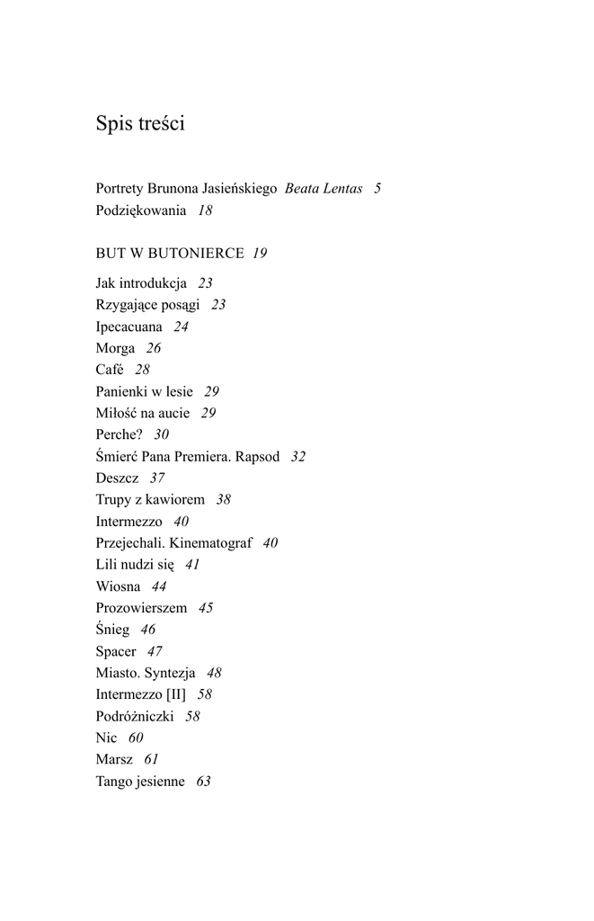 Spis treści Portrety Brunona Jasieńskiego Beata Lentas 5 Podziękowania 18 BUT W BUTONIERCE 19 Jak introdukcja 23 Rzygające posągi 23 Ipecacuana 24 Morga 26 Café 28 Panienki w lesie 29 Miłość na aucie 29 Perche? 30 Śmierć Pana Premiera. Rapsod 32 Deszcz 37 Trupy z kawiorem 38 Intermezzo 40 Przejechali. Kinematograf 40 Lili nudzi się 41 Wiosna 44 Prozowierszem 45 Śnieg 46 Spacer 47 Miasto. Syntezja 48 Intermezzo [II] 58 Podróżniczki 58 Nic 60 Marsz 61 Tango jesienne 63 Spis treœci But w butonierce 64 Na bis 65 PIEŚŃ O GŁODŹE 67 PIEŚŃ O GŁODZIE 95 ZIEMIA NA LEWO 123 Marsylianka 126 Marsz 127 Psalm powojenny 130 Śpiew maszynistów z „Pieśni o głodzie” 133 Prolog do „Foot-Ballu Wszystkich Świętych” 135 Bajka o kelnerze 136 SŁOWO O JAKUBIE SZELI 139 WIERSZE ROZPROSZONE 193 Prolog do „Wesela” Stanisława Wyspiańskiego 195 Wiosenno 197 Matki 198 ZemBY. Rapsodia 198 Pogżeb Reńi 203 Pogrzeb Reni 206 Upał 210 Upał 212 Bruno Jaśeński: „But w butońerce”. Stron dźewięćdźeśąt sześć. Warszawa – 1921 – Krakuw. Nakładem Klubu Futurystów „Katarynka” 214 Bruno Jasieński: „But w butonierce”. Stron dziewięćdziesiąt sześć. Warszawa – 1921 – Kraków. Nakładem Klubu Futurystów „Katarynka” 217 543 Foot-bal wszystkih świętyh. Prolog 221 Psalm powojenny 222 Mięso kobiet 225 Mięso kobiet 227 Zapałki 228 Na rzece 230 Egzotyka 231 Zwiastowanie 232 Mikołaj i literatura 234 * * * [I zdaje mi się, gdy patrzę…] 235 Morze 235 Erotyk wiosenny. (Preludium uperfumowane) Można i tak, ale nie trzeba 236 Poezja w Zoppotach 236 Jesień 239 Epitaphia Wielkich Polaków. Niestety żyjących. Seria I 241 Epitaphia Wielkich Polaków. Niestety żyjących. Seria II 242 Zarażeni 244 Rumak uśmiechnięty 245 Słowa polskie – polskie słowa 246 Do futurystów 248 * * * [Nie w jednym piecu…] 251 Wojciechowski Stanisław. „Kooperacja w rozwoju historycznym”. Warszawa 1923 251 Adolf Nowaczyński 252 * * * [Wszystkim kto w bój…] 252 Im. Uporczywym słuchaczom moich wierszy 253 Nagrobki Wielkich Polaków 255 Józef Piłsudski 255 Wiersz do naśladowców 256 Epitafium Tadeuszowi Peiperowi 257 Moja nieśmiertelność 257 Erotyk 259 Spis treœci Papierowa szubienica. Bajka o 3 morałach 261 Trzy książki. Próbka autoreklamy 262 O więzieniach i Thugutcie. Bajeczka zawsze aktualna 265 Wycieczki osobiste. Podręcznik dla poetów 268 Wycieczki osobiste. Podręcznik dla poetów. II 271 Wycieczki osobiste. Podręcznik dla poetów [III] 274 Wycieczki osobiste. Podręcznik dla poetów [IV] 277 Słowo o słowie 280 Pocałunki 282 Morse 283 Łabądź i Leda. Bajka współczesna 286 Łabędź i Leda. Sprostowanie 289 Żona księżyca 294 Wampir 296 Wampir [II] 299 Wiosenne refleksje 301 Bajka o tygodniu lotniczym 302 Bajka o targach 303 Juliusz Kaden-Bandrowski 304 Marian Hemar 305 Bajka o paszportach 305 Ach ten dolar 306 Refleksje po-targowe. Naśladowanie z francuskiego 306 Koń i taksis 308 Nie wszystko złoty, co się świeci 309 Bajka o królach. Poświęcona naszym monarchistom 310 Nasz dzień 310 Premiery premiera 311 Bajka o paktach 312 Bajka o podróżach 313 Bajka o Semaforze 314 Bajka o statystyce 315 545 Bajka o Habigu 316 Premier i żebrak 316 Bajka o ośle, Francuzach i Marokku 317 Pogrzeb Maxa Lindera 319 Podzwonne Grabskiemu 320 Rajcy i wróble. Bajeczka magistracka 320 Poseł i wyborca 323 Bajka o pogodzie 324 Bajka o świętym Mikołaju 327 Echo o Żeromskim 328 „13” 329 Ostatni romantycy 329 Epidemia 330 Ballada 331 Bajka wigilijna 332 Bajka gwiazdkowa 333 Bajka indywidualna 335 Bajka o ekspertach 335 Paweł i Gaweł. Bajka zmodernizowana 337 Bajka o monarchiście. W 14-tu przypadkach 337 Rząd czy nierząd 339 Miłość i jazz-band. Sielanka karnawałowa. „Blues” 340 Dyr. Ludwik Czarnoloski 341 Dyr. Stanisław Karol May-Kowski 342 Dyr. Franciszek Józef Strączkowski 342 Pan z brodą 342 Mandaryn Link 343 Kucio Grasiński 343 Red. Henryk Checheles 344 Redaktor Tanisław Hrabski 344 W. Pra-Ort 344 Prof. Juliusz Keiner 345 Spis treœci Tanisław Wasyl Ewski 345 Ludwik Zaleski 346 Hieronim Weltz 346 O kiepskim czytelniku historia żałosna 346 Bajka o „Rogu Szczęścia” 351 Rządca i ekonom 352 Staś i plama. Bajeczka zmodernizowana 353 Żółw i mysz. Bajeczka zmodernizowana 354 Bajka o damskim smokingu 354 P. Marianowi Zdziechowskiemu 355 Oda do konia 355 Owies i siano. Bajeczka zmodernizowana 357 Bajeczka wakacyjna. Wolna przeróbka z Boya 358 Naturalista. Bajeczka teatralna 359 Leszek i Mieszek czyli Zmodernizowana bajeczka o przyjaźni 360 Teatromanom 361 Bajka o Lidze. Wolna przeróbka z Boya 362 Mądry i głupi 363 Uta o Chinach. Wolny przekład z Remigiusza Kwiatkowskiego 363 Oda do Litwy 364 Nowa Alpuhara. Wolna przeróbka z Mickiewicza 364 Pod znakiem czasu 365 Uczył Marcin Marcina… 366 Podanie 366 Lis młody i stary. Wolny przekład z Krasickiego 367 Pochwała moralności 368 Sen monarchisty 368 Wino szampańskie. Wolny przekład z Krasickiego 370 Jagnię i wilki. Wolny przekład z Krasickiego 370 Żółw i mysz. Wolny przekład z Krasickiego 371 Zakładnicy 371 1917–1927 375 547 Powrót. Elegia paszportowa 377 Święty Mikołaj 378 W dobie rozbrojenia 379 Pod znakiem charlestona 379 Hymn do żarłoka. Z rosyjskiego 381 Do proletariatu francuskiego 382 Do W. Pana Jezusa 385 Marsz powstańców krakowskich 388 Dekret 390 Radio-Maj. Wyjątek z groteski rewolucyjnej 391 10 000 393 KOMENTARZE 395 Zasady wydania 397 Najważniejsze powojenne przedruki poezji Jasieńskiego 404 But w butonierce. Komentarz 406 Pieśń o głodźe / Pieśń o głodzie. Komentarz 424 Ziemia na lewo. Komentarz 435 Słowo o Jakubie Szeli. Komentarz 441 Wiersze rozproszone. Komentarz 457 Przypisy 517 Cytowana literatura przedmiotu 529 Nota o ilustracjach 534 Alfabetyczny spis utworów 535