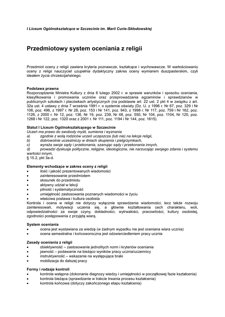 I Liceum Ogólnokształcące w Szczecinie im. Marii Curie-Skłodowskiej Przedmiotowy system oceniania z religii Przedmiot oceny z religii zawiera kryteria poznawcze, kształcące i wychowawcze. W wartościowaniu oceny z religii nauczyciel uzupełnia dydaktyczny zakres oceny wymiarem duszpasterskim, czyli ideałem życia chrześcijańskiego. Podstawa prawna Rozporządzenie Ministra Kultury z dnia 6 lutego 2002 r. w sprawie warunków i sposobu oceniania, klasyfikowania i promowania uczniów oraz przeprowadzania egzaminów i sprawdzianów w publicznych szkołach i placówkach artystycznych (na podstawie art. 22 ust. 2 pkt 4 w związku z art. 32a ust. 4 ustawy z dnia 7 września 1991 r. o systemie oświaty (Dz. U. z 1996 r. Nr 67, poz. 329 i Nr 106, poz. 496, z 1997 r. Nr 28, poz. 153 i Nr 141, poz. 943, z 1998 r. Nr 117, poz. 759 i Nr 162, poz. 1126, z 2000 r. Nr 12, poz. 136, Nr 19, poz. 239, Nr 48, poz. 550, Nr 104, poz. 1104, Nr 120, poz. 1268 i Nr 122, poz. 1320 oraz z 2001 r. Nr 111, poz. 1194 i Nr 144, poz. 1615). Statut I Liceum Ogólnokształcącego w Szczecinie Uczeń ma prawo do swobody myśli, sumienia i wyznania a) zgodnie z wolą rodziców uczeń uczęszcza (lub nie) na lekcje religii, b) dobrowolnie uczestniczy w dniach skupienia i pielgrzymkach, c) wyraża swoje sądy i przekonania, szanując sądy i przekonania innych, d) prowadzi dyskusje polityczne, religijne, ideologiczne, nie narzucając swojego zdania i systemu wartości innym, § 15.2, pkt 3a-d. Elementy wchodzące w zakres oceny z religii ilość i jakość prezentowanych wiadomości zainteresowanie przedmiotem stosunek do przedmiotu aktywny udział w lekcji pilność i systematyczność umiejętność zastosowania poznanych wiadomości w życiu właściwa postawa i kultura osobista Kontrola i ocena w religii nie dotyczy wyłącznie sprawdzenia wiadomości, lecz także rozwoju zainteresowań, motywacji uczenia się, a głównie kształtowania cech charakteru, woli, odpowiedzialności za swoje czyny, dokładności, wytrwałości, pracowitości, kultury osobistej, zgodności postępowania z przyjętą wiarą. System oceniania ocena jest wystawiana za wiedzę (w żadnym wypadku nie jest oceniana wiara ucznia) ocena semestralna i końcoworoczna jest odzwierciedleniem pracy ucznia Zasady oceniania z religii obiektywność – zastosowanie jednolitych norm i kryteriów oceniania jawność – podawanie na bieżąco wyników pracy ucznia/uczennicy instruktywność – wskazanie na występujące braki mobilizacja do dalszej pracy Formy i rodzaje kontroli kontrola wstępna (dokonanie diagnozy wiedzy i umiejętności w początkowej fazie kształcenia) kontrola bieżąca (sprawdzanie w trakcie trwania procesu kształcenia) kontrola końcowa (dotyczy zakończonego etapu kształcenia) Formy aktywności podlegające ocenianiu za pomocą ocen cząstkowych Uczeń otrzymuje następujące oceny cząstkowe w semestrze: Dodatkowo uczeń może otrzymać oceny cząstkowe za następujące zaangażowania: zadanie pisemne podczas zajęć lekcyjnych aktywny udział w zajęciach, np. częste i konstruktywne zabieranie głosu w dyskusji praca w grupach prowadzenie zeszytu referat dot. zaproponowanego tematu przedstawiony na forum klasy Możliwości poprawy ocen cząstkowych uczeń ma prawo poprawić każda ocenę w terminie dwóch tygodni od momentu jej wystawienia poprawiona ocena niedostateczna nie może być skreślona, przy czym nauczyciel może uznać ocenę poprawioną za ostateczną Ocena semestralna i końcoworoczna ocena nie będzie miała charakteru średniej arytmetycznej ocen cząstkowych uczeń, który przystąpi do olimpiady czy konkursu religijnego i pomyślnie ukończy co najmniej etap szkolny, będzie mógł uzyskać podniesienie oceny końcoworocznej o jeden stopień ocena semestralna i końcoworoczna jest wystawiana na forum klasy pod koniec każdego z semestrów oceny cząstkowe, semestralne i końcoworoczne wg skali: - celujący (6) - bardzo dobry (5) - dobry (4) - dostateczny (3) - dopuszczający (2) - niedostateczny (1) Klasyfikacja Uczeń może być niesklasyfikowany z religii, jeżeli brak jest podstaw do ustalenia oceny klasyfikacyjnej z powodu nieobecności ucznia na zajęciach edukacyjnych przekraczającej połowę czasu przeznaczonego na te zajęcia w szkolnym planie edukacji. Uczeń niesklasyfikowany z powodu usprawiedliwionej nieobecności może zdawać egzamin klasyfikacyjny. Kryteria poszczególnych ocen semestralnych/końcoworocznych Niedostateczny frekwencja poniżej 60% rażący brak wiadomości programowych brak jedności logicznej pomiędzy wiadomościami zupełny brak rozumienia uogólnień i nieumiejętność wyjaśniania zjawisk zupełny brak umiejętności stosowania wiedzy popełnianie licznych błędów podczas przekazywania informacji rażąco niepoprawny styl wypowiedzi brak aktywności na zajęciach lekceważący stosunek do przedmiotu i wartości religijnych uniemożliwianie aktywnego udziału innym uczestnikom zajęć Dopuszczający (wymagania konieczne) wymagana frekwencja – min. 60% mało zadowalający poziom postaw i umiejętności brak rozumienia podstawowych uogólnień brak podstawowej umiejętności wyjaśniania zjawisk nieumiejętność stosowania wiedzy, nawet przy pomocy nauczyciela brak aktywności na zajęciach lekceważący stosunek do przedmiotu Dostateczny (wymagania podstawowe) wymagana frekwencja – min. 80% opanowanie łatwych, całkowicie niezbędnych wiadomości, postaw i umiejętności znajomość podstawowych treści materiału programowego z religii mała kondensacja wypowiedzi przeciętna pilność, systematyczność i zainteresowanie przedmiotem aktywność na zajęciach zachowanie zasad kultury osobistej Dobry (wymagania rozszerzające) wymagana frekwencja – min. 80% wysoka aktywność na zajęciach opanowanie materiału programowego z religii uzyskiwanie postępu podczas prowadzonych zajęć zainteresowanie przedmiotem zachowanie zasad kultury osobistej Bardzo dobry