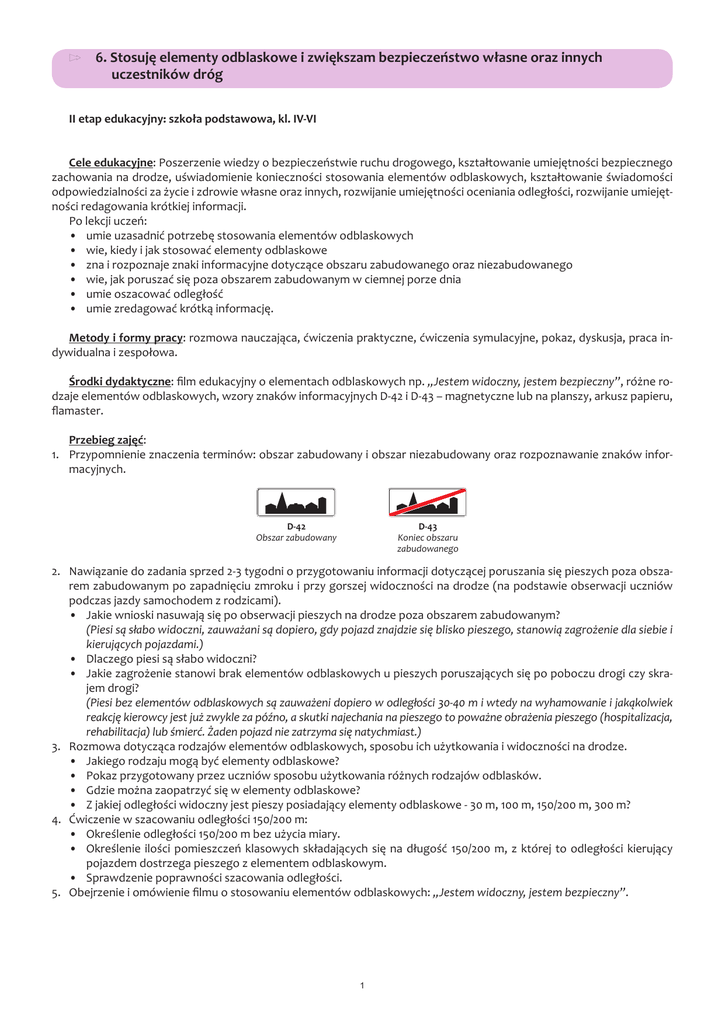 6. Stosuję elementy odblaskowe i zwiększam bezpieczeństwo własne oraz innych uczestników dróg II etap edukacyjny: szkoła podstawowa, kl. IV-VI Cele edukacyjne: Poszerzenie wiedzy o bezpieczeństwie ruchu drogowego, kształtowanie umiejętności bezpiecznego zachowania na drodze, uświadomienie konieczności stosowania elementów odblaskowych, kształtowanie świadomości odpowiedzialności za życie i zdrowie własne oraz innych, rozwijanie umiejętności oceniania odległości, rozwijanie umiejętności redagowania krótkiej informacji. Po lekcji uczeń: • umie uzasadnić potrzebę stosowania elementów odblaskowych • wie, kiedy i jak stosować elementy odblaskowe • zna i rozpoznaje znaki informacyjne dotyczące obszaru zabudowanego oraz niezabudowanego • wie, jak poruszać się poza obszarem zabudowanym w ciemnej porze dnia • umie oszacować odległość • umie zredagować krótką informację. Metody i formy pracy: rozmowa nauczająca, ćwiczenia praktyczne, ćwiczenia symulacyjne, pokaz, dyskusja, praca indywidualna i zespołowa. Środki dydaktyczne: film edukacyjny o elementach odblaskowych np. „Jestem widoczny, jestem bezpieczny”, różne rodzaje elementów odblaskowych, wzory znaków informacyjnych D-42 i D-43 – magnetyczne lub na planszy, arkusz papieru, flamaster. Przebieg zajęć: 1. Przypomnienie znaczenia terminów: obszar zabudowany i obszar niezabudowany oraz rozpoznawanie znaków informacyjnych. D-42 Obszar zabudowany D-43 Koniec obszaru zabudowanego 2. Nawiązanie do zadania sprzed 2-3 tygodni o przygotowaniu informacji dotyczącej poruszania się pieszych poza obszarem zabudowanym po zapadnięciu zmroku i przy gorszej widoczności na drodze (na podstawie obserwacji uczniów podczas jazdy samochodem z rodzicami). • Jakie wnioski nasuwają się po obserwacji pieszych na drodze poza obszarem zabudowanym? (Piesi są słabo widoczni, zauważani są dopiero, gdy pojazd znajdzie się blisko pieszego, stanowią zagrożenie dla siebie i kierujących pojazdami.) • Dlaczego piesi są słabo widoczni? • Jakie zagrożenie stanowi brak elementów odblaskowych u pieszych poruszających się po poboczu drogi czy skrajem drogi? (Piesi bez elementów odblaskowych są zauważeni dopiero w odległości 30-40 m i wtedy na wyhamowanie i jakąkolwiek reakcję kierowcy jest już zwykle za późno, a skutki najechania na pieszego to poważne obrażenia pieszego (hospitalizacja, rehabilitacja) lub śmierć. Żaden pojazd nie zatrzyma się natychmiast.) 3. Rozmowa dotycząca rodzajów elementów odblaskowych, sposobu ich użytkowania i widoczności na drodze. • Jakiego rodzaju mogą być elementy odblaskowe? • Pokaz przygotowany przez uczniów sposobu użytkowania różnych rodzajów odblasków. • Gdzie można zaopatrzyć się w elementy odblaskowe? • Z jakiej odległości widoczny jest pieszy posiadający elementy odblaskowe - 30 m, 100 m, 150/200 m, 300 m? 4. Ćwiczenie w szacowaniu odległości 150/200 m: • Określenie odległości 150/200 m bez użycia miary. • Określenie ilości pomieszczeń klasowych składających się na długość 150/200 m, z której to odległości kierujący pojazdem dostrzega pieszego z elementem odblaskowym. • Sprawdzenie poprawności szacowania odległości. 5. Obejrzenie i omówienie filmu o stosowaniu elementów odblaskowych: „Jestem widoczny, jestem bezpieczny”. 1 6. Redagowanie ulotki-apelu jako sposobu promowania stosowania elementów odblaskowych wśród pieszych. • Jak przekonać pieszych do stosowania elementów odblaskowych, z którymi są widoczni z odległości 150 m, a nawet 200 m. Jakich użyć argumentów? (Np. rozmowa z członkami rodziny i bliskimi osobami, opracowanie krótkiej ulotki-apelu o zachowanie bezpieczeństwa na drodze poza miastem/wsią, w tym o stosowaniu elementów odblaskowych.) • Propozycje treści ulotki-apelu do pieszych poruszających się drogą poza miejscowością – poza obszarem zabudowanym. • Wspólne redagowanie ulotki-apelu i zapisanie na arkuszu papieru – załącznik 1. • Ustalenie sposobu rozpowszechniania ulotki i wybór osoby do przepisania tekstu ulotki na komputerze. 7. Ćwiczenie symulacyjne w poruszaniu się po drodze poza obszarem zabudowanym z elementami odblaskowymi. 8. Podsumowanie zajęć i ocena zaangażowania uczniów. ➢ Załącznik 1. Propozycja ulotki-apelu. DO PIESZEGO ZADBAJ O BEZPIECZEŃSTWO WŁASNE I INNYCH NA DRODZE! 1. Korzystaj z miejsc przeznaczonych dla pieszych. 2. Na drodze poza miastem/wsią, jeżeli nie ma drogi dla pieszych, idź poboczem lewej strony drogi i ustępuj miejsca nadjeżdżającym pojazdom. Jeśli nie ma pobocza lub nie nadaje się ono do korzystania, możesz iść skrajem lewej strony jezdni. 3. Noś elementy odblaskowe w widocznym miejscu. DAJ SYGNAŁ KIEROWCY! NOŚ ODBLASKI! 4. Przechodź w miejscu bezpiecznym, gdy pojazdy nie jadą lub zatrzymają się. 5. Zachowaj rozwagę na drodze. NIE RYZYKUJ – BĄDŹ OSTROŻNY I WIDOCZNY NA DRODZE! 2