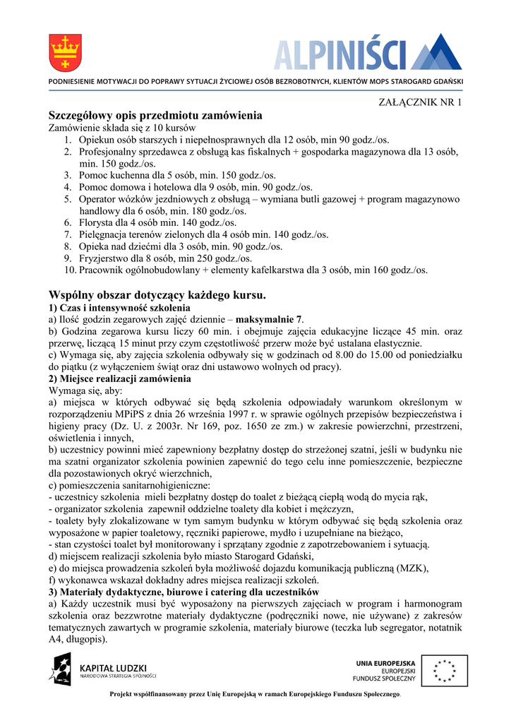 ZAŁĄCZNIK NR 1 Szczegółowy opis przedmiotu zamówienia Zamówienie składa się z 10 kursów 1. Opiekun osób starszych i niepełnosprawnych dla 12 osób, min 90 godz./os. 2. Profesjonalny sprzedawca z obsługą kas fiskalnych + gospodarka magazynowa dla 13 osób, min. 150 godz./os. 3. Pomoc kuchenna dla 5 osób, min. 150 godz./os. 4. Pomoc domowa i hotelowa dla 9 osób, min. 90 godz./os. 5. Operator wózków jezdniowych z obsługą – wymiana butli gazowej + program magazynowo handlowy dla 6 osób, min. 180 godz./os. 6. Florysta dla 4 osób min. 140 godz./os. 7. Pielęgnacja terenów zielonych dla 4 osób min. 140 godz./os. 8. Opieka nad dziećmi dla 3 osób, min. 90 godz./os. 9. Fryzjerstwo dla 8 osób, min 250 godz./os. 10. Pracownik ogólnobudowlany + elementy kafelkarstwa dla 3 osób, min 160 godz./os. Wspólny obszar dotyczący każdego kursu. 1) Czas i intensywność szkolenia a) Ilość godzin zegarowych zajęć dziennie – maksymalnie 7. b) Godzina zegarowa kursu liczy 60 min. i obejmuje zajęcia edukacyjne liczące 45 min. oraz przerwę, liczącą 15 minut przy czym częstotliwość przerw może być ustalana elastycznie. c) Wymaga się, aby zajęcia szkolenia odbywały się w godzinach od 8.00 do 15.00 od poniedziałku do piątku (z wyłączeniem świąt oraz dni ustawowo wolnych od pracy). 2) Miejsce realizacji zamówienia Wymaga się, aby: a) miejsca w których odbywać się będą szkolenia odpowiadały warunkom określonym w rozporządzeniu MPiPS z dnia 26 września 1997 r. w sprawie ogólnych przepisów bezpieczeństwa i higieny pracy (Dz. U. z 2003r. Nr 169, poz. 1650 ze zm.) w zakresie powierzchni, przestrzeni, oświetlenia i innych, b) uczestnicy powinni mieć zapewniony bezpłatny dostęp do strzeżonej szatni, jeśli w budynku nie ma szatni organizator szkolenia powinien zapewnić do tego celu inne pomieszczenie, bezpieczne dla pozostawionych okryć wierzchnich, c) pomieszczenia sanitarnohigieniczne: - uczestnicy szkolenia mieli bezpłatny dostęp do toalet z bieżącą ciepłą wodą do mycia rąk, - organizator szkolenia zapewnił oddzielne toalety dla kobiet i mężczyzn, - toalety były zlokalizowane w tym samym budynku w którym odbywać się będą szkolenia oraz wyposażone w papier toaletowy, ręczniki papierowe, mydło i uzupełniane na bieżąco, - stan czystości toalet był monitorowany i sprzątany zgodnie z zapotrzebowaniem i sytuacją. d) miejscem realizacji szkolenia było miasto Starogard Gdański, e) do miejsca prowadzenia szkoleń była możliwość dojazdu komunikacją publiczną (MZK), f) wykonawca wskazał dokładny adres miejsca realizacji szkoleń. 3) Materiały dydaktyczne, biurowe i catering dla uczestników a) Każdy uczestnik musi być wyposażony na pierwszych zajęciach w program i harmonogram szkolenia oraz bezzwrotne materiały dydaktyczne (podręczniki nowe, nie używane) z zakresów tematycznych zawartych w programie szkolenia, materiały biurowe (teczka lub segregator, notatnik A4, długopis). Projekt współfinansowany przez Unię Europejską w ramach Europejskiego Funduszu Społecznego. b) Przed rozpoczęciem każdego ze szkoleń wykonawca jest zobowiązany do: - informowania uczestników szkolenia o obowiązujących przepisach, dotyczących bloków tematycznych z powyższego szkolenia, na dzień realizacji szkolenia, c) Uczestnikom szkolenia, w każdym dniu odbywania zajęć należy zapewnić catering, w skład którego ma wejść: - posiłek obiadowy tzn. posiłek jednodaniowy, mięsny pełnowartościowy pod względem odżywczym, różnorodny, zgodny z zasadami żywienia. Zamawiający dopuszcza raz w tygodniu przygotowanie posiłku bez mięsa, np.: naleśniki z serem. Każdy z posiłków musi zawierać minimum 1000 kalorii. Temperatura wydawanych posiłków powinna być zgodna z normami żywieniowymi. W przypadku posiłków dostarczanych do miejsca szkolenia powinny być one podzielone na porcje, dostarczone w zamykanych opakowaniach jednorazowego użytku, zabezpieczone przed nadmierną utratą ciepła, w sposób umożliwiający bezpośrednie podanie do spożycia wraz ze sztućcami jednorazowego użytku. Zarówno opakowania, jak i sztućce muszą być dopuszczone do kontaktu z żywnością, - kawa, herbata oraz co najmniej ½ litra wody mineralnej na osobę dziennie, - ciastka na sztuki lub kruche (różnego rodzaju). d) Wykonawca przez cały okres realizacji umowy będzie prowadził rejestr wydanych materiałów szkoleniowych, listy obecności oraz listy wydanych posiłków. Wykonawca przekaże Zamawiającemu 1 komplet materiałów szkoleniowych o takim samym zakresie i w takiej samej formie jaka była używana podczas szkolenia oraz wydana uczestnikom szkolenia. 4) Zakres szkolenia a) Szkolenie powinno obejmować część teoretyczną i praktyczną z wykorzystaniem standardów kwalifikacji zawodowych i modułowych programów szkoleń zawodowych dostępnych w bazach danych prowadzonych przez Ministra Pracy i Polityki Społecznej z danego zakresu (www.standardyiszkolenia.praca.gov.pl), b) Szkolenie musi być zrealizowane zgodnie z właściwymi przepisami, w szczególności zgodnie z rozporządzeniem MPiPS z dnia 26 września 1997 r. w sprawie ogólnych przepisów bezpieczeństwa i higieny pracy (Dz.U. z 2003r. Nr 169, poz. 1650 z późn. zm.), z uwzględnieniem wyposażenia uczestników kursu w odzież ochronną nową, nieużywaną. c) Szkolenie musi być przeprowadzone zgodnie z programem szkolenia sporządzonym wg wzoru (załącznik nr 6 do SIWZ) oraz zapisami wskazanymi w niniejszych szczegółowych opisach przedmiotu zamówienia. 5) Finansowanie i logo a) Realizacja szkoleń odbywać się będzie w ramach projektu systemowego pn. „ Alpiniści – podniesienie motywacji do poprawy sytuacji życiowej osób bezrobotnych, klientów MOPS Starogard Gdański”- edycja 2013, współfinansowanego przez Unię Europejską z Europejskiego Funduszu Społecznego. Każde szkolenie zakończy się wystawieniem przez Wykonawcę dodat