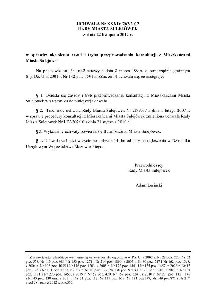 UCHWAŁA Nr XXXIV/262/2012 RADY MIASTA SULEJÓWEK z dnia 22 listopada 2012 r. w sprawie: określenia zasad i trybu przeprowadzania konsultacji z Mieszkańcami Miasta Sulejówek Na podstawie art. 5a ust.2 ustawy z dnia 8 marca 1990r. o samorządzie gminnym (t. j. Dz. U. z 2001 r. Nr 142 poz. 1591 z późn. zm.¹) uchwala się, co następuje: § 1. Określa się zasady i tryb przeprowadzania konsultacji z Mieszkańcami Miasta Sulejówek w załączniku do niniejszej uchwały. § 2. Traci moc uchwała Rady Miasta Sulejówek Nr 28/V/07 z dnia 1 lutego 2007 r. w sprawie procedury konsultacji z Mieszkańcami Miasta Sulejówek zmieniona uchwałą Rady Miasta Sulejówek Nr LIV/302/10 z dnia 28 stycznia 2010 r. § 3. Wykonanie uchwały powierza się Burmistrzowi Miasta Sulejówek. § 4. Uchwała wchodzi w życie po upływie 14 dni od daty jej ogłoszenia w Dzienniku Urzędowym Województwa Mazowieckiego. Przewodniczący Rady Miasta Sulejówek Adam Lesiński [1] Zmiany tekstu jednolitego wymienionej ustawy zostały ogłoszone w Dz. U. z 2002 r. Nr 23 poz. 220, Nr 62 poz. 558, Nr 113 poz. 984, Nr 153 poz. 1271 i Nr 214 poz. 1806, z 2003 r. Nr 80 poz. 717 i Nr 162 poz. 1568, z 2004 r. Nr 102 poz. 1055 i Nr 116 poz. 1203, z 2005 r. Nr 172 poz. 1441 i Nr 175 poz. 1457, z 2006 r. Nr 17 poz. 128 i Nr 181 poz. 1337, z 2007 r. Nr 48 poz. 327, Nr 138 poz. 974 i Nr 173 poz. 1218, z 2008 r. Nr 189 poz. 1111 i Nr 223 poz. 1458, z 2009 r. Nr 52 poz. 420, Nr 157 poz. 1241, z 2010 r. Nr 28 poz. 142 i 146 i Nr 40 poz. 230 oraz z 2011 r. Nr 21 poz. 113, Nr 117 poz. 679, Nr 134 poz.777, Nr 149 poz.887 i Nr 217 poz.1281 oraz z 2012 r. poz.567. Załącznik do uchwały Nr XXXIV/262/2012 Rady Miasta Sulejówek z dnia 22 listopada 2012 r. ZASADY I TRYB PRZEPROWADZANIA KONSULTACJI Z MIESZKAŃCAMI MIASTA SULEJÓWEK § 1. Konsultacje z Mieszkańcami Miasta Sulejówek, zwane dalej konsultacjami przeprowadza się: 1) w przypadkach określonych powszechnie obowiązującymi przepisami prawa, 2) w sprawach ważnych dla Miasta, jak np. dotyczących zmiany planu sieci szkół, programów gospodarczych, strategii rozwiązywania problemów społecznych. § 2. Burmistrz Miasta jest uprawniony do podejmowania decyzji o przeprowadzeniu konsultacji na zasadach określonych w niniejszym dokumencie, o ile nie zostały one zastrzeżone do kompetencji Rady Miasta. § 3. 1. Konsultacje społeczne mogą być przeprowadzane z inicjatywy: 1) Rady Miasta Sulejówek 2) Burmistrza Miasta Sulejówek, 3) grupy co najmniej 5% Mieszkańców Miasta Sulejówek. 2. Wniosek o przeprowadzenie konsultacji społecznych powinien określać: 1) proponowany termin i zakres przedmiotu konsultacji, 2) propozycję formy konsultacji, 3) udział wnioskodawcy w organizacji i prowadzeniu konsultacji, 4) uzasadnienie potrzeby przeprowadzenia konsultacji społecznych. 3. Jeżeli wniosek o przeprowadzenie konsultacji społecznych zgłoszony został z inicjatywy Mieszkańców, oprócz wymagań określonych w ust. 2, powinien zawierać również: 1) wskazanie osoby (osób) upoważnionej(nych) do kontaktów w imieniu składających wniosek o przeprowadzenie konsultacji społecznych, z podaniem niezbędnych danych kontaktowych, 2) listę osób popierających wniosek o przeprowadzenie konsultacji społecznych w liczbie nie mniejszej niż 5% Mieszkańców Miasta Sulejówek. Lista musi zawierać następujące dane: a) imię, nazwisko, b) adres zamieszkania, c) PESEL, d) podpis oraz zgodę na przetwarzanie danych osobowych osób popierających wniosek o przeprowadzenie konsultacji społecznych dla potrzeb niezbędnych dla realizacji procesu konsultacji społecznych, zgodnie z ustawą z dnia 29 sierpnia 1997 r. o ochronie danych osobowych. e) na każdej z ponumerowanych stron listy osób popierających wniosek o przeprowadzenie konsultacji społecznych powinien być umieszczony zapis określający przedmiot konsultacji. 4. Jeżeli wniosek o przeprowadzenie konsultacji społecznych, zgłoszony z inicjatywy Mieszkańców nie spełnia wymogów formalnych, Burmistrz, w terminie 14 dni od dnia złożenia wniosku, wzywa osoby upoważnione we wniosku do kontaktów, do uzupełnienia braków formalnych wniosku, w terminie 7 dni od dnia otrzymania wezwania, pod rygorem pozostawienia wniosku bez rozpoznania. Wezwanie powinno zawierać wskazanie braków formalnych wniosku uniemożliwiających nadanie mu dalszego biegu. 5. Wniosek, którego braki nie zostały uzupełnione w wyznaczonym terminie nie podlega rozpatrywaniu. 6. Wniosek o przeprowadzenie konsultacji społecznych zgłoszony z inicjatywy Mieszkańców powinien zostać rozpatrzony nie później niż w ciągu 1 miesiąca od daty złożenia poprawnego pod względem formalnym wniosku. Informacja o odmowie winna być uzasadniona. 7. Burmistrz Miasta rozpatruje wnioski uwzględniając koszty proponowanej formy konsultacji. § 4. Konsultacje społeczne powinny być przeprowadzane, w miarę możliwości, na etapie tworzenia założeń do konsultowanego projektu lub prac nad wstępną wersją konsultowanego projektu. W przypadku inwestycji, konsultacje powinny być przeprowadzane na etapie przygotowań do rozpoczęcia inwestycji. § 5. Konsultacje społeczne mają charakter opiniodawczy, a ich wyniki nie wiążą organów chyba, że ustawa stanowi inaczej. § 6. Przeprowadzenie konsultacji społecznych poprzedzone jest przygotowaniem procedury przez Burmistrza Miasta, polegającej w szczególności na: 1) wyznaczeniu osoby koordynującej i odpowiedzialnej za przeprowadzenie konsultacji społecznych, wraz z ewentualnym wyznaczeniem osób do pomocy, 2) wyborze formy i sposobu przeprowadzenia konsultacji społecznych, 3) zaplanowaniu procesu konsultacji społecznych, 4) określeniu sposobu finansowania. § 7. 1. Przeprowadzenie konsultacji społecznych powinno być poprzedzone akcją informacyjną, trwającą co najmniej 14 dni przed ich rozpoczęciem. Informacje w tym zakresie powinny zawierać co najmniej przedmiot konsultacji, formę, sposó