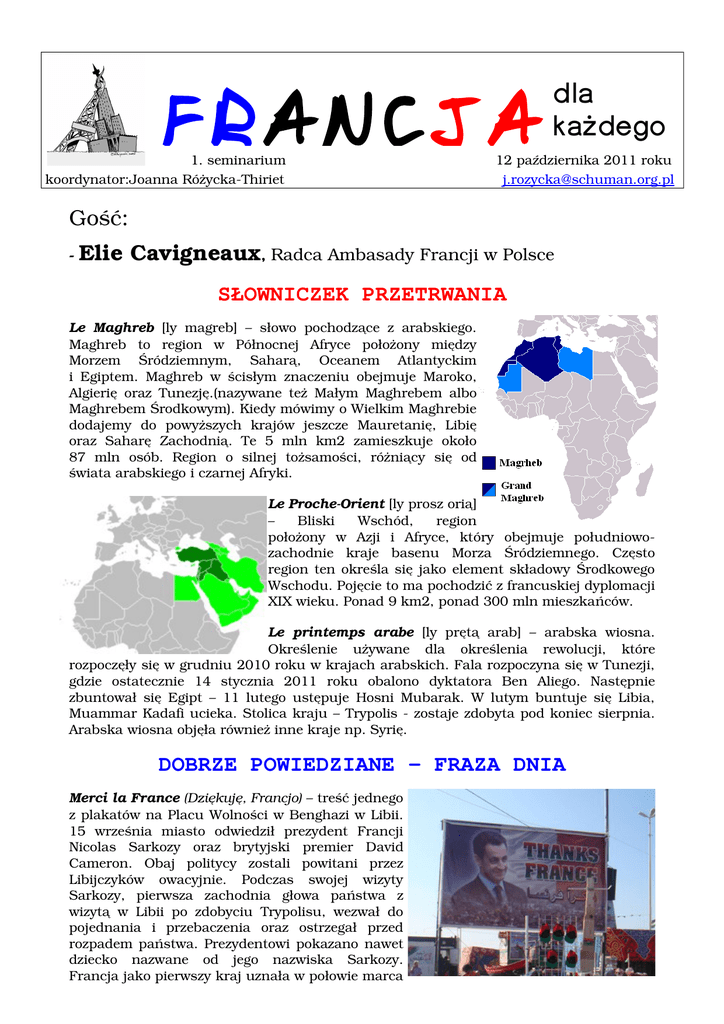 FRANCJA dla każdego 1. seminarium 12 października 2011 roku koordynator:Joanna RóżyckaThiriet [email protected] Gość: Elie Cavigneaux, Radca Ambasady Francji w Polsce SŁOWNICZEK PRZETRWANIA Le Maghreb [ly magreb] – słowo pochodzące z arabskiego. Maghreb to region w Północnej Afryce położony między Morzem Śródziemnym, Saharą, Oceanem Atlantyckim i Egiptem. Maghreb w ścisłym znaczeniu obejmuje Maroko, Algierię oraz Tunezję.(nazywane też Małym Maghrebem albo Maghrebem Środkowym). Kiedy mówimy o Wielkim Maghrebie dodajemy do powyższych krajów jeszcze Mauretanię, Libię oraz Saharę Zachodnią. Te 5 mln km2 zamieszkuje około 87 mln osób. Region o silnej tożsamości, różniący się od świata arabskiego i czarnej Afryki. Le ProcheOrient [ly prosz orią] – Bliski Wschód, region położony w Azji i Afryce, który obejmuje południowo zachodnie kraje basenu Morza Śródziemnego. Często region ten określa się jako element składowy Środkowego Wschodu. Pojęcie to ma pochodzić z francuskiej dyplomacji XIX wieku. Ponad 9 km2, ponad 300 mln mieszkańców. Le printemps arabe [ly prętą arab] – arabska wiosna. Określenie używane dla określenia rewolucji, które rozpoczęły się w grudniu 2010 roku w krajach arabskich. Fala rozpoczyna się w Tunezji, gdzie ostatecznie 14 stycznia 2011 roku obalono dyktatora Ben Aliego. Następnie zbuntował się Egipt – 11 lutego ustępuje Hosni Mubarak. W lutym buntuje się Libia, Muammar Kadafi ucieka. Stolica kraju – Trypolis zostaje zdobyta pod koniec sierpnia. Arabska wiosna objęła również inne kraje np. Syrię. DOBRZE POWIEDZIANE – FRAZA DNIA Merci la France (Dziękuję, Francjo) – treść jednego z plakatów na Placu Wolności w Benghazi w Libii. 15 września miasto odwiedził prezydent Francji Nicolas Sarkozy oraz brytyjski premier David Cameron. Obaj politycy zostali powitani przez Libijczyków owacyjnie. Podczas swojej wizyty Sarkozy, pierwsza zachodnia głowa państwa z wizytą w Libii po zdobyciu Trypolisu, wezwał do pojednania i przebaczenia oraz ostrzegał przed rozpadem państwa. Prezydentowi pokazano nawet dziecko nazwane od jego nazwiska Sarkozy. Francja jako pierwszy kraj uznała w połowie marca libijską Tymczasową Radę Narodową. Szybkość podjętych działań kontrastowała z opieszałością np. w przypadku manifestacji w Tunezji. Francja i Wielka Brytania były jednym z inicjatorów rezolucji Rady Bezpieczeństwa ONZ nr 1973 z 17 marca 2011 roku, wzywającej do ochrony libijskich cywilów oraz uczestnikami interwencji z powietrza w Libii. 1 września w Paryżu zorganizowano konferencję dotyczącą wsparcia dla nowej Libii. Zobacz więcej: www.youtube.com/watch?v=97nTyKUXYI PORTRETY MNIEJ ZNANYCH MĘŻCZYZN I KOBIET Ur. w 1945 roku minister spraw zagranicznych i europejskich Alain Juppé posiada bardzo barwny życiorys. Po studiach z literatury w elitarnej szkole Ecole Normale Supérieure i zdaniu prestiżowego konkursu agrégation z literatury klasycznej udaje się na studia do następnych elitarnych placówek Instytutu Studiów Politycznych (IEP) w Paryżu oraz Narodowej Szkoły Administracji (ENA). Począwszy od 1976 roku jest wiernym druhem Jacques'a Chiraca, towarzyszy mu między innymi kiedy ten jest merem Paryża. Po raz pierwszy do rządu trafia w 1986 roku. W latach 199395 jest ministrem spraw zagranicznych, a następnie premierem (199597). W 2004 roku zostaje skazany w aferze fikcyjnych stanowisk w merostwie Paryża za rządów Chiraca na 14 miesięcy więzienia w zawieszeniu i rok pozbawienia biernego prawa wyborczego (możliwości kandydowania). Według komentatorów krył Jacques'a Chiraca. W 2007 roku wraca na ławy rządowe po wyborze na prezydenta Nicolasa Sarkozy'ego. Jest ministrem ds. ekologi. Stanowisko opuszcza, kiedy nie zdobywa mandatu deputowanego do Zgromadzenia Narodowego. Ale od 2010 roku jest ministrem obrony i w końcu w 2011 roku zastępuje na stanowisku ministra spraw zagranicznych Michèle AlliotMarie (odeszła w atmosferze skandalu w związku ze swoimi kontrowersyjnymi wakacjami w Tunezji oraz uwagami o poparciu dla reżimu tunezyjskiego). Juppé ma też piękną kartę w ruchu gaullistowskim (francuskiej prawicy). W latach 199497 jest przewodniczącym partii RPR, a w latach 20022004 przewodniczącym jej następcy UMP. Związany jest z miastem Bordeaux, którego merem był w latach 19952004 oraz obecnie, od 2006. roku. Jako minister osobiście przekonywał w Nowym Jorku Radę Bezpieczeństwa ONZ do przyjęcia rezolucji nr 1973. JAK TO SIĘ JE, CZYLI O FRANCUSKICH ZWYCZAJACH La rentrée – kiedy wakacje zbliżają się do końca we francuskich mediach słychać bez przerwy to słowo, które oznacza powrót po (najczęściej) letnim odpoczynku. Mówi się więc o rentrée scolaire, czyli powrocie dzieci do szkoły. Swoją rentrée mają też studenci i wykładowcy (rentrée universitaire), a nawet politycy. Organizatorem seminariów jest Polska Fundacja im. Roberta Schumana Partnerem seminariów jest Fundacja Roberta Schumana w Paryżu Działania Polskiej Fundacji im. Roberta Schumana są współfinansowane przez Unię Europejską, ze środków programu Europa dla Obywateli