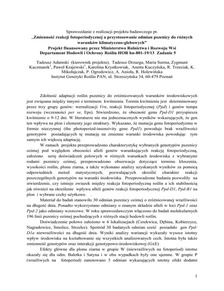 Sprawozdanie z realizacji projektu badawczego pt. „Zmienność reakcji fotoperiodycznej a przystosowanie odmian pszenicy do różnych warunków klimatyczno-glebowych” Projekt finansowany przez Ministerstwo Rolnictwa i Rozwoju Wsi Departament Hodowli i Ochrony Roślin HOR hn-801-19/13 Zadanie 5 Tadeusz Adamski (kierownik projektu), Tadeusz Drzazga, Maria Surma, Zygmunt Kaczmarek1, Paweł Krajewski1, Karolina Krystkowiak, Anetta Kuczyńska, R. Trzeciak, K. Mikołajczak, P. Ogrodowicz, A. Anioła, R. Holewińska Instytut Genetyki Roślin PAN, ul. Strzeszyńska 34, 60-479 Poznań Zdolność adaptacji roślin pszenicy do zróżnicowanych warunków środowiskowych jest związana między innymi z terminem kwitnienia. Termin kwitnienia jest determinowany przez trzy grupy genów: wernalizacji Vrn, reakcji fotoperiodycznej (Ppd) i genów tempa rozwoju (wczesności per se, Eps). Stwierdzono, że obecność genu Ppd-D1 przyspiesza kwitnienie o 9-12 dni. W literaturze nie ma jednoznacznych wyników wskazujących, że gen ten wpływa na plon i elementy jego struktury. Wykazano, że mutacja genu fotoperiodyzmu w formie nieczynnej (the photoperiod-insensivity gene Ppd1) powoduje brak wrażliwości genotypów posiadających tę mutację na zmienne warunki środowiska powodując tym samym ich większą adaptację. W ramach projektu przeprowadzono charakterystykę wybranych genotypów pszenicy ozimej pod względem obecności alleli genów warunkujących reakcję fotoperiodyczną, założono serię doświadczeń polowych w różnych warunkach środowiska z wybranymi rodami pszenicy ozimej, przeprowadzono obserwacje dotyczące terminu kłoszenia, wysokości roślin, plonu ziarna, a także wykonano analizy uzyskanych wyników za pomocą odpowiednich metod statystycznych, pozwalających określić charakter reakcji poszczególnych genotypów na warunki środowiska. Przeprowadzone badania pozwoliły na stwierdzenie, czy istnieje zwiazek między reakcja fotoperiodyczną roślin a ich stabilnością jak również na określenie wpływu alleli genów reakcji fotoperiodycznej Ppd-D1, Ppd-B1 na plon i wybrane cechy użytkowe. . Materiał do badań stanowiło 30 odmian pszenicy ozimej o zróżnicowanej wrażliwości na długość dnia. Ponadto wykorzystano odmiany o znanym składzie alleli w loci Ppd-1 oraz Ppd-2 jako odmiany wzorcowe. W roku sprawozdawczym włączono do badań molekularnych 196 linii pszenicy ozimej pochodzących z różnych stacji hodowli roślin. Doświadczenie polowe założono w 6 lokalizacjach (Cerekwica, Dębina, Kobierzyce, Nagradowice, Smolice, Strzelce). Spośród 30 badanych odmian sześć posiadało gen PpdD1a niewrażliwości na długość dnia. Wyniki analizy wariancji wykazały wysoce istotny wpływ środowiska na kształtowanie się wszystkich analizowanych cech. Istotna była także zmienność genotypów oraz interakcji genotypowo-środowiskowej (GxE) Efekty główne dla plonu ziarna w grupie W (niewrażliwych na fotoperiod) istotne okazały się dla odm. Baletka i Satyna i w obu wypadkach były one ujemne. W grupie P (wrażliwych na fotoperiod) zanotowano 5 odmian wykazujących istotny efekt dodatni 1 (Askalon, Henrik, KWS Magic, KWS Ozon i Linus) oraz 5 odmian z efektami ujemnymi (Finezja, Ostroga, Tonacja, Turkis, Wydma). Odmiany w większości były stabilne w plonowaniu, istotną interakcję GxE odnotowano dla 11 odmian (36,7%), przy czym w obu grupach procent linii niestabilnych był zbliżony. Masa 1000 ziaren w większości przypadków nie różniła się istotnie od średniej ogólnej. Jednakże tylko 4 spośród 30 odmian były stabilne pod względem masy 1000 ziaren, w tym tylko 2 odmiany o wysokim CTN – Astoria i Bamberka. Efekty główne dla wysokości roślin były silnie zróżnicowane i w większości przypadków (66,7%) istotne. Można zauważyć, że odmiany o istotnych dodatnich efektach dla plonu ziarna odznaczały się istotnie mniejszą wysokością roślin niż średnia dla całego zestawu odmian (Askalon, Henrik, KWS Magic, KWS Ozon i Linus). Efekty główne dla wczesności, mierzonej liczbą dni od 1 stycznia do kłoszenia i dojrzałości woskowej ziarna, okazały się istotnie ujemne wszystkich odmian w grupie W (jedynie w przypadku odm. Naridana efekt główny dla dojrzałości woskowej był ujemny ale nieistotny). Pod względem terminu kłoszenia większość odmian okazała się stabilna, jedynie w 7 przypadkach statystyka F dla interakcji była istotna, przy czym dla 2 odmian w grupie W (Astoria i Baletka). W przeciwieństwie do kłoszenia interakcja GxE dla liczby dni do dojrzałości woskowej była istotna dla 27 spośród 30 badanych odmian. Pod względem średniego plonu ziarna i masy 1000 ziaren grupa odmian niewrażliwych na fotoperiod nie różniły się istotnie od grupy odmian reagujących na długość dnia. Wysokość roślin w grupie odmian z genem Ppd-D1b była istotnie niższa we wszystkich miejscowościach z wyjątkiem Nagradowic. Termin kłoszenia i dojrzałości woskowej w tej grupie odmian był jednak istotnie dłuższy aniżeli u odmian niewrażliwych na długość dnia. Stopień porażenia odmian mączniakiem rdzą oraz septoriozą liści dla obu grup odmian okazały się zbliżone, jedynie w przypadku septoriozy liści różnica P-W okazała się istotna, co oznacza, że odmiany grupy P z genem Ppd-D1b były bardziej odporne. Analizy odmian z wykorzystaniem markerów allelospecyficznych dla locus Ppd-D1 wykonano na 196 liniach pszenicy ozimej. Zmutowaną formę genu związaną z brakiem wrażliwości na długość dnia stwierdzono u siedmiu spośród 196 badanych linii pszenicy (AND34/68, JX01011/2, SX6511/1, JX0111/19, AND 314/123, SM40/47, KBP81/550. Stwierdzono u nich obecność produktu o długości 288 bp. Pozostałe linie generowały produkt o długości 414 bp związany z allelem Ppd-D1b charakterystycznym dla większej wrażliwości na fotoperiod. Badania poszerzono o markery mikrosatelitarne zlokalizowane w pobliżu g