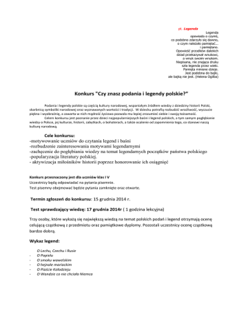 pt. Legenda Legenda opowiada o czymś, co podobno zdarzyło się dawno, o czym należało pamiętać... i pamiętano. Opowieść przodków dalekich dziad przekazywał wnukowi, a wnuk swoim wnukom. Niepisana, nie znająca druku szła legenda przez wieki. Pamięta minione dzieje. Jest podobna do bajki, ale bajką nie jest. (Helena Ogilba) Konkurs "Czy znasz podania i legendy polskie?” Podania i legendy polskie są częścią kultury narodowej, wspaniałym źródłem wiedzy z dziedziny historii Polski, skarbnicą symboliki narodowej oraz wyznawanych wartości i tradycji. W dziecku potrafią rozbudzić wrażliwość, wyczucie piękna i wyobraźnię, a zawarta w nich mądrość życiowa pozwala mu lepiej zrozumieć siebie i swoją tożsamość. Celem konkursu jest poznanie przez dzieci najpopularniejszych baśni i legend polskich, a tym samym pogłębianie wiedzy o Polsce, jej kulturze, historii, zabytkach, o bohaterach, a także ocalenie od zapomnienia tego, co stanowi naszą kulturę narodową. Cele konkursu: -motywowanie uczniów do czytania legend i baśni -rozbudzenie zainteresowania motywami legendarnymi -zachęcenie do pogłębiania wiedzy na temat legendarnych początków państwa polskiego -popularyzacja literatury polskiej. - aktywizacja miłośników historii poprzez honorowanie ich osiągnięć Konkurs przeznaczony jest dla uczniów klas I V Uczestnicy będą odpowiadać na pytania pisemnie. Test pisemny obejmować będzie pytania zamknięte oraz otwarte. Termin zgłoszeń do konkursu: 15 grudnia 2014 r. Test sprawdzający wiedzę: 17 grudnia 2014r ( 1 godzina lekcyjna) Trzy osoby, które wykażą się największą wiedzą na temat polskich podań i legend otrzymają ocenę celującą cząstkową z przedmiotu oraz pamiątkowe dyplomy. Pozostali uczestnicy ocenę cząstkową bardzo dobrą. Wykaz legend: - O Lechu, Czechu i Rusie O Popielu O smoku wawelskim O hejnale mariackim O Piaście Kołodzieju O Wandzie co nie chciała Niemca