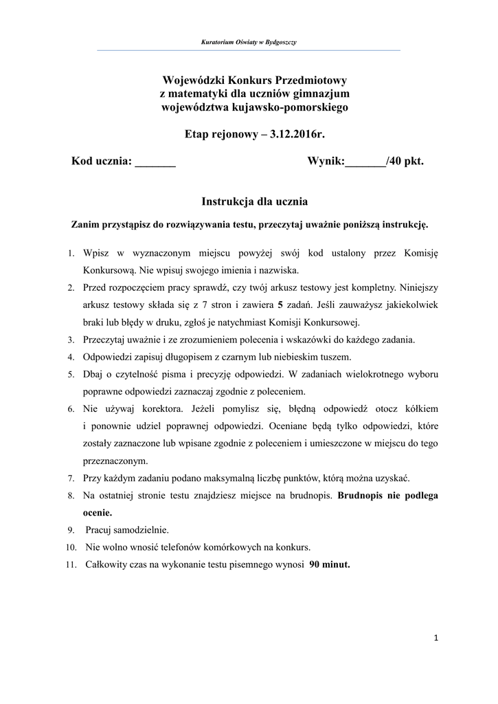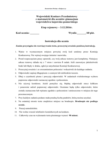 Kuratorium Oświaty w Bydgoszczy Wojewódzki Konkurs Przedmiotowy z matematyki dla uczniów gimnazjum województwa kujawsko-pomorskiego Etap rejonowy – 3.12.2016r. Kod ucznia: _______ Wynik:_______/40 pkt. Instrukcja dla ucznia Zanim przystąpisz do rozwiązywania testu, przeczytaj uważnie poniższą instrukcję. 1. Wpisz w wyznaczonym miejscu powyżej swój kod ustalony przez Komisję Konkursową. Nie wpisuj swojego imienia i nazwiska. 2. Przed rozpoczęciem pracy sprawdź, czy twój arkusz testowy jest kompletny. Niniejszy arkusz testowy składa się z 7 stron i zawiera 5 zadań. Jeśli zauważysz jakiekolwiek braki lub błędy w druku, zgłoś je natychmiast Komisji Konkursowej. 3. Przeczytaj uważnie i ze zrozumieniem polecenia i wskazówki do każdego zadania. 4. Odpowiedzi zapisuj długopisem z czarnym lub niebieskim tuszem. 5. Dbaj o czytelność pisma i precyzję odpowiedzi. W zadaniach wielokrotnego wyboru poprawne odpowiedzi zaznaczaj zgodnie z poleceniem. 6. Nie używaj korektora. Jeżeli pomylisz się, błędną odpowiedź otocz kółkiem i ponownie udziel poprawnej odpowiedzi. Oceniane będą tylko odpowiedzi, które zostały zaznaczone lub wpisane zgodnie z poleceniem i umieszczone w miejscu do tego przeznaczonym. 7. Przy każdym zadaniu podano maksymalną liczbę punktów, którą można uzyskać. 8. Na ostatniej stronie testu znajdziesz miejsce na brudnopis. Brudnopis nie podlega ocenie. 9. Pracuj samodzielnie. 10. Nie wolno wnosić telefonów komórkowych na konkurs. 11. Całkowity czas na wykonanie testu pisemnego wynosi 90 minut. 1 Kuratorium Oświaty w Bydgoszczy Zadanie 1. (8 punktów) Sporządź wykresy funkcji 𝑦 = 𝑥 − 3, 𝑦 = 𝑥 − 6 w jednym układzie współrzędnych. Wyznacz współrzędne punktów przecięcia prostych z osiami współrzędnych. Oblicz pole figury ograniczonej wykresami funkcji 𝑦 = 𝑥 − 3, 𝑦 = 𝑥 − 6 oraz osiami układu współrzędnych. Rozwiązanie: 2 Kuratorium Oświaty w Bydgoszczy Zadanie 2. (8 punktów) Autobus miał dojechać z miasta A do miasta B o wyznaczonej godzinie. Jeżeli autobus wyjedzie o godzinie 8.00 rano i będzie jechał ze średnią prędkością 50 km/h, to spóźni się do miasta B o jedną godzinę. Jeżeli wyruszy o 8.00 rano i pojedzie ze średnią prędkością 75km/h, to przybędzie na miejsce o dwie godziny za wcześnie. Oblicz: a) Odległość miasta B od miasta A. b) Z jaką średnią prędkością musi jechać autobus, aby przyjechać do miasta B o wyznaczonej godzinie. c) Godzinę planowanego przyjazdu autobusu do miasta B. Rozwiązanie: 3 Kuratorium Oświaty w Bydgoszczy Zadanie 3. (8 punktów) Bilety na pierwszy koncert młodzieżowej kapeli kosztowały 30zł. Na drugi koncert cenę biletów obniżono i wtedy na ten koncert przyszło o 60% więcej słuchaczy niż na pierwszy, a dochód ze sprzedaży biletów na drugi koncert wzrósł o jedną piątą. Oblicz, jaka jest cena biletu po obniżce. O ile procent obniżono cenę biletu? Rozwiązanie: 4 Kuratorium Oświaty w Bydgoszczy Zadanie 4. (8 punktów) Dany jest trójkąt ostrokątny 𝐴𝐵𝐶. Z Wierzchołka 𝐴 poprowadzono wysokość 𝐴𝐷. Wykaż, że |𝐵𝐷|2 − |𝐶𝐷|2 = |𝐴𝐵|2 − |𝐴𝐶|2 . Rozwiązanie: 5 Kuratorium Oświaty w Bydgoszczy Zadanie 5. (8 punktów) Długość promienia małego koła wynosi 1 (patrz rysunek). Znajdź długość średnicy dużego koła. Oblicz pole zacieniowanej figury. Rozwiązanie: 6 Kuratorium Oświaty w Bydgoszczy Brudnopis 7