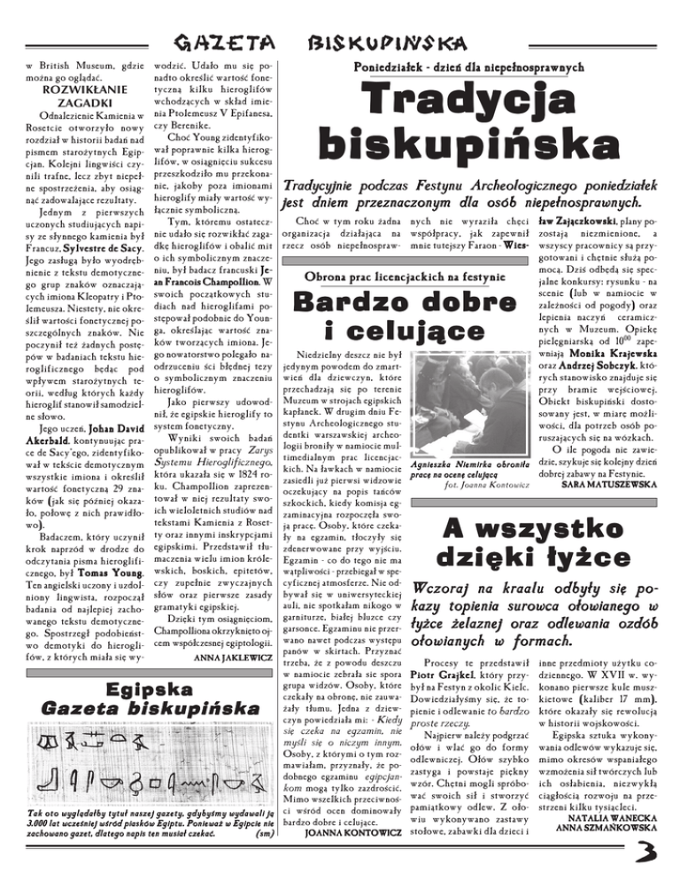 w British Museum, gdzie wodzić. Udało mu się po− można go oglądać. nadto określić wartość fone− tyczną kilku hieroglifów ROZWIKŁANIE wchodzących w skład imie− ZAGADKI Odnalezienie Kamienia w nia Ptolemeusz V Epifanesa, Rosetcie otworzyło nowy czy Berenike. Choć Young zidentyfiko− rozdział w historii badań nad wał poprawnie kilka hierog− pismem starożytnych Egip− lifów, w osiągnięciu sukcesu cjan. Kolejni lingwiści czy− nili trafne, lecz zbyt niepeł− przeszkodziło mu przekona− ne spostrzeżenia, aby osiąg− nie, jakoby poza imionami hieroglify miały wartość wy− nąć zadowalające rezultaty. Jednym z pierwszych łącznie symboliczną. Tym, któremu ostatecz− uczonych studiujących napi− nie udało się rozwikłać zaga− sy ze słynnego kamienia był dkę hieroglifów i obalić mit Francuz, Sylvestre de Sacy Sacy. o ich symbolicznym znacze− Jego zasługą było wyodręb− nienie z tekstu demotyczne− niu, był badacz francuski Je− Champollion. W go grup znaków oznaczają− an Francois Champollion cych imiona Kleopatry i Pto− swoich początkowych stu− lemeusza. Niestety, nie okre− diach nad hieroglifami po− ślił wartości fonetycznej po− stępował podobnie do Youn− szczególnych znaków. Nie ga, określając wartość zna− poczynił też żadnych postę− ków tworzących imiona. Je− pów w badaniach tekstu hie− go nowatorstwo polegało na− roglificznego będąc pod odrzuceniu ści błędnej tezy wpływem starożytnych te− o symbolicznym znaczeniu orii, według których każdy hieroglifów. Jako pierwszy udowod− hieroglif stanowił samodziel− nił, że egipskie hieroglify to ne słowo. system fonetyczny. Jego uczeń, Johan David Wyniki swoich badań Akerbald Akerbald, kontynuując pra− opublikował w pracy Zarys ce de Sacy’ego, zidentyfiko− wał w tekście demotycznym Systemu Hieroglificznego, wszystkie imiona i określił która ukazała się w 1824 ro− wartość fonetyczną 29 zna− ku. Champollion zaprezen− ków (jak się później okaza− tował w niej rezultaty swo− ło, połowę z nich prawidło− ich wieloletnich studiów nad tekstami Kamienia z Roset− wo). Badaczem, który uczynił ty oraz innymi inskrypcjami krok naprzód w drodze do egipskimi. Przedstawił tłu− odczytania pisma hieroglifi− maczenia wielu imion króle− cznego, był Tomas Young Young. wskich, boskich, epitetów, Ten angielski uczony i uzdol− czy zupełnie zwyczajnych niony lingwista, rozpoczął słów oraz pierwsze zasady badania od najlepiej zacho− gramatyki egipskiej. Dzięki tym osiągnięciom, wanego tekstu demotyczne− Champolliona okrzyknięto oj− go. Spostrzegł podobieńst− cem współczesnej egiptologii. wo demotyki do hierogli− fów, z których miała się wy− ANNA JAKLEWICZ Egipska Gazeta biskupińska Tak oto wyglądałby tytuł naszej gazety, gdybyśmy wydawali ją 3.000 lat wcześniej wśród piasków Egiptu. Ponieważ w Egipcie nie zachowano gazet, dlatego napis ten musiał czekać. (sm) Poniedziałek − dzień dla niepełnosprawnych Tradycja biskupińska Tradycyjnie podczas Festynu Archeologicznego poniedziałek jest dniem przeznaczonym dla osób niepełnosprawnych. Choć w tym roku żadna nych nie wyraziła chęci ław Zajączkowski Zajączkowski, plany po− organizacja działająca na współpracy, jak zapewnił zostają niezmienione, a rzecz osób niepełnospraw− mnie tutejszy Faraon − Wies− wszyscy pracownicy są przy− gotowani i chętnie służą po− mocą. Dziś odbędą się spec− Obrona prac licencjackich na festynie jalne konkursy: rysunku − na scenie (lub w namiocie w zależności od pogody) oraz lepienia naczyń ceramicz− nych w Muzeum. Opiekę pielęgniarską od 1000 zape− wniają Monika Krajewska Niedzielny deszcz nie był oraz Andrzej Sobczyk Sobczyk, któ− jedynym powodem do zmart− rych stanowisko znajduje się wień dla dziewczyn, które przechadzają się po terenie przy bramie wejściowej. Muzeum w strojach egipskich Obiekt biskupiński dosto− kapłanek. W drugim dniu Fe− sowany jest, w miarę możli− stynu Archeologicznego stu− wości, dla potrzeb osób po− dentki warszawskiej archeo− ruszających się na wózkach. logii broniły w namiocie mul− O ile pogoda nie zawie− timedialnym prac licencjac− Agnieszka Niemirka obroniła dzie, szykuje się kolejny dzień kich. Na ławkach w namiocie dobrej zabawy na Festynie. pracę na ocenę celującą zasiedli już pierwsi widzowie SARA MATUSZEWSKA fot. Joanna Kontowicz oczekujący na popis tańców szkockich, kiedy komisja eg− zaminacyjna rozpoczęła swo− ją pracę. Osoby, które czeka− ły na egzamin, tłoczyły się zdenerwowane przy wyjściu. Egzamin − co do tego nie ma wątpliwości − przebiegał w spe− cyficznej atmosferze. Nie od− bywał się w uniwersyteckiej Wczoraj na kraalu odbyły się po− auli, nie spotkałam nikogo w kazy topienia surowca ołowianego w garniturze, białej bluzce czy garsonce. Egzaminu nie przer− łyżce żelaznej oraz odlewania ozdób wano nawet podczas występu ołowianych w formach. panów w skirtach. Przyznać trzeba, że z powodu deszczu Procesy te przedstawił inne przedmioty użytku co− w namiocie zebrała sie spora Piotr Grajkel Grajkel, który przy− dziennego. W XVII w. wy− grupa widzów. Osoby, które był na Festyn z okolic Kielc. konano pierwsze kule musz− czekały na obronę, nie zauwa− Dowiedziałyśmy się, że to− kietowe (kaliber 17 mm), żały tłumu. Jedna z dziew− pienie i odlewanie to bardzo które okazały się rewolucją czyn powiedziała mi: − Kiedy proste rzeczy. w historii wojskowości. się czeka na egzamin, nie Najpierw należy podgrzać Egipska sztuka wykony− myśli się o niczym innym. ołów i wlać go do formy wania odlewów wykazuje się, Osoby, z którymi o tym roz− odlewniczej. Ołów szybko mimo okresów wspaniałego mawiałam, przyznały, że po− zastyga i powstaj