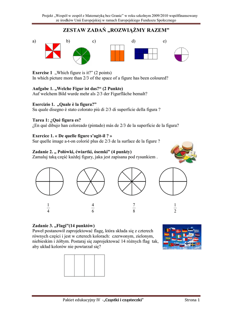 Projekt „Wespół w zespół z Matematyką bez Granic” w roku szkolnym 2009/2010 współfinansowany ze środków Unii Europejskiej w ramach Europejskiego Funduszu Społecznego ZESTAW ZADAŃ „ROZWIĄŻMY RAZEM” a) b) c) d) e) Exercise 1 „Which figure is it?” (2 points) In which picture more than 2/3 of the space of a figure has been coloured? Aufgabe 1. „Welche Figur ist das?“ (2 Punkte) Auf welchem Bild wurde mehr als 2/3 der Figurfläche bemalt? Esercizio 1. „Quale è la figura?” Su quale disegno è stato colorato più di 2/3 di superficie della figura ? Tarea 1: ¿Qué figura es? ¿En qué dibujo han coloreado (pintado) más de 2/3 de la superficie de la figura? Exercice 1. « De quelle figure s’agit-il ? » Sur quelle image a-t-on colorié plus de 2/3 de la surface de la figure ? Zadanie 2. „ Połówki, ćwiartki, ósemki” (4 punkty) Zamaluj taką część każdej figury, jaka jest zapisana pod rysunkiem . 1 4 4 6 7 8 1 2 Zadanie 3. „Flagi”(14 punktów) Paweł postanowił zaprojektować flagę, która składa się z czterech równych części i jest w czterech kolorach: czerwonym, zielonym, niebieskim i żółtym. Postaraj się zaprojektować 14 różnych flag tak, aby układ kolorów nie powtarzał się? Pakiet edukacyjny IV -„Cząstki i cząsteczki” Strona 1 Projekt „Wespół w zespół z Matematyką bez Granic” w roku szkolnym 2009/2010 współfinansowany ze środków Unii Europejskiej w ramach Europejskiego Funduszu Społecznego Zadanie 4. „Czekolada” ( 3 punkty) Basia dostała od babci trzy czekolady. Postanowiła podzielić się nimi ze swoimi przyjaciółkami: Asią, Danką i Helenką, tak aby wszystkie cztery dziewczynki otrzymały tyle samo kawałków czekolady. Pomóż Basi podzielić czekolady. Wytnij, podziel i naklej papierowe „czekolady” tak, aby każda dziewczynka otrzymała taka samą część. Zapisz ile kawałków i jaką część jednej czekolady otrzymała każda z dziewczynek Zadanie 5. „Tort” (3 punkty) Na przyjęcie urodzinowe Ali , mama kupiła dwa jednakowe torty. Każdy z nich podzielono na 12 równych kawałków. Po przyjęciu zostały 3 kawałki. a) Jaka część tortu została? b) Jaką część tortów zjedzono ? Zrób odpowiedni rysunek i odpowiedz na powyższe pytania. Zadanie 6. „ Zakupy” (3 punkty) Kasia z mamą wybrały się do sklepu po zakupy. Mama do koszyka włożyła 1/10 kg szynki, 2/10 kg polędwicy, 4/10 kg baleronu, 2/10 kg boczku. Ile kilogramów ważyły zakupy? Zadanie 7. „Zabawa z czasem” (5 punktów) Uzupełnij: 1 godziny to…………minut 2 1 godziny to………….minut 4 1 godziny to…………..minut 3 3 godziny to…………..minut 4 1 doby to………….minut 4 Zadanie 8. „ Łakomy Pawełek” (6 punktów) Paweł dostał od cioci na urodziny bombonierkę, w której było 48 czekoladek. W niedzielę Paweł zjadł połowę czekoladek, które były w bombonierce. W poniedziałek zjadł ¼ czekoladek, które mu zostały, a we wtorek 1/3 z tych , które jeszcze były w pudełku. Oblicz ile czekoladek zjadł Paweł w niedzielę, w poniedziałek i we wtorek ? Ile czekoladek zostało Pawłowi w bombonierce ? Pakiet edukacyjny IV -„Cząstki i cząsteczki” Strona 2 Projekt „Wespół w zespół z Matematyką bez Granic” w roku szkolnym 2009/2010 współfinansowany ze środków Unii Europejskiej w ramach Europejskiego Funduszu Społecznego ROZWIĄZANIA ORAZ SCHEMAT PUNKTACJI ZESTAWU „ Rozwiążmy razem” Zadanie 1. „Która to figura?” (2 punkty) Czynność Etapy rozwiązania zadania Liczba punktów A Przetłumaczenie zadania na język polski. Na którym rysunku pokolorowano więcej niż 2/3 powierzchni figury ? 1 B Podanie prawidłowej odpowiedzi: b). 1 Zadanie 2. „ Połówki, ćwiartki, ósemki” (4 punkty) Czynność A Etapy rozwiązania zadania Poprawne zakolorowanie części figury. Przyznajemy po jednym punkcie za każdy poprawny przykład. Liczba punktów 0-4 Zadanie 3. „Flagi”(14 punktów) Przykładowe „kompozycje”: Jeśli uczniowie wśród 14 zaprojektowanych „flag” otrzymają takie, które spełniają warunki zadania, a nie ma ich w powyższych przykładach to oczywiście przyznajemy punkty. Czynność A Etapy rozwiązania zadania Zaprojektowanie 14 różnych flag o odpowiednim układzie kolorów. Przyznajemy po jednym punkcie za każdą kompozycję. Pakiet edukacyjny IV -„Cząstki i cząsteczki” Liczba punktów 0-14 Strona 3 Projekt „Wespół w zespół z Matematyką bez Granic” w roku szkolnym 2009/2010 współfinansowany ze środków Unii Europejskiej w ramach Europejskiego Funduszu Społecznego Zadanie 4. „Czekolada” (3 punkty) Czynność Etapy rozwiązania zadania Liczba punktów A Podzielenie czekolad i naklejenie odpowiedniej liczby kawałków osobno dla każdej dziewczynki. 1 B Obliczenie ile kawałków czekolady otrzyma każda dziewczynka. 36 : 4 = 9 1 C Zapisanie jaką część czekolady otrzyma każda dziewczynka. Każda dziewczynka otrzyma 3/4 czekolady. 1 Zadanie 5. „Tort” ( 3 punkty) Czynność A B C Etapy rozwiązania zadania Zrobienie odpowiedniego rysunku ilustrującego treść zadania. Określenie jaka część tortu została. Została ¼ część tortu Określenie jaką część tortów zjedzono. Zjedzono jeden cały i ¾ tortu lub zjedzono 21/24 kawałków tortów. Liczba punktów 1 1 1 Zadanie 6. „Zakupy”(3 punkty) Czynność A B Etapy rozwiązania zadania Podanie prawidłowego zapisu 1/10 + 2/10 + 4/10 + 2/10 = Podanie prawidłowego wyniku 9/10 Podanie prawidłowej odpowiedzi : Zakupy ważyły 9/10 kg. C Liczba punktów 1 1 1 Zadanie 7. „Zabawa z czasem” (5 punktów) Uzupełnij: 1 1 1 godziny to 30 minut, godziny to15 minut, godziny to 20 minut 2 4 3 3 1 godziny to 45 minut, doby to 360 minut 4 4 Liczba Czynność Etapy rozwiązania zadania punktów Prawidłowa zamiana części godziny i doby na minuty. A Przyznajemy 0-5 Zadanie 8. „Łakomy Pawełek” (6 punktów) Czynność A B C D Etapy roz