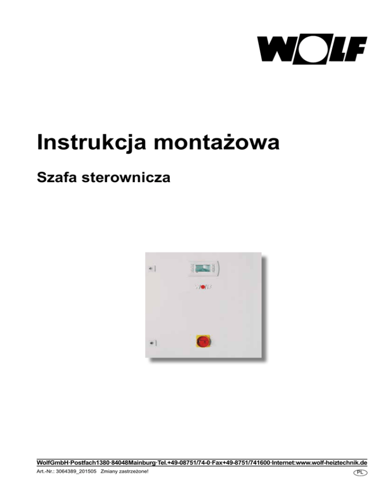 Instrukcja montażowa Szafa sterownicza WolfGmbH·Postfach1380·84048Mainburg·Tel.+49-08751/74-0·Fax+49-8751/741600·Internet:www.wolf-heiztechnik.de Art.-Nr.: 3064389_201505 Zmiany zastrzeżone! PL Instrukcja montażowa szafy sterowniczej Dokumentacja dodatkowa Obowiązuje także treść instrukcji wszystkich zastosowanych modułów dodatkowych. Przechowywanie dokumentacji Operator lub użytkownik urządzenia przejmuje odpowiedzialność za prawidłowe przechowywanie wszystkich instrukcji. → Przekaż arkusz instruktażowy oraz wszystkie inne obowiązujące dokumenty kolejnemu właścicielowi. W niniejszej instrukcji obsługi zastosowano następujące symbole i znaki. Istotne zalecenia dotyczą bezpieczeństwa osób oraz bezpieczeństwa eksploatacji urządzeń. Zastosowane symbole i wskazówki ostrzegawcze Wskazówka dotycząca bezpieczeństwa oznacza konieczność dostosowania się do danego zalecenia w celu uniknięcia obrażeń ciała osób oraz uszkodzeń urządzenia. Zagrożenie porażeniem elektrycznym w wyniku kontaktu z elementami znajdującymi się pod napięciem. Uwaga: Przed zdjęciem obudowy wyłącz przełącznik główny. W żadnym przypadku nie dotykaj elementów elektrycznych przy włączonym przełączniku głównym. Grozi to porażeniem elektrycznym wiążącym się z obrażeniami ciała lub śmiercią. Styki przyłączeniowe pozostają pod napięciem nawet po wyłączeniu przełącznika głównego. Uwaga „Wskazówka” oznacza informację techniczną, podaną w celu uniknięcia uszkodzenia urządzenia. Zakres obowiązywania instrukcji Strona ze wskazówkami dotyczy fabrycznych i atestowanych kombinacji niskonapięciowych urządzeń sterujących, których konstrukcja i wykonanie odpowiada normie DIN EN 61439-1. Transport Kombinacja urządzeń sterujących jest zazwyczaj dostarczana jako jedna przesyłka. Po otrzymaniu przesyłki sprawdź jej zgodność z dokumentacją dostawy. W przypadku stwierdzenia braków, natychmiast zgłoś stan rzeczywisty przesyłki wraz z przedsiębiorstwem transportowym. W przypadku stwierdzenia uszkodzeń zaangażuj rzeczoznawcę i sporządź protokół z dokumentacją fotograficzną dotyczącą zakresu i przyczyny uszkodzeń. Wyładuj przesyłkę w miejscu montażu na suche, czyste i równe podłoże. Zwróć uwagę i utrzymaj oryginalne położenie elementów. Nie odkładaj na bok, nie ustawiaj na stronie górnej! W przypadku odchyłki warunków transportowych, magazynowych lub panujących w trakcie ustawiania od zalecanych wartości temperatury lub wilgotności, konieczne jest ustalenie z firmą Wolf odpowiednich kroków. 2 3064389_201505 Instrukcja montażowa szafy sterowniczej – Zespół urządzeń sterujących zamontuj do ściany w pozycji pionowej, stosując odpowiednie elementy montażowe. Zwróć uwagę na prawidłowe ułożenie komponentów (opisy muszą być ułożone poziomo oraz być czytelne). Instalacja/przekazanie do eksploatacji –Moduł obsługowy musi być zamontowany na wysokości umożliwiającej łatwą obsługę, tzn. linia środkowa musi znajdować się od 0,2 m do 2 m powyżej powierzchni podłoża. – Zgodnie z normą DIN EN 50110-1, instalacja oraz przekazanie urządzenia do eksploatacji może być przeprowadzone wyłącznie przez wykwalifikowanych elektryków. – Przyłącze elektryczne sterowników musi być przystosowane do systemu TN-C-S. –W trakcie instalacji zastosuj się do zaleceń bezpieczeństwa opisanych w IEC 60364-4-41. –Zastosuj się także do lokalnych przepisów dotyczących instalacji elektrycznych. –Zwróć uwagę na dane techniczne (patrz schemat elektryczny). –Przewodniki doprowadzane z zewnątrz muszą być wykonane z miedzi. –W przypadku przyłączy elektrycznych, zabezpieczenie przed naciąganiem przewodów musi być zapewnione po stronie budynku. –Wszystkie śruby łączące i stykowe oraz wolne kontakty muszą być dokręcone (możliwe poluzowanie w trakcie transportu). –Przewody czujników, silników lub przewody sterowania 4 V nie mogą być dłuższe niż 50 m (nie układaj raz z przewodami 230/400 V lub zastosuj przewody ekranowane). –Ustaw termiczne elementy zabezpieczające silników zgodnie z wartościami nominalnymi prądów. –Usuwanie, mostkowanie lub wyłączanie jakichkolwiek elementów zabezpieczających oraz nadzorujących jest zabronione. Wskazówki ostrzegawcze –Eksploatacja urządzenia dopuszczalna jest tylko i wyłącznie w jego nienagannym technicznie stanie. Natychmiast usuwaj wszelkie usterki lub uszkodzenia, które mogą mieć wpływ na bezpieczeństwo. –Sterowniki nie mogą być ustawiane w miejscach narażonych na działanie ognia lub zagrożonych wybuchem. Uwaga Serwis/naprawa –W celu zabezpieczenia urządzenia przeciw zamarzaniu, główny wyłącznik Q1 nie może być wyłączany. –Regularnie sprawdzaj prawidłowość działania urządzeń elektrycznych. –Usterki i uszkodzenia mogą być usuwane wyłącznie przez wykwalifikowanych elektryków. –Uszkodzone elementy wymieniaj wyłącznie na oryginalne części zamienne firmy Wolf. W przypadku dokonania zmian technicznych dotyczących elementów układu sterowania firmy Wolf, producent nie ponosi żadnej odpowiedzialności za powstałe w wyniku tych zmian szkody. 3064389_201505 3 Instrukcja montażowa szafy sterowniczej Utylizacja Utylizacja uszkodzonych komponentów systemowych lub całego systemu po zakończeniu eksploatacji musi być wykonywana z zachowaniem następujących zaleceń: Utylizację przeprowadzaj zgodnie z zasadą rozdzielania utylizowanych materiałów. Celem utylizacji jest jak największy odzysk surowców przy jak najmniejszym obciążeniu środowiska naturalnego. W żadnym wypadku nie wyrzucaj złomu elektrycznego lub elektronicznego do odpadów, lecz oddawaj takie przedmioty do odpowiednich punktów utylizacji. Utylizację przeprowadzaj zgodnie z aktualnym stanem technologii ochrony środowiska, odzysku materiałów oraz utylizacji. Opis urządzenia Sterownik