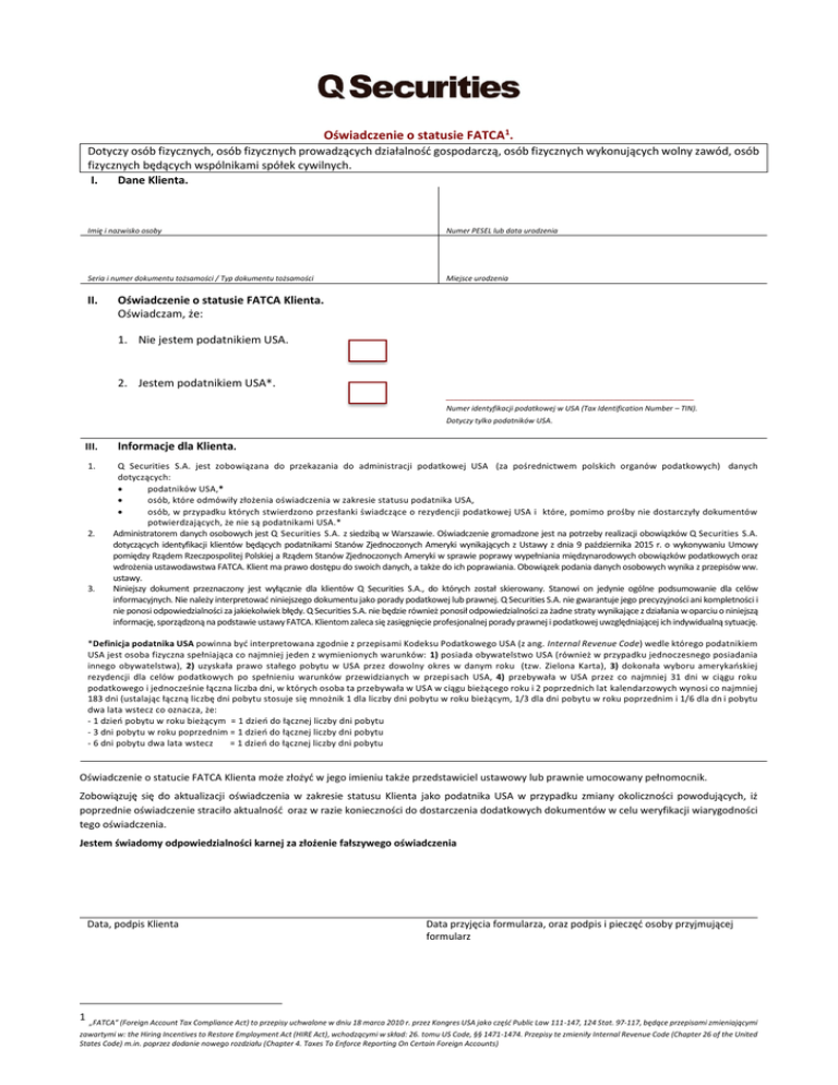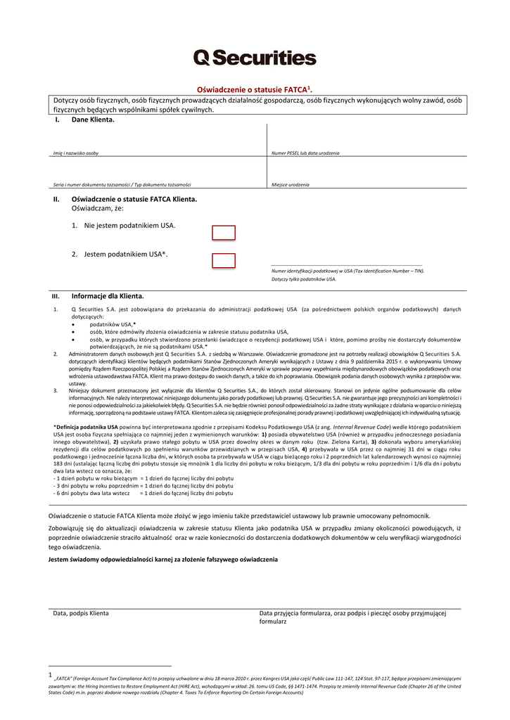 Oświadczenie o statusie FATCA1. Dotyczy osób fizycznych, osób fizycznych prowadzących działalność gospodarczą, osób fizycznych wykonujących wolny zawód, osób fizycznych będących wspólnikami spółek cywilnych. I. Dane Klienta. Imię i nazwisko osoby Numer PESEL lub data urodzenia Seria i numer dokumentu tożsamości / Typ dokumentu tożsamości Miejsce urodzenia II. Oświadczenie o statusie FATCA Klienta. Oświadczam, że: 1. Nie jestem podatnikiem USA. 2. Jestem podatnikiem USA*. ___________________________________________________________ Numer identyfikacji podatkowej w USA (Tax Identification Number – TIN). Dotyczy tylko podatników USA. III. 1. 2. 3. Informacje dla Klienta. Q Securities S.A. jest zobowiązana do przekazania do administracji podatkowej USA (za pośrednictwem polskich organów podatkowych) danych dotyczących: podatników USA,* osób, które odmówiły złożenia oświadczenia w zakresie statusu podatnika USA, osób, w przypadku których stwierdzono przesłanki świadczące o rezydencji podatkowej USA i które, pomimo prośby nie dostarczyły dokumentów potwierdzających, że nie są podatnikami USA.* Administratorem danych osobowych jest Q Securities S.A. z siedzibą w Warszawie. Oświadczenie gromadzone jest na potrzeby realizacji obowiązków Q Securities S.A. dotyczących identyfikacji klientów będących podatnikami Stanów Zjednoczonych Ameryki wynikających z Ustawy z dnia 9 października 2015 r. o wykonywaniu Umowy pomiędzy Rządem Rzeczpospolitej Polskiej a Rządem Stanów Zjednoczonych Ameryki w sprawie poprawy wypełniania międzynarodowych obowiązków podatkowych oraz wdrożenia ustawodawstwa FATCA. Klient ma prawo dostępu do swoich danych, a także do ich poprawiania. Obowiązek podania danych osobowych wynika z przepisów ww. ustawy. Niniejszy dokument przeznaczony jest wyłącznie dla klientów Q Securities S.A., do których został skierowany. Stanowi on jedynie ogólne podsumowanie dla celów informacyjnych. Nie należy interpretować niniejszego dokumentu jako porady podatkowej lub prawnej. Q Securities S.A. nie gwarantuje jego precyzyjności ani kompletności i nie ponosi odpowiedzialności za jakiekolwiek błędy. Q Securities S.A. nie będzie również ponosił odpowiedzialności za żadne straty wynikające z działania w oparciu o niniejszą informację, sporządzoną na podstawie ustawy FATCA. Klientom zaleca się zasięgnięcie profesjonalnej porady prawnej i podatkowej uwzględniającej ich indywidualną sytuację. *Definicja podatnika USA powinna być interpretowana zgodnie z przepisami Kodeksu Podatkowego USA (z ang. Internal Revenue Code) wedle którego podatnikiem USA jest osoba fizyczna spełniająca co najmniej jeden z wymienionych warunków: 1) posiada obywatelstwo USA (również w przypadku jednoczesnego posiadania innego obywatelstwa), 2) uzyskała prawo stałego pobytu w USA przez dowolny okres w danym roku (tzw. Zielona Karta), 3) dokonała wyboru amerykańskiej rezydencji dla celów podatkowych po spełnieniu warunków przewidzianych w przepi sach USA, 4) przebywała w USA przez co najmniej 31 dni w ciągu roku podatkowego i jednocześnie łączna liczba dni, w których osoba ta przebywała w USA w ciągu bieżącego roku i 2 poprzednich lat kalendarzowych wynosi co najmniej 183 dni (ustalając łączną liczbę dni pobytu stosuje się mnożnik 1 dla liczby dni pobytu w roku bieżącym, 1/3 dla dni pobytu w roku poprzednim i 1/6 dla dn i pobytu dwa lata wstecz co oznacza, że: - 1 dzień pobytu w roku bieżącym = 1 dzień do łącznej liczby dni pobytu - 3 dni pobytu w roku poprzednim = 1 dzień do łącznej liczby dni pobytu - 6 dni pobytu dwa lata wstecz = 1 dzień do łącznej liczby dni pobytu Oświadczenie o statucie FATCA Klienta może złożyć w jego imieniu także przedstawiciel ustawowy lub prawnie umocowany pełnomocnik. Zobowiązuję się do aktualizacji oświadczenia w zakresie statusu Klienta jako podatnika USA w przypadku zmiany okoliczności powodujących, iż poprzednie oświadczenie straciło aktualność oraz w razie konieczności do dostarczenia dodatkowych dokumentów w celu weryfikacji wiarygodności tego oświadczenia. Jestem świadomy odpowiedzialności karnej za złożenie fałszywego oświadczenia Data, podpis Klienta 1 Data przyjęcia formularza, oraz podpis i pieczęć osoby przyjmującej formularz „FATCA” (Foreign Account Tax Compliance Act) to przepisy uchwalone w dniu 18 marca 2010 r. przez Kongres USA jako część Public Law 111-147, 124 Stat. 97-117, będące przepisami zmieniającymi zawartymi w: the Hiring Incentives to Restore Employment Act (HIRE Act), wchodzącymi w skład: 26. tomu US Code, §§ 1471-1474. Przepisy te zmieniły Internal Revenue Code (Chapter 26 of the United States Code) m.in. poprzez dodanie nowego rozdziału (Chapter 4. Taxes To Enforce Reporting On Certain Foreign Accounts)