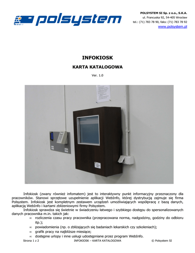 POLSYSTEM SI Sp. z o.o., S.K.A. ul. Francuska 92, 54-405 Wrocław tel.: (71) 783 78 90, faks: (71) 783 78 92 www.polsystem.pl INFOKIOSK KARTA KATALOGOWA Ver. 1.0 Infokiosk (zwany również infomatem) jest to interaktywny punkt informacyjny przeznaczony dla pracowników. Stanowi sprzętowe uzupełnienie aplikacji WebInfo, której dystrybucją zajmuje się firma Polsystem. Infokiosk jest kompletnym zestawem urządzeń umożliwiających współpracę z bazą danych, aplikacją WebInfo i kartami zbliżeniowymi firmy Polsystem. Infokiosk sprawdza się świetnie w świadczeniu łatwego i szybkiego dostępu do spersonalizowanych danych pracownika m.in. takich jak: • rozliczenia czasu pracy pracownika (przepracowana norma, nadgodziny, godziny do odbioru itp.); • powiadomienia (np. o zbliżających się badaniach lekarskich czy szkoleniach); • grafik pracy na najbliższe miesiące; • dostępne urlopy i inne usługi udostępniane przez program WebInfo. Strona 1 z 2 INFOKIOSK – KARTA KATALOGOWA © Polsystem SI Infokiosk przystosowany jest do pracy ciągłej, nie wymaga żadnej obsługi, a ewentualne zmiany konfiguracji mogą być wykonywane przez administratora w sposób zdalny. Dostarczany jest w estetycznej, zamykanej na klucz obudowie, która umożliwia montaż na ścianie. Dane techniczne: • • • • • • • • • • • estetyczna obudowa (płyta wiórowa laminowana), z możliwością montażu na ścianie 17-calowy dotykowy ekran LCD rozdzielczość ekranu: 1280x1024 pikseli wbudowany czytnik kart zbliżeniowych: UNIQUE lub MIFARE akustyczna sygnalizacja odczytu karty interfejs sieciowy Ethernet System operacyjny: Microsoft Windows® zdalna administracja, za pomocą wybranej technologii (np. VNC, RDP, VPN + RDP) temperatura pracy: +10°C do +35°C zasilanie 230V z podtrzymaniem bateryjnym (wbudowany UPS) wymiary zewnętrzne 65cm x 49,5cm x 20cm Strona 2 z 2 INFOKIOSK – KARTA KATALOGOWA © Polsystem SI