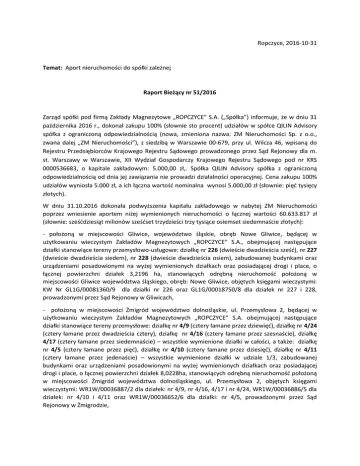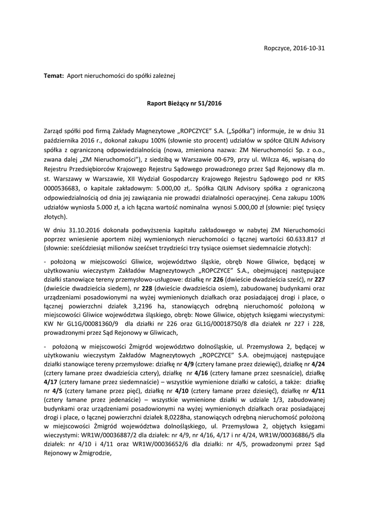 Ropczyce, 2016-10-31 Temat: Aport nieruchomości do spółki zależnej Raport Bieżący nr 51/2016 Zarząd spółki pod firmą Zakłady Magnezytowe „ROPCZYCE” S.A. („Spółka”) informuje, że w dniu 31 października 2016 r., dokonał zakupu 100% (słownie sto procent) udziałów w spółce QILIN Advisory spółka z ograniczoną odpowiedzialnością (nowa, zmieniona nazwa: ZM Nieruchomości Sp. z o.o., zwana dalej „ZM Nieruchomości”), z siedzibą w Warszawie 00-679, przy ul. Wilcza 46, wpisaną do Rejestru Przedsiębiorców Krajowego Rejestru Sądowego prowadzonego przez Sąd Rejonowy dla m. st. Warszawy w Warszawie, XII Wydział Gospodarczy Krajowego Rejestru Sądowego pod nr KRS 0000536683, o kapitale zakładowym: 5.000,00 zł,. Spółka QILIN Advisory spółka z ograniczoną odpowiedzialnością od dnia jej zawiązania nie prowadzi działalności operacyjnej. Cena zakupu 100% udziałów wyniosła 5.000 zł, a ich łączna wartość nominalna wynosi 5.000,00 zł (słownie: pięć tysięcy złotych). W dniu 31.10.2016 dokonała podwyższenia kapitału zakładowego w nabytej ZM Nieruchomości poprzez wniesienie aportem niżej wymienionych nieruchomości o łącznej wartości 60.633.817 zł (słownie: sześćdziesiąt milionów sześćset trzydzieści trzy tysiące osiemset siedemnaście złotych): - położoną w miejscowości Gliwice, województwo śląskie, obręb Nowe Gliwice, będącej w użytkowaniu wieczystym Zakładów Magnezytowych „ROPCZYCE” S.A., obejmującej następujące działki stanowiące tereny przemysłowo-usługowe: działkę nr 226 (dwieście dwadzieścia sześć), nr 227 (dwieście dwadzieścia siedem), nr 228 (dwieście dwadzieścia osiem), zabudowanej budynkami oraz urządzeniami posadowionymi na wyżej wymienionych działkach oraz posiadającej drogi i place, o łącznej powierzchni działek 3,2196 ha, stanowiących odrębną nieruchomość położoną w miejscowości Gliwice województwa śląskiego, obręb: Nowe Gliwice, objętych księgami wieczystymi: KW Nr GL1G/00081360/9 dla działki nr 226 oraz GL1G/00018750/8 dla działek nr 227 i 228, prowadzonymi przez Sąd Rejonowy w Gliwicach, - położoną w miejscowości Żmigród województwo dolnośląskie, ul. Przemysłowa 2, będącej w użytkowaniu wieczystym Zakładów Magnezytowych „ROPCZYCE” S.A. obejmującej następujące działki stanowiące tereny przemysłowe: działkę nr 4/9 (cztery łamane przez dziewięć), działkę nr 4/24 (cztery łamane przez dwadzieścia cztery), działkę nr 4/16 (cztery łamane przez szesnaście), działkę 4/17 (cztery łamane przez siedemnaście) – wszystkie wymienione działki w całości, a także: działkę nr 4/5 (cztery łamane przez pięć), działkę nr 4/10 (cztery łamane przez dziesięć), działkę nr 4/11 (cztery łamane przez jedenaście) – wszystkie wymienione działki w udziale 1/3, zabudowanej budynkami oraz urządzeniami posadowionymi na wyżej wymienionych działkach oraz posiadającej drogi i place, o łącznej powierzchni działek 8,0228ha, stanowiących odrębną nieruchomość położoną w miejscowości Żmigród województwa dolnośląskiego, ul. Przemysłowa 2, objętych księgami wieczystymi: WR1W/00036887/2 dla działek: nr 4/9, nr 4/16, 4/17 i nr 4/24, WR1W/00036886/5 dla działek: nr 4/10 i 4/11 oraz WR1W/00036652/6 dla działki: nr 4/5, prowadzonymi przez Sąd Rejonowy w Żmigrodzie, - położoną w miejscowości Chrzanów będących w użytkowaniu wieczystym Zakładów Magnezytowych „ROPCZYCE” S.A., obejmujących działki stanowiące tereny przemysłowe o oznaczeniu „Ba”: a/ nr 829/200 (osiemset dwadzieścia dziewięć łamane przez dwieście), nr 829/207 (osiemset dwadzieścia dziewięć łamane przez dwieście siedem), nr 829/223 (osiemset dwadzieścia dziewięć łamane przez dwieście dwadzieścia trzy), nr 829/225 (osiemset dwadzieścia dziewięć łamane przez dwieście dwadzieścia pięć), nr 829/232 (osiemset dwadzieścia dziewięć łamane przez dwieście trzydzieści dwa), nr 829/236 (osiemset dwadzieścia dziewięć łamane przez dwieście trzydzieści sześć), zabudowanej budynkami oraz urządzeniami posadowionymi na wyżej wymienionych działkach oraz posiadającej drogi i place o łącznej powierzchni działek 5,8213 ha, stanowiących odrębną nieruchomość położoną w miejscowości Chrzanów województwa małopolskiego, obręb: Kościelec, objętej księgą wieczystą KW Nr KR1C/00048679/0 prowadzoną przez Sąd Rejonowy w Chrzanowie. b/ nr 829/233 (osiemset dwadzieścia dziewięć łamane przez dwieście trzydzieści trzy) o powierzchni 423 m2 , zabudowana budynkiem rozdzielni energetycznej SO2, objętej księgą wieczystą NR KW KR1C/00077936/2; c/ nr 4634 (czterdzieści sześć trzydzieści cztery) o powierzchni 2.547 m2, objętej księgą wieczystą KW KR1C/00050840/7; d/ udziału we współwłasności w ½ części działki nr 829/204 (osiemset dwadzieścia dziewięć łamane przez dwieście cztery) o powierzchni 532 m2, zabudowana budynkiem rozdzielni energetycznej SO1, objęta księgą wieczystą NR KW KR1C/00059478/1. Wniesienie nieruchomości aportem było możliwe na podstawie zgody udzielonej uchwałą nr 3, 4 i 6 w dniu 14 października 2016 roku przez Nadzwyczajne Walne Zgromadzenie Spółki, o której spółka informowała w raporcie bieżącym nr 49/2016 z dnia 14 października 2016r. Kapitał zakładowy ZM Nieruchomości pokryty dzieli się na kapitał zakładowy w kwocie 1.005.000 złotych (słownie: jeden milion pięć tysięcy złotych) oraz na kapitał zapasowy w kwocie 59 633 817 złotych (słownie pięćdziesiąt dziewięć milionów sześćset trzydzieści trzy tysiące osiemset siedemnaście złotych). Wniesienie aportem wyżej wymienionych nieruchomości do spółki celowej ZM Nieruchomości jest etapem systematycznie realizowanego procesu restrukturyzacji działalności Spółki w ramach kluczowych obszarów funkcjonowania, której celem jest dostosowanie posiadanych z