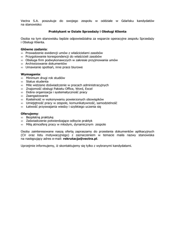 Vectra S.A. poszukuje do swojego zespołu w oddziale w Gdańsku kandydatów na stanowisko: Praktykant w Dziale Sprzedaży i Obsługi Klienta Osoba na tym stanowisku będzie odpowiedzialna za wsparcie operacyjne zespołu Sprzedaży i Obsługi Klienta. Główne zadania: • Prowadzenie ewidencji umów z właścicielami zasobów • Przygotowanie korespondencji do właścicieli zasobów • Obsługa firm podwykonawczych w zakresie przyjmowania umów • Archiwizowanie dokumentów • Umawianie spotkań, inne prace biurowe Wymagania: • Minimum drugi rok studiów • Status studenta • Mile widziane doświadczenie w pracach administracyjnych • Znajomość obsługi Pakietu Office, Word, Excel • Dobra organizacja i systematyczność pracy • Zaangażowanie • Rzetelność w wykonywaniu powierzonych obowiązków • Umiejętność pracy w zespole, komunikatywność, samodzielność • Łatwość przyswajania wiedzy i szybkiego uczenia się Oferujemy: • Bezpłatną praktykę • Zaświadczenie potwierdzające odbycie praktyk • Miłą atmosferę pracy w młodym, dynamicznym zespole Osoby zainteresowane naszą ofertą zapraszamy do przesłania dokumentów aplikacyjnych (CV oraz listu motywacyjnego) z zaznaczeniem w temacie maila nazwy stanowiska na następujący adres e-mail: [email protected]. Uprzejmie informujemy, iż skontaktujemy się tylko z wybranymi kandydatami.