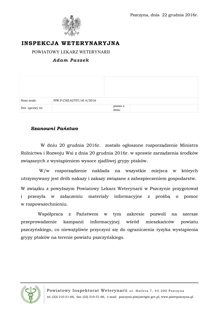 Pszczyna, dnia 22 grudnia 2016r. INSPEKCJA WETERYNARYJNA POWIATOWY LEKARZ WETERYNARII Adam Paszek Nasz znak: PIW.P.CHZ.62707/AI-4/2016 pismo z dnia: Dot. sprawy nr: Szanowni Państwo W dniu 20 grudnia 2016r. zostało ogłoszone rozporządzenie Ministra Rolnictwa i Rozwoju Wsi z dnia 20 grudnia 2016r. w sprawie zarządzenia środków związanych z wystąpieniem wysoce zjadliwej grypy ptaków. W/w rozporządzenie nakłada na wszystkie miejsca w których utrzymywany jest drób nakazy i zakazy związane z zabezpieczeniem gospodarstw. W związku z powyższym Powiatowy Lekarz Weterynarii w Pszczynie przygotował i przesyła w załączeniu materiały informacyjne z prośbą o pomoc w rozpowszechnieniu. Współpraca przeprowadzenie z Państwem kampanii w tym informacyjnej zakresie wśród pozwoli na mieszkańców szersze powiatu pszczyńskiego, co niewątpliwie przyczyni się do ograniczenia ryzyka wystąpienia grypy ptaków na terenie powiatu pszczyńskiego. Powiatowy Inspektorat Weterynarii ul. Hallera 7 , 43-200 Pszczyna tel.:(32) 210-51-66, fax: (32) 210-51-66, e-mail: [email protected], www.piwetpszczyna.pl