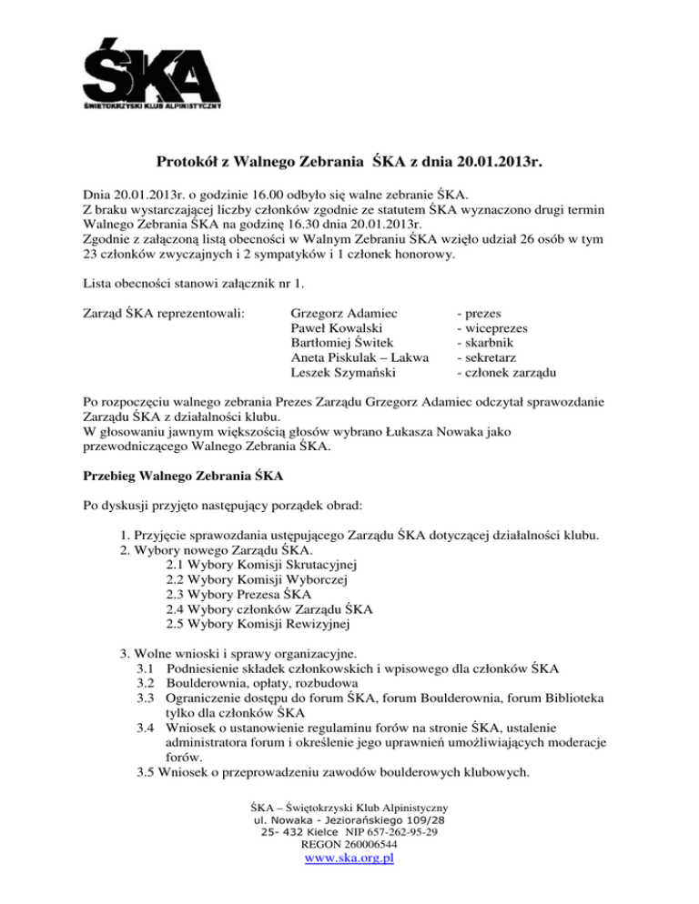 Protokół z Walnego Zebrania ŚKA z dnia 20.01.2013r. Dnia 20.01.2013r. o godzinie 16.00 odbyło się walne zebranie ŚKA. Z braku wystarczającej liczby członków zgodnie ze statutem ŚKA wyznaczono drugi termin Walnego Zebrania ŚKA na godzinę 16.30 dnia 20.01.2013r. Zgodnie z załączoną listą obecności w Walnym Zebraniu ŚKA wzięło udział 26 osób w tym 23 członków zwyczajnych i 2 sympatyków i 1 członek honorowy. Lista obecności stanowi załącznik nr 1. Zarząd ŚKA reprezentowali: Grzegorz Adamiec Paweł Kowalski Bartłomiej Świtek Aneta Piskulak – Lakwa Leszek Szymański - prezes - wiceprezes - skarbnik - sekretarz - członek zarządu Po rozpoczęciu walnego zebrania Prezes Zarządu Grzegorz Adamiec odczytał sprawozdanie Zarządu ŚKA z działalności klubu. W głosowaniu jawnym większością głosów wybrano Łukasza Nowaka jako przewodniczącego Walnego Zebrania ŚKA. Przebieg Walnego Zebrania ŚKA Po dyskusji przyjęto następujący porządek obrad: 1. Przyjęcie sprawozdania ustępującego Zarządu ŚKA dotyczącej działalności klubu. 2. Wybory nowego Zarządu ŚKA. 2.1 Wybory Komisji Skrutacyjnej 2.2 Wybory Komisji Wyborczej 2.3 Wybory Prezesa ŚKA 2.4 Wybory członków Zarządu ŚKA 2.5 Wybory Komisji Rewizyjnej 3. Wolne wnioski i sprawy organizacyjne. 3.1 Podniesienie składek członkowskich i wpisowego dla członków ŚKA 3.2 Boulderownia, opłaty, rozbudowa 3.3 Ograniczenie dostępu do forum ŚKA, forum Boulderownia, forum Biblioteka tylko dla członków ŚKA 3.4 Wniosek o ustanowienie regulaminu forów na stronie ŚKA, ustalenie administratora forum i określenie jego uprawnień umożliwiających moderacje forów. 3.5 Wniosek o przeprowadzeniu zawodów boulderowych klubowych. ŚKA – Świętokrzyski Klub Alpinistyczny ul. Nowaka - Jeziorańskiego 109/28 25- 432 Kielce NIP 657-262-95-29 REGON 260006544 www.ska.org.pl 3.6 Wniosek o ubezpieczenie Zarządu ŚKA od odpowiedzialności cywilnej 4. Głosowanie nad przyjęciem nowych członków ŚKA 5. Zakończenie Walnego Zebrania ŚKA Przebieg obrad i głosowań Głosowania jawne Walnego Zebrania ŚKA odbywały się przez podniesienie ręki. Głosowania tajne Walnego Zebrania ŚKA odbywały się przez zaznaczenie odpowiedniego numeru kandydata na karcie lub podaniu jednej z odpowiedzi: tak, nie ,wstrzymałem(am) się. Przed każdym głosowaniem tajnym były szczegółowo określano zasady głosowania. Nad prawidłowym przebiegiem głosowań kontrolę sprawowały Komisje Skrutacyjna i Komisja Wyborcza. Zgodnie ze statutem ŚKA głosować mogli członkowie zwyczajni. Ad 1 Po odczytaniu sprawozdania Zarządu ŚKA z działalności klubu członkowie ŚKA w głosowaniu jawnym przyjęli jednogłośnie sprawozdanie Zarządu. Ad 2.1 Zgłoszono następujących kandydatów do Komisji Skrutacyjnej: - Leszek Janowski - Grzegorz Nocuń - Szymon Kuszewski Kandydatury przyjęto jednogłośnie większością głosów w głosowaniu jawnym Ad 2.2. Zgłoszono następujących kandydatów do Komisji Wyborczej: - Przemysław Klentak - Karol Dąbrowski - Teresa Dąbrowska Kandydatury przyjęto jednogłośnie większością głosów. Ad 2.3 Członkowie ŚKA zgłosili następujące kandydatury na stanowisko Prezesa ŚKA: - Grzegorz Adamiec - Karol Dąbrowski - Leszek Szamański - Przemysław Klentak - Paweł Kowalski - wyraził zgodą na kandydowanie - nie wyraził zgody na kandydowanie - nie wyraził zgody na kandydowanie - nie wyraził zgody na kandydowanie - nie wyraził zgody na kandydowanie W głosowaniu tajnym wybrano na stanowisko prezesa ŚKA Grzegorza Adamca większością głosów przy jednym głosie wstrzymującym i braku głosów przeciwnych. ŚKA – Świętokrzyski Klub Alpinistyczny ul. Nowaka - Jeziorańskiego 109/28 25- 432 Kielce NIP 657-262-95-29 REGON 260006544 www.ska.org.pl Ad 2.4 Członkowie ŚKA zgłosili następujące kandydatury członków Zarządu ŚKA: - Bartosz Świtek - Karol Dąbrowski - Leszek Szymański - Artur Niźnik - Przemysław Klentak - Paweł Kowalski - Aneta Piskulak-Lakwa - Jakub Lakwa - Łukasz Nowak - wyraził zgodę na kandydowanie - wyraził zgodę na kandydowanie - nie wyraził zgody na kandydowanie - wyraził zgodę na kandydowanie - wyraził zgodę na kandydowanie - wyraził zgodę na kandydowanie - nie wyraziła zgody na kandydowanie - wyraził zgodę na kandydowanie - nie wyraził zgody na kandydowanie Po dyskusji poddano pod głosowanie wniosek aby Zarząd ŚKA pozostał pięcioosobowy w składzie: Prezes ŚKA, Wice Prezes ŚKA, Skarbnik, Sekretarz, Członek zwyczajny Zarządu. Wniosek został przegłosowany większością głosów w głosowaniu jawnym przy trzech głosach przeciw. W głosowaniu tajnym kandydaci otrzymali następującą liczbę głosów.. - Karol Dąbrowski - Bartosz Świtek - Paweł Kowalski - Artur Niźnik - Jakub Lakwa - Przemek Klentak - 20 głosów - 19 głosów - 17 głosów - 15 głosów - 12 głosów - 5 głosów Członkami Zarządu ŚKA zostali: - Karol Dąbrowski - Bartosz Świtek - Paweł Kowalski - Artur Niźnik Zarząd ŚKA określił funkcje poszczególnych członków Zarządu. - Karol Dąbrowski – członek Zarządu - Bartosz Świtek - Skarbnik - Paweł Kowalski – Wiceprezes ŚKA - Artur Niźnik - Sekretarz ŚKA ŚKA – Świętokrzyski Klub Alpinistyczny ul. Nowaka - Jeziorańskiego 109/28 25- 432 Kielce NIP 657-262-95-29 REGON 260006544 www.ska.org.pl Ad 2.5 Członkowie ŚKA zgłosili następujące kandydatury do Komisji Rewizyjnej: - Przemysław Klentak - Leszek Szymański - Aneta Piskulak-Lakwa - Jakub Lakwa - Łukasz Nowak - wyraził zgodę na kandydowanie - nie wyraził zgody na kandydowanie - wyraziła zgodę na kandydowanie - wyraził zgodę na kandydowanie - nie wyraził zgody na kandydowanie W głosowaniu tajnym kandydaci otrzymali następującą liczbę głosów i zostali członkami Komisji Rewizyjnej. - Aneta Piskulak-Lakwa - Jakub Lakwa - Przemysław Klentak - 18 głosów - 18 głosów - 17 głosów Ad 3 Poddano pod głosowanie jawne