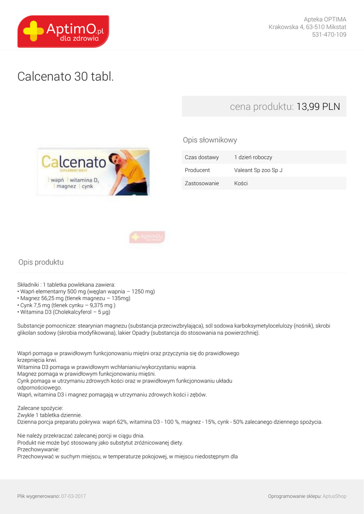 Apteka OPTIMA Krakowska 4, 63-510 Mikstat 531-470-109 Calcenato 30 tabl. cena produktu: 13,99 PLN Opis słownikowy Czas dostawy 1 dzień roboczy Producent Valeant Sp zoo Sp J Zastosowanie Kości Opis produktu Składniki : 1 tabletka powlekana zawiera: • Wapń elementarny 500 mg (węglan wapnia – 1250 mg) • Magnez 56,25 mg (tlenek magnezu – 135mg) • Cynk 7,5 mg (tlenek cynku – 9,375 mg ) • Witamina D3 (Cholekalcyferol – 5 μg) Substancje pomocnicze: stearynian magnezu (substancja przeciwzbrylająca), sól sodowa karboksymetylocelulozy (nośnik), skrobi glikolan sodowy (skrobia modyfikowana), lakier Opadry (substancja do stosowania na powierzchnię). Wapń pomaga w prawidłowym funkcjonowaniu mięśni oraz przyczynia się do prawidłowego krzepnięcia krwi. Witamina D3 pomaga w prawidłowym wchłanianiu/wykorzystaniu wapnia. Magnez pomaga w prawidłowym funkcjonowaniu mięśni. Cynk pomaga w utrzymaniu zdrowych kości oraz w prawidłowym funkcjonowaniu układu odpornościowego. Wapń, witamina D3 i magnez pomagają w utrzymaniu zdrowych kości i zębów. Zalecane spożycie: Zwykle 1 tabletka dziennie. Dzienna porcja preparatu pokrywa: wapń 62%, witamina D3 - 100 %, magnez - 15%, cynk - 50% zalecanego dziennego spożycia. Nie należy przekraczać zalecanej porcji w ciągu dnia. Produkt nie może być stosowany jako substytut zróżnicowanej diety. Przechowywanie: Przechowywać w suchym miejscu, w temperaturze pokojowej, w miejscu niedostępnym dla Plik wygenerowano: 07-03-2017 Oprogramowanie sklepu: AptusShop Apteka OPTIMA Krakowska 4, 63-510 Mikstat 531-470-109 dzieci. Plik wygenerowano: 07-03-2017 Powered by TCPDF (www.tcpdf.org) Oprogramowanie sklepu: AptusShop