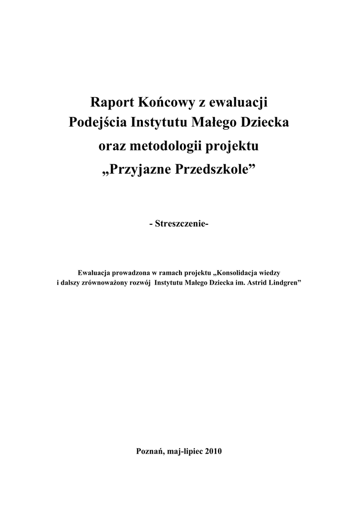 Raport Końcowy z ewaluacji Podejścia Instytutu Małego Dziecka oraz metodologii projektu „Przyjazne Przedszkole” - Streszczenie- Ewaluacja prowadzona w ramach projektu „Konsolidacja wiedzy i dalszy zrównowaŜony rozwój Instytutu Małego Dziecka im. Astrid Lindgren” Poznań, maj-lipiec 2010 Spis treści Wprowadzenie i podziękowania Streszczenie 1. Przedmiot i załoŜenia metodologiczne ewaluacji 1.1. Opis przedmiotu ewaluacji 1.2. Cele i załoŜenia badania ewaluacyjnego 1.3. Metody badania ewaluacyjnego 2. Wyniki ewaluacji 2.1. Rozwój instytucjonalny Instytutu Małego Dziecka im. Astrid Lindgren oraz profesjonalizacja i instytucjonalizacja podejścia IMD 2.1.1. Punkt wyjścia – diagnoza problemu 2.1.2. Początki działalności – Pracownia Działań Twórczych 2.1.3. Instytut Małego Dziecka im. Astrid Lindgren 2.1.4. Współpraca IMD z Fundacją Bernard van Leer (FBvL) 2.1.5. Projekt „Przyjazne Przedszkole” 2.1.6. Akcje społeczne 2.1.7. Profesjonalizacja Instytutu Małego Dziecka 2.1.8. Podejście IMD 2.1.9. Model wewnętrznego szkolenia skoncentrowanego na dziecku 2.1.10. Kapitał ludzki i materialny IMD 2.1.11. Rozwój instytucjonalny IMD oraz profesjonalizacja i instytucjonalizacja podejścia z punktu widzenia pracowników IMD, profesjonalistów, przedstawicieli instytucji i organizacji oraz rodziców współpracujących z IMD 2.2. Zmiana spostrzegania i rozumienia pracy z małym dzieckiem i jego rodziną, dokonana pod wpływem poznania Podejścia IMD wśród nauczycieli i dyrektorów placówek, profesjonalistów zajmujących się wczesną edukacją oraz rodziców 2.2.1. Wpływ Podejścia IMD na nauczycieli, dyrektorów placówek i profesjonalistów 2.2.2. Wpływ Podejścia IMD na rodziców 2.3. Zmiana zachowań w pracy z dzieckiem i jego rodziną wśród nauczycieli i dyrektorów placówek oraz profesjonalistów zajmujących się wczesną edukacją 2.3.1. Zmiana stylu pracy z dzieckiem i podejścia do dzieci 2.3.2. Zmiana stosunku do rodziców i ich roli w rozwoju dzieci 2.3.3. Wprowadzanie nowych rozwiązań pedagogicznych 2.3.4. Kontynuacja projakościowego rozwoju placówek przedszkolnych 3. Dobre praktyki zastosowania podejścia IMD w pracy przedszkola 3.1. Proces adaptacji 3.2. Sytuacje codzienne w przedszkolu 3.3. Praca Metodą Projektów 3.4. AranŜacja przestrzeni w przedszkolach 3.5. Współpraca z rodzicami 4. Podsumowanie i wnioski 5. Załączniki 5.1. Lista instytucji i organizacji reprezentowanych przez respondentów 5.2. Lista przeanalizowanych dokumentów Wprowadzenie i podziękowania Prezentowany raport jest raportem końcowym z badania ewaluacyjnego Podejścia Instytutu Małego Dziecka (Podejścia IMD) oraz metodologii projektu „Przyjazne Przedszkole”. Badanie skupiało się na diagnozie rozwoju instytucjonalnego stowarzyszenia opartego o profesjonalizację Instytutu Małego Dziecka (IMD) oraz ocenę wpływu metodologii wypracowanej w projekcie „Przyjazne Przedszkole” na zmianę podejścia nauczycieli do małych dzieci i ich rodziców oraz ich pracę pedagogiczną. Badanie przeprowadzono w miesiącach styczeń - marzec 2010 roku posługując się metodologia jakościową: przeprowadzono 33 wywiady indywidualne i 2 grupowe z pracownikami i współpracownikami IMD – ekspertami zajmujących się wczesną edukacją oraz pracownikami administracji publicznej, nauczycielami oraz rodzicami; analizę dokumentów i danych zastanych opisujących i dokumentujących prace nad rozwijaniem Podejścia IMD oraz studia przypadku trzech przedszkoli, które zostały zidentyfikowane jako przykłady dobrych praktyk oddziaływania projektu „Przyjazne Przedszkole”. Raport składa się z kilku części a rozpoczyna się streszczeniem prezentującym główne wyniki i wnioski z badania. Rozdział pierwszy zawiera opis koncepcji ewaluacji oraz metodologii przyjętej do realizacji badania. W rozdziale drugim znajduje się prezentacja wyników badania dokonana w oparciu o przyjętą w koncepcji ewaluacji strukturę obszarów badawczych: (1) Rozwój instytucjonalny Instytutu Małego Dziecka im. Astrid Lindgren oraz profesjonalizacja i instytucjonalizacja podejścia IMD; (2) Zmiana spostrzegania i rozumienia pracy z małym dzieckiem i jego rodziną, dokonana pod wpływem poznania metodologii IMD wśród nauczycieli i dyrektorów placówek, profesjonalistów zajmujących się wczesną edukacją oraz rodziców; (3) Zmiana zachowań w pracy z dzieckiem i jego rodziną wśród nauczycieli i dyrektorów placówek oraz profesjonalistów zajmujących się wczesną edukacją. W rozdziale 3 zaprezentowane są dobre praktyki zastosowania Podejścia IMD w pracy przedszkola w oparciu o pogłębione badanie trzech przedszkoli uczestniczących w projekcie „Przyjazne Przedszkole”. Ostatnia część to podsumowanie i wnioski. W załącznikach znajduje się lista instytucji i organizacji reprezentowanych przez respondentów oraz lista przeanalizowanych dokumentów. Autorka raportu serdecznie dziękuje wszystkim osobom, które uczestniczyły w badaniu, którego efektem jest niniejszy raport. W szczególności podziękowania naleŜą się tym, którzy zechcieli wziąć udział w wywiadach, aby podzielić się swoją wiedzą, doświadczeniem i opiniami. Autorka dziękuje takŜe pracownikom Instytutu Małego Dziecka za twórczą współpracę i Ŝyczliwe podejście do prowadzonej ewaluacji oraz udzielanie wielu cennych uwag, pomocnych przy opracowaniu niniejszego raportu. Beata CięŜka Streszczenie Instytut Małego Dziecka im. Astrid Lindgren (IMD) jest organizacją pozarządową, której misją jest budowanie kultury małego dziecka jako integralnej części demokratycznego społeczeństwa. Instytut promuje znaczenie wczesnego dzieciństwa i dobrej jakości edukacji dla rozwoju człowieka. Interdyscyplinarny zespół specjalistów (psychologów, pedagogów, nauczycieli przedszkolnych, socjologów, trenerów) pracuje w oparciu o autorską, innowacyjną koncepcję skoncentrowan