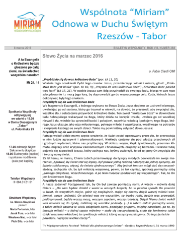 8 marca 2016 A ta Ewangelia o Królestwie będzie głoszona po całej ziemi, na świadectwo wszystkim narodom BIULETYN WSPÓLNOTY, ROK VIII, NUMER 368 Słowo Życia na marzec 2016 o. Fabio Ciardi OMI „Przybliżyło się do was królestwo Boże” (por. Łk 11, 20) Mt 24, 14 Właśnie tego oczekiwali Żydzi Jego czasów. Jezus, przemierzając wioski i miasta, głosił: „Króle- Spotkania Wspólnoty odbywają się we wtorki o 18.00 w Domu Diecezjalnym „Tabor” ul. Połonińska 25 17.00 adoracja Najśw. Sakramentu (kaplica) 18.00 Eucharystia (kaplica) i spotkanie modlitewne (aula pod kaplicą) Telefon Wspólnoty 884.31.51.51 Struktura Wspólnoty ks. Marcin Szopiński pasterz Marta Fortuniak, lider Jacek Fura, v-ce lider Wiesława Mac, v-ce lider Piotr Bilo, v-ce lider stwo Boże jest blisko” (por. Łk 10, 9); „Przyszło do was królestwo Boże”; „Królestwo Boże pośród was jest!” (Łk 17, 21). W osobie Jezusa sam Bóg przychodził do swojego ludu, biorąc w swe ręce zdecydowanie i z mocą jego losy, by doprowadzić go do wyznaczonego celu. Cuda, których Jezus dokonywał, były tego znakiem. Przybliżyło się do was królestwo Boże We fragmencie Ewangelii, z którego wybrano to Słowo Życia, Jezus dopiero co uzdrowił niemego, uwalniając go od szatana, który go trzymał w niewoli, na dowód, że przyszedł, aby zwyciężyć zło, wszelkie zło, i ostatecznie przywrócić królestwo Boże. Ten zwrot ”królestwo Boże” w słownictwie ludu hebrajskiego wskazywał na Boga, który działa na korzyść Izraela, uwalnia go od wszelkiej niewoli i zła, wiedzie ku sprawiedliwości i pokojowi, napełnia radością i pokojem; tego Boga, którego Jezus ukazuje jako ojca miłosiernego, pełnego miłości i współczucia, wrażliwego na potrzeby i cierpienia każdego ze swych dzieci. Także my powinniśmy usłyszeć słowa Jezusa: Przybliżyło się do was królestwo Boże Patrząc wokół siebie mamy często wrażenie, że świat został opanowany przez zło, że przeważają w nim ludzie agresywni i zdemoralizowani. Niekiedy czujemy się pod władzą przeciwnych sił i groźnych wydarzeń, które nas przytłaczają. W obliczu wojen, klęsk żywiołowych, przemian klimatu, migracji oraz kryzysów ekonomicznych i finansowych, czujemy się bezradni. I właśnie tutaj pojawia się zapowiedź Jezusa, który zachęca nas, byśmy uwierzyli, że od tej pory On zwycięża zło i tworzy nowy świat. 25 lat temu, w marcu, Chiara Lubich przemawiając do tysięcy młodych powierzyła im swoje marzenie: „Sprawić, by świat stał się lepszy, był prawie jedną rodziną należącą do jednej ojczyzny, do świata solidarnego, więcej, do świata zjednoczonego”. Aby jednak ten sen mógł stać się rzeczywistością, zachęcała ich, by żyli miłością wzajemną, pewni, że tak czyniąc, spotkają pomiędzy sobą „samego Chrystusa, Wszechmocnego. A po Nim możecie spodziewać się wszystkiego”. Tak, to On jest królestwem Boga. Przybliżyło się do was królestwo Boże A nasze zadanie? Postępować tak, by On był zawsze pomiędzy nami. A wtedy – mówiła dalej Chiara – „On sam będzie działał z wami w waszych krajach, bo w pewien sposób On powróci w świat, do wszystkich miejsc, gdzie się znajdujecie, stając się obecny dzięki waszej miłości wzajemnej, wasze jedności. On oświeci was we wszystkim, co trzeba robić, będzie was prowadził, podtrzymywał, będzie waszą mocą, waszym zapałem, waszą radością. Dzięki Niemu świat wokół was nawróci się do zgody, zabliźnią się wszelkie podziały. (...) A zatem miłość pomiędzy wami, a także miłość zasiana w wielu zakątkach ziemi, pomiędzy grupami, między narodami, po to, by inwazja miłości – o której często mówimy – stała się rzeczywistością, stała się konkretna także dzięki waszemu wkładowi; ta cywilizacja miłości, której wszyscy oczekujemy. Do tego jesteście powołani. I ujrzycie wielkie rzeczy“1. 1 IV Międzynarodowy Festiwal “Młodzi dla zjednoczonego świata” - Genfest, Rzym (Palaeur), 31 marca 1990 Animatorzy diakonii Alicja Smalarz diakonia adoracyjna Marta Fortuniak diakonia prorocka Jacek Fura diakonia modlitwy wstawienniczej i uwolnienia Marta Fortuniak diakonia nauczania Jolanta Skotnicka diakonia uwielbienia Ewa Kruczek diakonia miłosierdzia Wiesława Mac diakonia organizacyjna Paweł Wiśniowski diakonia technicznoporządkowa Klaudia Winiarska diakonia medialna Maria Bassara diakonia modlitwy osłonowej Paweł Kobosz diakonia modlitwy w nagłych potrzebach Maria Hubert diakonia modlitwy za kapłanów Marek Wiśniewski diakonia liturgiczna Piotr Bilo diakonia ewangelizacyjna Maciej Mierzejewski diakonia prowadzenia spotkań Modlitwy wstawiennicze odbywają się we wtorki o 17.15 – zgłoszenia przez stronę www.miriam.rzeszow.pl Słowo Boże do medytacji śr. – J 5, 17-30 Syn Boży ożywia tych, których chce czw. – J 5, 31-47 Nie chcecie przyjść do Mnie, aby mieć życie pt .– J 7, 1-2.10.25-30 Przeciwnicy zamierzają pojmać Jezusa sob. – J 7, 40-53 Spory około osoby Jezusa niedz. – J 8, 1-11 Od tej chwili już nie grzesz pn. – J 8, 1-11 Chrystus ocala cudzołożnicę wt. – J 8, 21-30 Gdy wywyższycie Syna Człowieczego, poznacie, że Ja jestem Intencje do modlitwy W intencji Ojca Świętego Franciszka o światło Ducha Świętego i siły fizyczne potrzebne do prowadzenia Kościoła, o zdrowie i błogosławieństwo Boże dla Benedykta XVI i ks. bpa Jana Wątroby. W intencji wszystkich kapłanów posługujących w Odnowie w naszej Diecezji. O moc Ducha Świętego i światłe oczy serca. O rozwój naprotechnologii w Rzeszowie. O błogosławieństwo Boże i ochronę przed działaniem złych duchów dla ks. Marcina w jego posłudze egzorcysty i modlitwy uwolnienia, oraz dla posługujących członków Wspólnoty, ich rodzin i bliskich. O rozpalenie charyzmatów we Wspólnocie, o jedność, chęć służby i ochronę przed zniechęceniem. W 