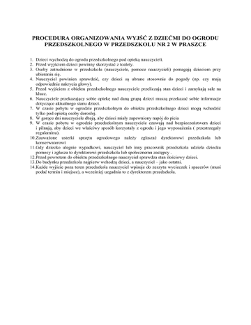 PROCEDURA ORGANIZOWANIA WYJŚĆ Z DZIEĆMI DO OGRODU PRZEDSZKOLNEGO W PRZEDSZKOLU NR 2 W PRASZCE 1. Dzieci wychodzą do ogrodu przedszkolnego pod opieką nauczycieli. 2. Przed wyjściem dzieci powinny skorzystać z toalety. 3. Osoby zatrudnione w przedszkolu (nauczyciele, pomoce nauczycieli) pomagają dzieciom przy ubieraniu się. 4. Nauczyciel powinien sprawdzić, czy dzieci są ubrane stosownie do pogody (np. czy mają odpowiednie nakrycia głowy). 5. Przed wyjściem z obiektu przedszkolnego nauczyciele przeliczają stan dzieci i zamykają sale na klucz. 6. Nauczyciele przekazujący sobie opiekę nad daną grupą dzieci muszą przekazać sobie informacje dotyczące aktualnego stanu dzieci. 7. W czasie pobytu w ogrodzie przedszkolnym do obiektu przedszkolnego dzieci mogą wchodzić tylko pod opieką osoby dorosłej. 8. W gorące dni nauczyciele dbają, aby dzieci miały zapewniony napój do picia 9. W czasie pobytu w ogrodzie przedszkolnym nauczyciele czuwają nad bezpieczeństwem dzieci i pilnują, aby dzieci we właściwy sposób korzystały z ogrodu i jego wyposażenia ( przestrzegały regulaminu). 10. Zauważone usterki sprzętu ogrodowego należy zgłaszać dyrektorowi przedszkola lub konserwatorowi 11. Gdy dziecko ulegnie wypadkowi, nauczyciel lub inny pracownik przedszkola udziela dziecku pomocy i zgłasza to dyrektorowi przedszkola lub społecznemu zastępcy . 12. Przed powrotem do obiektu przedszkolnego nauczyciel sprawdza stan ilościowy dzieci. 13. Do budynku przedszkola najpierw wchodzą dzieci, a nauczyciel – jako ostatni. 14. Każde wyjście poza teren przedszkola nauczyciel wpisuje do zeszytu wycieczek i spacerów (musi podać termin i miejsce), a wcześniej uzgadnia to z dyrektorem przedszkola.