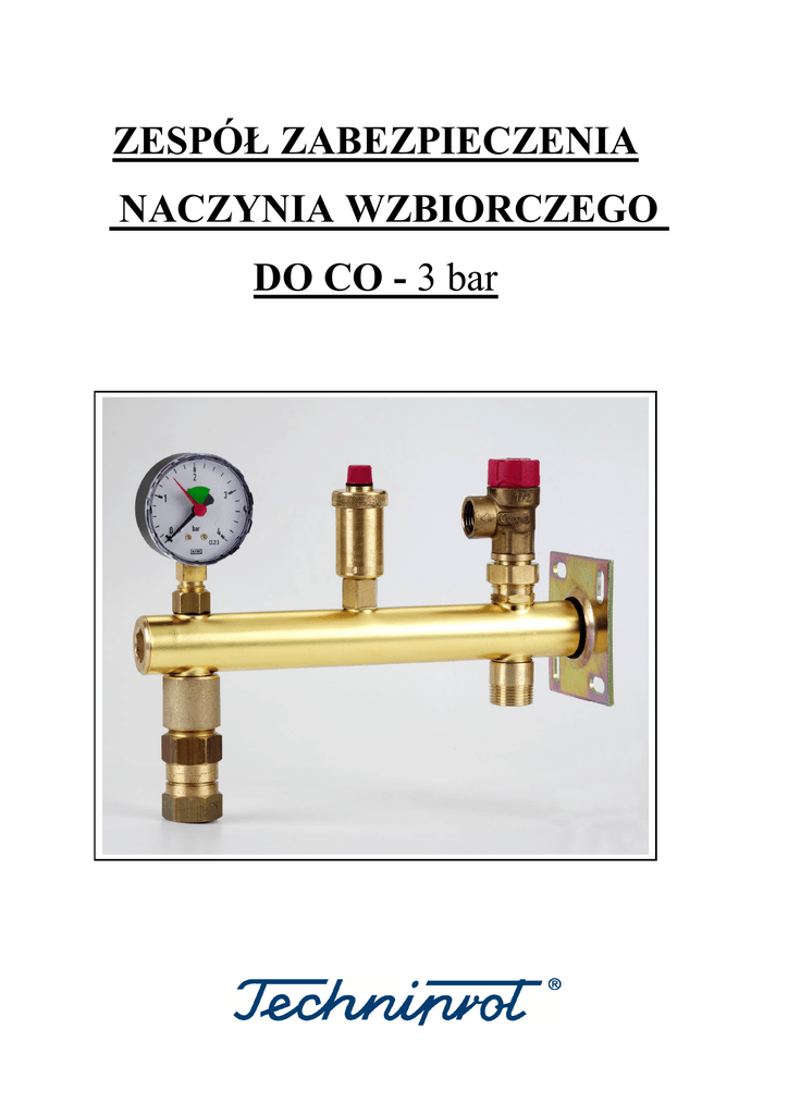 ZESPÓŁ ZABEZPIECZENIA NACZYNIA WZBIORCZEGO DO CO - 3 bar ZESPÓŁ ZABEZPIECZENIA NACZYŃ WZBIORCZYCH DO INSTALACJI C.O. Zespoły zabezpieczenia naczyń wzbiorczych są stosowane w instalacjach grzewczych zamkniętych i ich zadaniem jest nie dopuszczenie do nadmiernego wzrostu ciśnienia w tych instalacjach. Zadaniem takiego zespołu zabezpieczenia jest skierowanie nadwyżki czynnika grzewczego (tj. wody powstałej w wyniku wzrostu jego objętości pod wpływem wzrostu temperatury) do naczynia wzbiorczego z przeponą, a w przypadku znacznego wzrostu ciśnienia przekraczającego 3 bar upuszczenie nadmiaru wody na zewnątrz. Szybkozłączka (sprzęgło Gw ¾'') umożliwia bezpośrednie zamocowanie zespołu przeponowego naczynia wzbiorczego. Zespoły zabezpieczenia naczyń wzbiorczych do C.O. produkowane są z rury mosiężnej o średnicy zewnętrznej ø 33 mm i grubości ścianki 2,5 mm, wykonanych z wysokiej jakości mosiądzu w gatunku CW508L, nie zawierającego szkodliwego dla instalacji ołowiu, co powoduje, że nie powstają tlenki ołowiu, które zawsze utrudniają funkcjonowanie poszczególnych elementów wyposażenia zespołów. Powierzchnia zewnętrzna konsoli zespołów jest wybłyszczana elektrochemicznie i lakierowana, co nadaje produktowi estetyczny wygląd. Zespoły zabezpieczenia naczyń wzbiorczych do instalacji centralnego ogrzewania wyposażone są w manometr 4 bar z zaworem stopowym (odcinającym), zawór bezpieczeństwa 3 bar, odpowietrznik automatyczny z zaworem stopowym (odcinającym), szybkozłączkę-sprzęgło z gwintem wewnętrznym Gw ¾'', służące do bezpośredniego mocowania naczynia wzbiorczego, korki uszczelniające oraz płytkę z otworami ułatwiającymi montaż zespołu do ściany. Cały produkt zapakowany jest w pudełko tekturowe, w którym są też śruby z kołkami do mocowania. Wszystkie uszczelnienia w zespołach zabezpieczenia naczyń wzbiorczych wykonane są z gumy EPDM-70, która gwarantuje należytą szczelność. Materiały wchodzące w skład zespołów posiadają odpowiednie atesty bądź świadectwa jakości (rura mosiężna ø 33 x 2,5 , manometr 4 bar, odpowietrznik automatyczny, szybkozłączka-sprzęgło, wszystkie oringi). Zawór bezpieczeństwa 3 bar posiada odpowiedni znak bezpieczeństwa producenta. Zespoły zabezpieczenia do C.O. montuje się na ścianie za pomocą śrub z kołkami rozporowymi. Naczynie przeponowe wzbiorcze odpowiedniej pojemności mocuje się do zespołu przy pomocy szybkozłączki-sprzęgła z gwintem wewnętrznym Gw ¾ ''. Wyjście zaworu bezpieczeństwa 3 bar powinno być podłączone do instalacji odpływowej. Zespoły zabezpieczenia naczyń wzbiorczych firmy „TECHNIPROT” zapewniają sprawne i bezpieczne działanie każdej instalacji grzewczej.