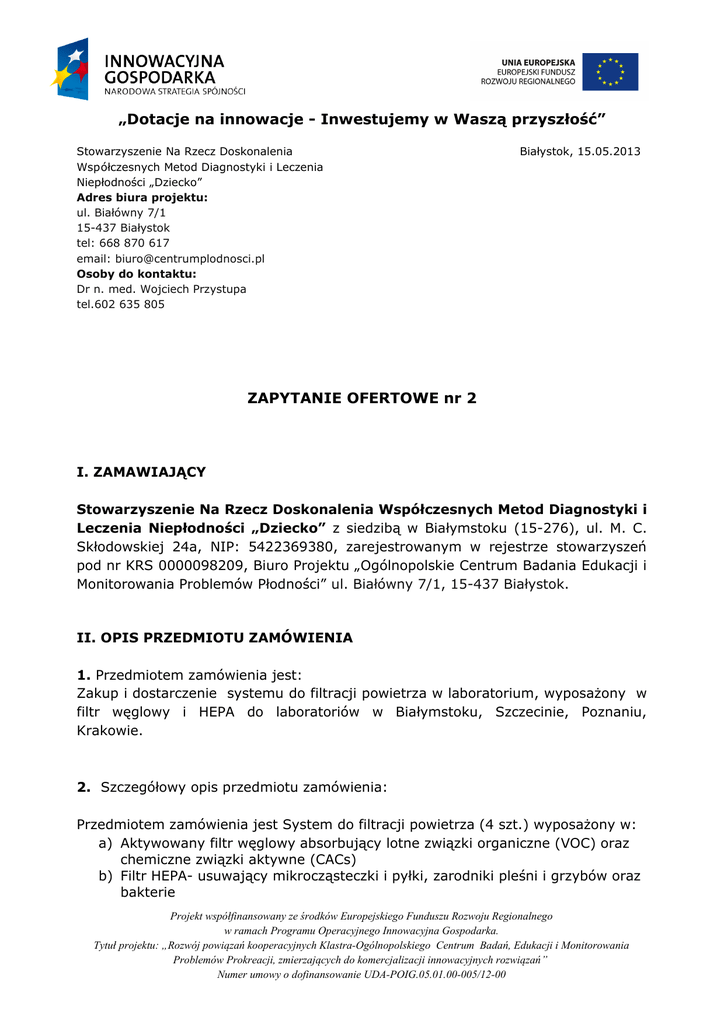 „Dotacje na innowacje - Inwestujemy w Waszą przyszłość” Stowarzyszenie Na Rzecz Doskonalenia Współczesnych Metod Diagnostyki i Leczenia Niepłodności „Dziecko” Adres biura projektu: ul. Białówny 7/1 15-437 Białystok tel: 668 870 617 email: [email protected] Osoby do kontaktu: Dr n. med. Wojciech Przystupa tel.602 635 805 Białystok, 15.05.2013 ZAPYTANIE OFERTOWE nr 2 I. ZAMAWIAJĄCY Stowarzyszenie Na Rzecz Doskonalenia Współczesnych Metod Diagnostyki i Leczenia Niepłodności „Dziecko” z siedzibą w Białymstoku (15-276), ul. M. C. Skłodowskiej 24a, NIP: 5422369380, zarejestrowanym w rejestrze stowarzyszeń pod nr KRS 0000098209, Biuro Projektu „Ogólnopolskie Centrum Badania Edukacji i Monitorowania Problemów Płodności” ul. Białówny 7/1, 15-437 Białystok. II. OPIS PRZEDMIOTU ZAMÓWIENIA 1. Przedmiotem zamówienia jest: Zakup i dostarczenie systemu do filtracji powietrza w laboratorium, wyposażony w filtr węglowy i HEPA do laboratoriów w Białymstoku, Szczecinie, Poznaniu, Krakowie. 2. Szczegółowy opis przedmiotu zamówienia: Przedmiotem zamówienia jest System do filtracji powietrza (4 szt.) wyposażony w: a) Aktywowany filtr węglowy absorbujący lotne związki organiczne (VOC) oraz chemiczne związki aktywne (CACs) b) Filtr HEPA- usuwający mikrocząsteczki i pyłki, zarodniki pleśni i grzybów oraz bakterie Projekt współfinansowany ze środków Europejskiego Funduszu Rozwoju Regionalnego w ramach Programu Operacyjnego Innowacyjna Gospodarka. Tytuł projektu: „Rozwój powiązań kooperacyjnych Klastra-Ogólnopolskiego Centrum Badań, Edukacji i Monitorowania Problemów Prokreacji, zmierzających do komercjalizacji innowacyjnych rozwiązań” Numer umowy o dofinansowanie UDA-POIG.05.01.00-005/12-00 „Dotacje na innowacje - Inwestujemy w Waszą przyszłość” c) Foto-utleniacz katalityczny, który przy udziale dwutlenku tytanu rozkłada toksyczne chemikalia do wody i dwutlenku węgla i eliminuje nieprzyjemne zapachy d) Światło ultrafioletowe zabija bakterie i wirusy, które są zbyt małe, aby być filtrowane przez filtr HEPA e) Lampa UV- 4x, zapas na 3 lata f) Filtr HEPA-5x, zapas na 3 lata g) Wymiary zewnętrzne: Wymiary urządzenia: 55cm x 46cm x 20cm, a zatem odpowiednie do zagospodarowania niewielkiej przestrzeni h) Waga: 10,43 kg i) Maksymalny przepływ powietrza: 7,5 m2 na minutę. Dostawa i montaż na koszt wykonawcy realizującego zlecenie. Sprzedający gwarantuje specjalistyczne szkolenie dotyczące sprzętu w ramach zakupu. obsługi III. TERMIN WYKONANIA ZAMÓWIENIA I WARUNKI PŁATNOŚCI 1. Termin wykonania przedmiotu zamówienia: od 01.06.2013 do 30.06.2013 r. 2. Płatność za wykonywane przedmiotu zamówienia będzie miała miejsce w czerwcu 2013, chyba że strony uzgodnią inaczej. IV. OPIS SPOSBU PRZYGOTOWANIA OFERTY 1. Oferent powinien stworzyć ofertę, która powinna zawierać minimum: - opis doświadczenia jakim dysponuje Oferent przy działaniach związanych z przedmiotem zamówienia, cenę brutto za wykonanie przedmiotu zamówienia, okres gwarancyjny sprzętu warunki gwarancji warunki serwisu pogwarancyjnego termin dostarczenia sprzętu, których dotyczy niniejsze zapytanie, podpis osoby upoważnionej, 2. Oferta musi być ważna co najmniej 30 dni od daty jej wystawienia. 3. Oferent poniesie wszystkie koszty związane z przygotowaniem i złożeniem oferty. V. MIEJSCE ORAZ TERMIN SKŁADANIA OFERT 1. Oferta powinna być przesłana za pośrednictwem: poczty, kuriera lub też dostarczona osobiście na adres biura Projektu „Ogólnopolskie Centrum Badania, Projekt współfinansowany ze środków Europejskiego Funduszu Rozwoju Regionalnego w ramach Programu Operacyjnego Innowacyjna Gospodarka. Tytuł projektu: „Rozwój powiązań kooperacyjnych Klastra-Ogólnopolskiego Centrum Badań, Edukacji i Monitorowania Problemów Prokreacji, zmierzających do komercjalizacji innowacyjnych rozwiązań” Numer umowy o dofinansowanie UDA-POIG.05.01.00-005/12-00 „Dotacje na innowacje - Inwestujemy w Waszą przyszłość” Edukacji i Monitorowania Problemów Płodności”: ul. Białówny 7/1, 15-437 Białystok do dnia 27.05.2013 do godz. 12.00 (decyduje data otrzymania oferty przez Zamawiającego). 2. Ocena ofert zostanie dokonana w dniu 28.05.2013 o godz. 16.00, a wyniki i wybór najkorzystniejszej oferty zostanie ogłoszony 31.05.2013 do godziny 16:00 w siedzibie Zamawiającego. 3. Oferty złożone po terminie nie będą rozpatrywane. 4. Oferent może przed upływem terminu składania ofert zmienić lub wycofać swoją ofertę. 5. W toku badania i oceny ofert Zamawiający może żądać od oferentów wyjaśnień dotyczących treści złożonych ofert. 6. Umowa z firmą lub firmami, które złożą najkorzystniejszą ofertę zostanie podpisana do dnia 01.06.2013. 7. Zapytanie ofertowe zamieszczono na stronie: www.stowarzyszenie- dziecko.com.pl, oraz www.centrumplodnosci.pl VI. OCENA OFERT Zamawiający dokona oceny ważnych ofert na podstawie następujących kryteriów: 1. Zamówienie zostanie udzielone poprzez wybór najkorzystniejszej oferty. Kryterium decydującym jest cena brutto. Oferty muszą być zgodne ze specyfikacją i gwarantować dostawę w terminie do 30 czerwca 2013 r. VII. INFORMACJE DOTYCZĄCE WYBORU NAJKORZYSTNIEJSZEJ OFERTY 1. Zamawiający zawiadomi wszystkich oferentów o wyborze najkorzystniejszej oferty. 2. Zamawiający dokona wyboru jednego sprzedawcę/producenta będących przedmiotem niniejszego zapytania (pkt. II zapytania ofertowego). 3. Jeżeli Oferent, którego oferta została wybrana, uchyli się od zawarcia umowy lub zrezygnuje z jej realizacji, Zamawiający może wybrać ofertę najkorzystniejszą spośród pozostałych ofert, bez przeprowadzania ich ponownej oceny na podstawie klasyfikacji stworzonej w pierwotnym konkursie ofert lub ponownie przeprowadzi konkurs ofert. 4. Jeżeli do dnia 27.05.2013 do Zamawiającego wpłynie mniej niż 3 oferty, to Zamawiający może unieważnić konkurs ofert. P