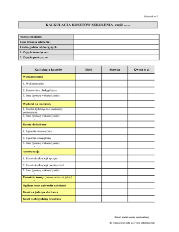 Załącznik nr 5 KALKULACJA KOSZTÓW SZKOLENIA- część …... Nazwa szkolenia: Czas trwania szkolenia: Liczba godzin edukacyjnych: 1. Zajęcia teoretyczne: 2. Zajęcia praktyczne: Kalkulacja kosztów Ilość Stawka Kwota w zł Wynagrodzenia 1. Wykładowców 2. Pracownicy obsługi kursu 3. Inne (proszę wskazać jakie): Wydatki na materiały 1. Środki dydaktyczne, materiały pomocnicze 2. Inne (proszę wskazać jakie): Koszty dodatkowe 1. Egzamin wewnętrzny 2. Egzamin zewnętrzny 3. Inne (proszę wskazać jakie): Amortyzacja 1. Koszt eksploatacji sprzętu 2. Koszt eksploatacji pomieszczeń 3. Inne (proszę wskazać jakie): Pozostałe koszty (proszę wskazać jakie): Ogółem koszt całkowity szkolenia Koszt na jednego słuchacza Koszt osobogodziny szkolenia /Data i podpis osoby uprawnionej do reprezentowania instytucji szkoleniowej/