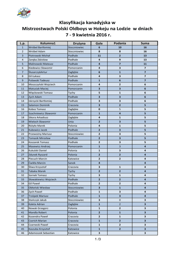 Klasyfikacja kanadyjska w Mistrzostwach Polski Oldboys w Hokeju na Lodzie w dniach 7 - 9 kwietnia 2016 r. L.p. Kolumna1 Gole Podania Suma 6 10 16 Stoczniowiec 8 8 16 Podhale 11 2 13 Zaręba Zdzisław Podhale 4 9 13 Malinowski Mateusz Podhale 4 7 11 6 Kiedewicz Sławomir Pomorzanin 4 3 7 7 ŚlusarczykArtur Zagłębie 6 1 7 8 Gil Łukasz Podhale 4 3 7 Drużyna 1 Wróbel Bartłomiej Stoczniowiec 2 Wróbel Adam 3 Piotrowski Michał 4 5 9 Puławski Tadeusz Podhale 1 6 7 10 Moszczyński Wojciech Pomorzanin 4 2 6 11 Matusiak Maciej Pomorzanin 3 3 6 12 Więckowski Tomasz Tychy 5 1 6 13 Zych Adam Podhale 3 3 6 14 Iskrzycki Bartłomiej Podhale 3 3 6 15 Salamon Dominik Cracovia 3 2 5 16 Koboz Tomasz Zagłębie 0 5 5 17 Szachniewicz Sławomir Pomorzanin 1 4 5 18 Sikora Arkadiusz Zagłębie 4 1 5 19 Wieloch Sławomir Unia 2 3 5 20 Różyło Marek Polonia 4 1 5 21 Kubowicz Jacek Podhale 2 3 5 22 Przewożny Mariusz Stoczniowiec 2 3 5 23 Tomasik Mirosław Podhale 2 3 5 24 Koszarek Tomasz Podhale 2 3 5 25 Masewicz Andrzej Pomorzanin 1 3 4 26 Kukulski Daniel Polonia 1 3 4 27 Zdunek Ryszard Polonia 2 2 4 28 Piecuch Marcin Katowice 2 2 4 29 Ćwikła Marcin Sanok 4 30 Śliwa Krzysztof Cracovia 3 1 4 31 Tabaka Marek Tychy 2 2 4 32 Sornek Tomasz Tychy 3 1 4 33 Słowakiewicz Wojciech Podhale 2 2 4 34 Gil Paweł Podhale 2 2 4 35 Obłoński Wiesław Stoczniowiec 3 1 4 36 Zych Paweł Podhale 1 3 4 37 Trzópek Mariusz Podhale 1 3 4 38 Stańczyk Jakub Stoczniowiec 3 0 3 39 Kaleta Adrian Zagłębie 1 2 3 40 Nowak Grzegorz Polonia 1 2 3 41 Mandla Robert Polonia 2 1 3 42 Kozendra Paweł Cracovia 2 1 3 43 Csorich Marian Cracovia 1 2 3 44 Czarnecki Paweł Cracovia 1 2 3 45 Kaszuba Krzysztof Katowice 1 2 3 46 Adamoszek Sebastian Katowice 3 1 /3 4 3 47 Sosiński Wojciech Zagłębie 1 2 3 48 Miłek Andrzej Tychy 2 1 3 49 Jękner Tomasz Podhale 2 1 3 50 Ryczko Miłosz Unia 1 2 3 51 Klisiak Waldemar Unia 1 2 3 52 Błażowski Robert Stoczniowiec 2 1 3 53 Cieślak Marcin Cracovia 2 1 3 54 Furca Sławomir Podhale 1 2 3 55 Laszkiewicz Daniel Cracovia 1 2 3 56 Małachowski Ireneusz Stoczniowiec 2 0 2 57 Bersiński Adam Tychy 1 1 2 58 Żurek Marek Polonia 1 1 2 59 Wiwatowski Andrzej Pomorzanin 1 1 2 60 Dorol Jakub Pomorzanin 2 61 Kociołek Grzegorz Cracovia 1 1 2 62 Maślak Andrzej Sanok 1 1 2 63 Bierzyński Piotr Tychy 2 2 64 Abram Lesław Tychy 2 65 Żbik Beniamin Tychy 1 1 2 66 Szalkowski Aleksander Katowice 1 1 2 67 Wróbel Zbigniew Katowice 1 1 2 68 Bartoszewski Tomasz Pomorzanin 2 2 69 Fraszko Robert Pomorzanin 1 2 70 Zajączkowski Piotr Zagłębie 2 2 71 Bartnik Mirosław Zagłębie 1 1 2 72 Kuberski Jacek Unia 2 2 73 Zeman Łukasz Unia 2 2 74 Wilk Piotr Unia 2 2 75 Secemski Janusz Polonia 2 2 76 Łuka Kazimierz Tychy 2 2 77 Kuczera Sebastian Tychy 2 2 78 Piotrowtrski Bartłomiej Podhale 2 2 79 Jarosz Krzysztof Unia 1 2 80 Trethan Piotr Unia 2 81 Waszak Jarosław Stoczniowiec 1 1 2 82 Osiński Sławomir Tychy 1 1 2 83 Madeksza Piotr Zagłębie 2 2 84 Wieczorkiewicz Krzysztof Cracovia 1 1 2 85 Fusiński Jakub Zagłębie 0 1 1 86 Mirczak Michał Unia 1 1 87 Sroka Arkadiusz Polonia 1 1 88 Sikora Radosław Polonia 1 89 Kopeć Sebastian Katowice 90 Bielak Ryszard Podhale 91 Szopiński Robert Podhale 92 Górecki Marek Pomorzanin 93 Ślusarek Piotr Cracovia 94 Zawiłowicz Krzysztof Sanok 1 1 95 Mika Paweł Sanok 1 1 96 Milan Wojciech Sanok 1 1 97 Glimas Tomasz Sanok 98 Pachut Marcin Tychy 99 Krzysztofik Adrian Katowice 2 2 1 1 2 1 1 1 1 1 1 1 1 1 1 1 1 1 1 2 /3 1 1 1 100 Cieraciew Norbert Sanok 101 Brejta Robert Sanok 1 1 1 1 102 Kuc Jarosław Zagłębie 1 1 103 Mirczak Michał Unia 1 1 104 Dzięgiel Grzegorz Unia 1 1 105 Tomski Paweł Unia 1 106 Jęczała Tomasz Unia 1 107 Łysy Przemysław Polonia 108 Oelschlager Paweł Tychy 109 Wawrzonkowski Andrzej Tychy 1 110 Sobas Bartosz Tychy 1 111 Kuberski Jacek Unia 112 Brejta Dariusz Sanok 113 Rocki Krzysztof Sanok 114 Juchniewicz Jacek Stoczniowiec 115 Hanzel Mariusz Katowice 116 Niekurzak Paweł Zagłębie 117 Jakubaszek Jacek Sanok 1 1 1 1 1 1 1 1 1 1 1 1 1 1 1 1 1 1 1 1 3 /3 1 1