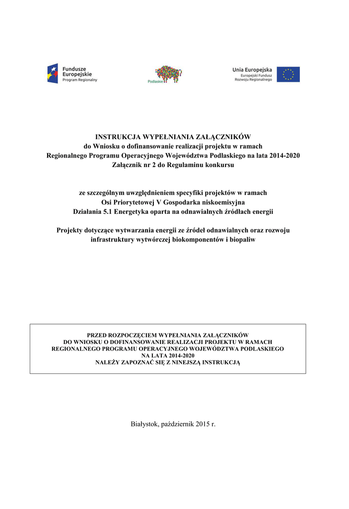 INSTRUKCJA WYPEŁNIANIA ZAŁĄCZNIKÓW do Wniosku o dofinansowanie realizacji projektu w ramach Regionalnego Programu Operacyjnego Województwa Podlaskiego na lata 2014-2020 Załącznik nr 2 do Regulaminu konkursu ze szczególnym uwzględnieniem specyfiki projektów w ramach Osi Priorytetowej V Gospodarka niskoemisyjna Działania 5.1 Energetyka oparta na odnawialnych źródłach energii Projekty dotyczące wytwarzania energii ze źródeł odnawialnych oraz rozwoju infrastruktury wytwórczej biokomponentów i biopaliw PRZED ROZPOCZĘCIEM WYPEŁNIANIA ZAŁĄCZNIKÓW DO WNIOSKU O DOFINANSOWANIE REALIZACJI PROJEKTU W RAMACH REGIONALNEGO PROGRAMU OPERACYJNEGO WOJEWÓDZTWA PODLASKIEGO NA LATA 2014-2020 NALEŻY ZAPOZNAĆ SIĘ Z NINEJSZĄ INSTRUKCJĄ Białystok, październik 2015 r. Załączniki do wniosku o dofinansowanie realizacji projektu ze środków Europejskiego Funduszu Rozwoju Regionalnego (EFRR) w ramach Regionalnego Programu Operacyjnego na lata 20142020 (RPOWP 2014-2020) służą do uzupełnienia oraz uwiarygodnienia danych opisanych we wniosku o dofinansowanie realizacji projektu. 2 Spis załączników: 1. Studium Wykonalności (dotyczy sektora publicznego) ...............................................................4 2. Biznes Plan (dotyczy przedsiębiorstw)........................................................................................7 3. Dokumenty związane z przeprowadzeniem postępowania oceny oddziaływania na środowisko ..................................................................................................................................8 4. Kopia pozwolenia na budowę lub zgłoszenie budowy/dokumenty dotyczące zagospodarowania przestrzennego ...........................................................................................10 5. Wyciąg z dokumentacji technicznej ..........................................................................................12 6. Kosztorys inwestorski................................................................................................................12 7. Potwierdzenie prawa do dysponowania gruntem lub obiektami - oświadczenie o prawie dysponowania nieruchomością na cele realizacji projektu, umowa najmu, dzierżawy itp. .....13 8. Oświadczenie Beneficjenta o braku możliwości odzyskania podatku VAT ..............................14 9. Pozostałe załączniki. .................................................................................................................14 3 Załączniki stanowią integralną część wniosku o dofinansowanie realizacji projektu ze środków EFRR w ramach RPOWP 2014-2020. Sposób złożenia oraz wymagany zakres określa Regulamin oceny i wyboru projektów w ramach Regionalnego Programu Operacyjnego Województwa Podlaskiego na lata 2014-2020, a niniejsza Instrukcja, stanowi jego załącznik nr 2. Lista załączników obowiązkowych może zostać rozszerzona w zależności od specyfiki działania, występującej pomocy publicznej, dodatkowych uregulowań prawnych i wytycznych. Instytucja Organizująca Konkurs (IOK) zastrzega sobie prawo do wezwania Wnioskodawcy do dostarczenia innych dokumentów niewymienionych w niniejszej Instrukcji pod warunkiem, że ich uzupełnienie nie będzie prowadziło do istotnej modyfikacji wniosku (art. 43 ust. 2 Ustawy z dnia 11 lipca 2014 r. o zasadach realizacji programów w zakresie polityki spójności finansowanych w perspektywie finansowej 2014-2020) oraz będą niezbędne do oceny spełnienia kryteriów wyboru projektów (art. 37 ust. 5 Ustawy z dnia 11 lipca 2014 r. o zasadach realizacji programów w zakresie polityki spójności finansowych w perspektywie finansowej 2014-2020). Dołączone decyzje administracyjne powinny być ważne na dzień składania wniosku o dofinansowanie oraz faktycznego rozpoczęcia realizacji projektu (w szczególności dotyczy to projektów obejmujących roboty budowlane), a także powinny być opatrzone adnotacją organu wydającego o ich ostateczności/prawomocności. Załączniki sporządzone na formularzach IOK, zgodnie z pkt 10 Regulaminu Oceny i wyboru projektów, powinny być opatrzone pieczęcią nagłówkową (firmową) wystawiającego. Wszystkie załączniki do wniosku więcej niż jednostronicowe powinny być zszyte lub np. zbindowane i mieć ponumerowane strony, zaś każda ze stron załącznika składanego w oryginale powinna być parafowana przez osobę podpisującą wniosek. Na załącznikach powinna się również znajdować data ich sporządzenia/wydania. Wymóg nie dotyczy oryginalnych załączników sporządzonych przez inne podmioty niż Wnioskodawca np. oryginału pozwolenia na budowę lub innej decyzji administracyjnej, oryginału kosztorysu inwestorskiego, oryginału opinii o innowacyjności, oryginału ofert dystrybutorów lub dostawców sprzętu, itp. Jednocześnie należy pamiętać, iż zgodnie z warunkami konkursu wystarczy przedłożyć kopie ww. dokumentów potwierdzone za zgodność z oryginałem. 1. Studium Wykonalności (dotyczy sektora publicznego) Zgodnie z definicją dokumentu Analiza kosztów i korzyści projektów inwestycyjnych: Przewodnik (Fundusz Strukturalny, Fundusz Spójności i ISPA) (Komisja Europejska, 1997 r.) studium wykonalności jest „badaniem proponowanego projektu, które ma ustalić, czy proponowana inwestycja jest na tyle atrakcyjna, aby uzasadniać dalsze szczegółowe prace przygotowawcze”. Sporządzane jest przez Wnioskodawców innych niż przedsiębiorstwa. Stanowi podstawowy załącznik do wniosku o dofinansowanie. 4 Podstawą przygotowania Studium Wykonalności są następujące dokumenty: Wytyczne Ministra Infrastruktury i Rozwoju w zakresie zagadnień związanych z przygotowaniem projektów inwestycyjnych, w tym projektów generujących dochód i projektów hybrydowych na lata 2014-2020 z dnia 18 marca 2015 r. (zwane dalej Wytycznymi przygotowania projektów inwestycyjnych); Rozporządzenie delegowane Komisji (UE) nr 480/2014 z dnia 3 mar