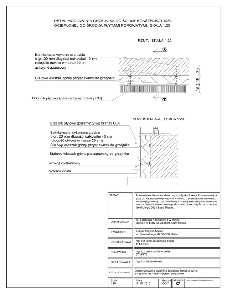 DETAL MOCOWANIA GRZEJNIKA DO ŚCIANY KONSTRUKCYJNEJ OCIEPLONEJ OD ŚRODKA PŁYTAMI POROWATYMI, SKALA 1:20 a RZUT, SKALA 1:20 20 Bohrkonsola wykonana z dybla o gr. 20 mm długości całkowitej 40 cm (długość otworu w murze 20 cm) uchwyt dystansowy 15 2 18 Stalowy wieszak górny przyspawany do grzejnika a Grzejnik płytowy (parametry wg branży CO) PRZEKRÓJ A-A, SKALA 1:20 Grzejnik płytowy (parametry wg branży CO) Bohrkonsola wykonana z dybla o gr. 20 mm długości całkowitej 40 cm (długość otworu w murze 20 cm) Stalowy wieszak górny przyspawany do grzejnika Stalowy wieszak górny przyspawany do grzejnika uchwyt dystansowy blokada dolna TEMAT Przebudowa i termomodernizacja budynku Szkoły Podstawowej nr 2 przy ul. Tadeusza Kościuszki 4 w Mielcu z przebudową wewnętrznej instalacji gazowej, z przebudową instalacji wentylacji mechanicznej wraz z utwardzeniem terenu pod montaż pomp ciepła na działce nr 1946 obręb 0001 Stare Miasto. LOKALIZACJA ul. Tadeusza Kościuszki 4 w Mielcu, działka nr1946, obręb 0001 Stare Miasto INWESTOR Gmina Miejska Mielec ul. Żeromskiego 26, 39-300 Mielec PROJEKTOWAŁ mgr inż. arch. Eugeniusz Skaza 114-Km/75 SPRAWDZIŁ mgr inż. Andrzej Wawrzeński 571/Kl/73 OPRACOWAŁA mgr inż.Wioleta Kukla TYTUŁ RYSUNKU Skala 1:20 Detalmocowania grzejnika do ściany konstrukcyjnej ocieplonej od środka płytami porowatymi Data 01.03.2015 Rys. nr BRANŻA CO-7 S www.marzec-budownictwo.pl