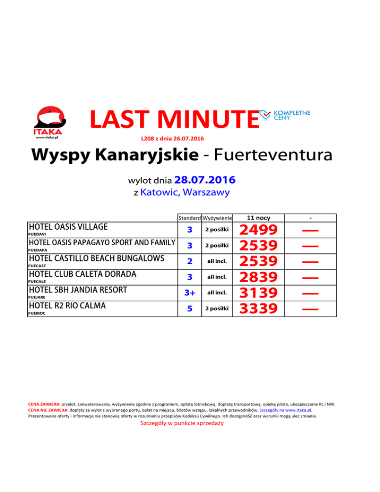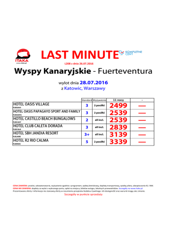 LAST MINUTE L208 z dnia 26.07.2016 Wyspy Kanaryjskie - Fuerteventura wylot dnia 28.07.2016 z Katowic, Warszawy Standard Wyżywienie HOTEL OASIS VILLAGE FUEOAVI HOTEL OASIS PAPAGAYO SPORT AND FAMILY FUEOAPA HOTEL CASTILLO BEACH BUNGALOWS FUECAST HOTEL CLUB CALETA DORADA FUECALE HOTEL SBH JANDIA RESORT FUEJARE HOTEL R2 RIO CALMA FUERIOC 3 2 posiłki 3 2 posiłki 2 all incl. 3 all incl. 3+ all incl. 5 2 posiłki 11 nocy - 2499 2539 2539 2839 3139 3339 — — — — — — CENA ZAWIERA: przelot, zakwaterowanie, wyżywienie zgodnie z programem, opłatę lotniskową, dopłatę transportową, opiekę pilota, ubezpieczenie KL i NW. CENA NIE ZAWIERA: dopłaty za wylot z wybranego portu, opłat na miejscu, biletów wstępu, lokalnych przewodników. Szczegóły na www.itaka.pl. Prezentowane oferty i informacje nie stanowią oferty w rozumieniu przepisów Kodeksu Cywilnego. Ich dostępnoŚć oraz warunki mogą ulec zmianie. Szczegóły w punkcie sprzedaży