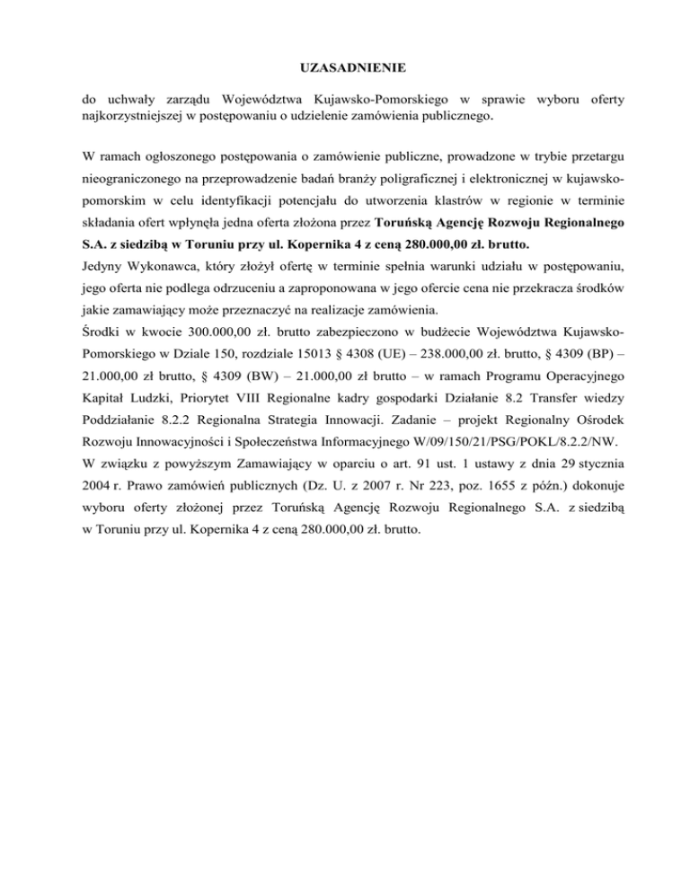 UZASADNIENIE do uchwały zarządu Województwa Kujawsko-Pomorskiego w sprawie wyboru oferty najkorzystniejszej w postępowaniu o udzielenie zamówienia publicznego. W ramach ogłoszonego postępowania o zamówienie publiczne, prowadzone w trybie przetargu nieograniczonego na przeprowadzenie badań branŜy poligraficznej i elektronicznej w kujawskopomorskim w celu identyfikacji potencjału do utworzenia klastrów w regionie w terminie składania ofert wpłynęła jedna oferta złoŜona przez Toruńską Agencję Rozwoju Regionalnego S.A. z siedzibą w Toruniu przy ul. Kopernika 4 z ceną 280.000,00 zł. brutto. Jedyny Wykonawca, który złoŜył ofertę w terminie spełnia warunki udziału w postępowaniu, jego oferta nie podlega odrzuceniu a zaproponowana w jego ofercie cena nie przekracza środków jakie zamawiający moŜe przeznaczyć na realizacje zamówienia. Środki w kwocie 300.000,00 zł. brutto zabezpieczono w budŜecie Województwa KujawskoPomorskiego w Dziale 150, rozdziale 15013 § 4308 (UE) – 238.000,00 zł. brutto, § 4309 (BP) – 21.000,00 zł brutto, § 4309 (BW) – 21.000,00 zł brutto – w ramach Programu Operacyjnego Kapitał Ludzki, Priorytet VIII Regionalne kadry gospodarki Działanie 8.2 Transfer wiedzy Poddziałanie 8.2.2 Regionalna Strategia Innowacji. Zadanie – projekt Regionalny Ośrodek Rozwoju Innowacyjności i Społeczeństwa Informacyjnego W/09/150/21/PSG/POKL/8.2.2/NW. W związku z powyŜszym Zamawiający w oparciu o art. 91 ust. 1 ustawy z dnia 29 stycznia 2004 r. Prawo zamówień publicznych (Dz. U. z 2007 r. Nr 223, poz. 1655 z późn.) dokonuje wyboru oferty złoŜonej przez Toruńską Agencję Rozwoju Regionalnego S.A. z siedzibą w Toruniu przy ul. Kopernika 4 z ceną 280.000,00 zł. brutto.