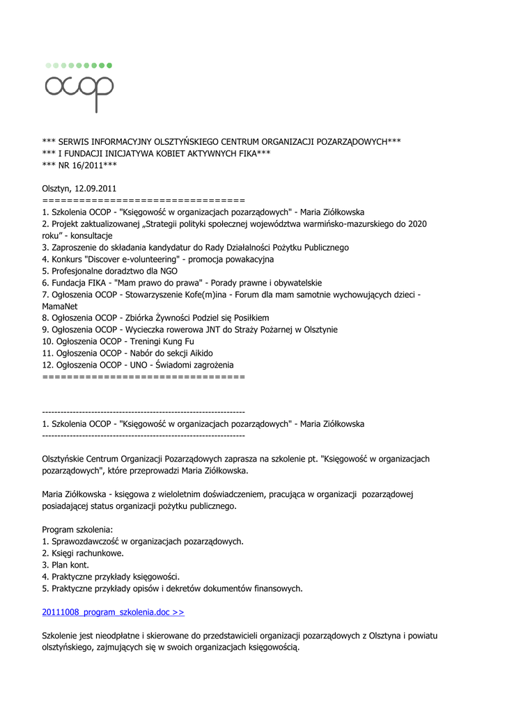 *** SERWIS INFORMACYJNY OLSZTYŃSKIEGO CENTRUM ORGANIZACJI POZARZĄDOWYCH*** *** I FUNDACJI INICJATYWA KOBIET AKTYWNYCH FIKA*** *** NR 16/2011*** Olsztyn, 12.09.2011 ================================= 1. Szkolenia OCOP - "Księgowość w organizacjach pozarządowych" - Maria Ziółkowska 2. Projekt zaktualizowanej „Strategii polityki społecznej województwa warmińsko-mazurskiego do 2020 roku” - konsultacje 3. Zaproszenie do składania kandydatur do Rady Działalności Pożytku Publicznego 4. Konkurs "Discover e-volunteering" - promocja powakacyjna 5. Profesjonalne doradztwo dla NGO 6. Fundacja FIKA - "Mam prawo do prawa" - Porady prawne i obywatelskie 7. Ogłoszenia OCOP - Stowarzyszenie Kofe(m)ina - Forum dla mam samotnie wychowujących dzieci MamaNet 8. Ogłoszenia OCOP - Zbiórka Żywności Podziel się Posiłkiem 9. Ogłoszenia OCOP - Wycieczka rowerowa JNT do Straży Pożarnej w Olsztynie 10. Ogłoszenia OCOP - Treningi Kung Fu 11. Ogłoszenia OCOP - Nabór do sekcji Aikido 12. Ogłoszenia OCOP - UNO - Świadomi zagrożenia ================================= -----------------------------------------------------------------1. Szkolenia OCOP - "Księgowość w organizacjach pozarządowych" - Maria Ziółkowska -----------------------------------------------------------------Olsztyńskie Centrum Organizacji Pozarządowych zaprasza na szkolenie pt. "Księgowość w organizacjach pozarządowych", które przeprowadzi Maria Ziółkowska. Maria Ziółkowska - księgowa z wieloletnim doświadczeniem, pracująca w organizacji pozarządowej posiadającej status organizacji pożytku publicznego. Program szkolenia: 1. Sprawozdawczość w organizacjach pozarządowych. 2. Księgi rachunkowe. 3. Plan kont. 4. Praktyczne przykłady księgowości. 5. Praktyczne przykłady opisów i dekretów dokumentów finansowych. 20111008_program_szkolenia.doc >> Szkolenie jest nieodpłatne i skierowane do przedstawicieli organizacji pozarządowych z Olsztyna i powiatu olsztyńskiego, zajmujących się w swoich organizacjach księgowością. Uczestnicy szkolenia otrzymają materiały szkoleniowe oraz poczęstunek. Miejsce szkolenia: Olsztyńskie Centrum Organizacji Pozarządowych ul. Tarasa Szewczenki 1 10-274 Olsztyn mapa >> Termin: 8 (sobota) października 2011 g. 9.00-14.15 Prosimy o wypełnienie i odesłanie formularza zgłoszeniowego >> do dnia 30.09.2011. O zakwalifikowaniu się do udziału w szkoleniu poinformujemy Państwa telefonicznie lub pocztą elektroniczną do dnia 4.10.2011. Informacje na temat szkolenia: OCOP, ul. Tarasa Szewczenki 1 10-274 Olsztyn tel. 503 680 500 [email protected] Szkolenie jest organizowane w ramach projektu „Olsztyńskie Centrum Organizacji Pozarządowych" dofinansowanego przez Gminę Olsztyn. Partnerzy projektu: Związek Stowarzyszeń „Razem w Olsztynie” Fundacja "Inicjatywa Kobiet Aktywnych" FIKA -----------------------------------------------------------------2. Projekt zaktualizowanej „Strategii polityki społecznej województwa warmińsko-mazurskiego do 2020 roku” - konsultacje -----------------------------------------------------------------Zarząd Województwa Warmińsko-Mazurskiego na posiedzeniu w dniu 9 sierpnia br. przyjął projekt zaktualizowanej Strategii polityki społecznej województwa warmińsko-mazurskiego do 2020 roku oraz skierował dokument do konsultacji społecznych, które odbywają się w okresie od dnia 18 sierpnia do 14 października 2011. W dniu 15 września 2011 r. o godz. 1000 w Sali Sesyjnej Nr 420 (IV piętro) Urzędu Marszałkowskiego Województwa Warmińsko-Mazurskiego w Olsztynie, ul. Emilii Plater 1, odbędzie się otwarte spotkanie konsultacyjne, podczas którego omówiony zostanie przebieg prac nad procesem aktualizacji Strategii oraz zaprezentowany projekt dokumentu. Każdy z uczestników spotkania będzie mógł zgłosić swoje opinie, uwagi i propozycje dotyczące projektu Strategii. Zobacz więcej >> --------------------------------------------------------------------3. Zaproszenie do składania kandydatur do Rady Działalności Pożytku Publicznego --------------------------------------------------------------------Marszałek Województwa Warmińsko-Mazurskiego zaprasza organizacje pozarządowe oraz inne uprawnione pomioty do zgłaszania kandydatów na członków Rady Działalności Pożytku Publicznego Województwa Warmińsko-Mazurskiego. Kandydatów na członków Rady można zgłaszać do 7 października 2011. Zasady zgłaszania kandydatów do Rady określa Uchwała Nr 42/541/11/IV Zarządu Województwa Warmińsko - Mazurskiego z dnia 9 sierpnia 2011 r. w sprawie określenia trybu powoływania członków oraz organizacji i trybu działania Rady Działalności Pożytku Publicznego Województwa Warmińsko – Mazurskiego. Uchwała wraz z „Kartą zgłoszenia kandydata do Rady Działalności Pożytku Publicznego Województwa Warmińsko-Mazurskiego” dostępna jest na stronie internetowej: http://bip.warmia.mazury.pl/urzad_marszalkowski/ (zakładka: „Organizacje Pozarządowe – Rada Działalności Pożytku Publicznego”). Kandydatów na członków Rady można zgłaszać do dnia 7 października. Wszelkich informacji udziela Biuro ds. Współpracy z Organizacjami Pozarządowymi Urzędu Marszałkowskiego Województwa Warmińsko-Mazurskiego: tel. 724 777 741, e-mail: [email protected] Zobacz więcej >> --------------------------------------------------------------------4. Konkurs "Discover e-volunteering" - promocja powakacyjna --------------------------------------------------------------------W związku z tym, iż podczas sezonu urlopowego wiele organizacji pozarządowych ze względów organizacyjnych nie mogło zgłosić się do europejskiej edycji Konkursu "Discover e-volunteering", nabór zgłoszeń został przedłużony do 16 września br. Szczegóły konkursu: http://www.e-volunteering.eu/competition Informacje na naszej stronie: www.ocop.olsztyn.pl/ ----------------------------------------------------------------