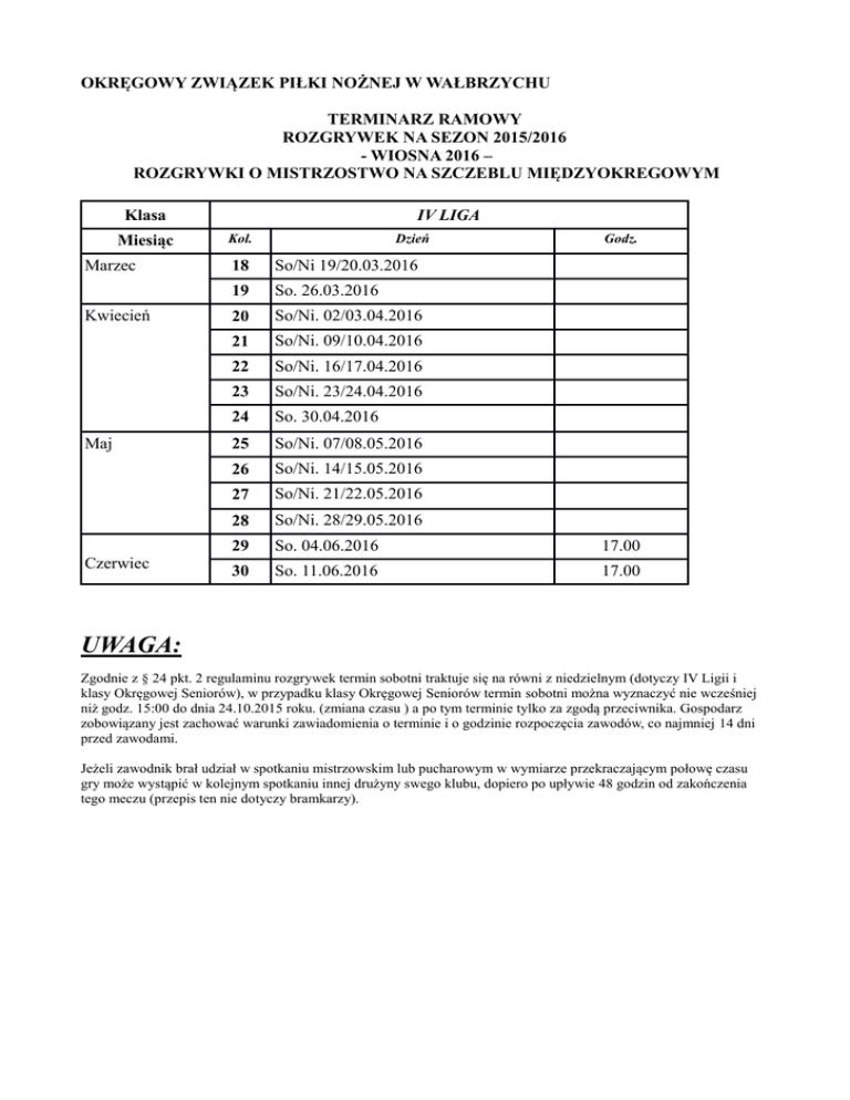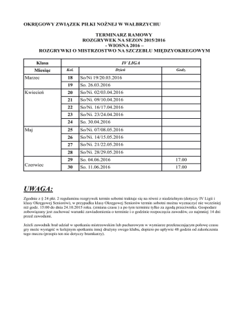 OKRĘGOWY ZWIĄZEK PIŁKI NOŻNEJ W WAŁBRZYCHU TERMINARZ RAMOWY ROZGRYWEK NA SEZON 2015/2016 - WIOSNA 2016 – ROZGRYWKI O MISTRZOSTWO NA SZCZEBLU MIĘDZYOKREGOWYM Klasa Miesiąc Marzec Kwiecień Maj Czerwiec IV LIGA Dzień Kol. Godz. 18 So/Ni 19/20.03.2016 19 So. 26.03.2016 20 So/Ni. 02/03.04.2016 21 So/Ni. 09/10.04.2016 22 So/Ni. 16/17.04.2016 23 So/Ni. 23/24.04.2016 24 So. 30.04.2016 25 So/Ni. 07/08.05.2016 26 So/Ni. 14/15.05.2016 27 So/Ni. 21/22.05.2016 28 So/Ni. 28/29.05.2016 29 So. 04.06.2016 17.00 30 So. 11.06.2016 17.00 UWAGA: Zgodnie z § 24 pkt. 2 regulaminu rozgrywek termin sobotni traktuje się na równi z niedzielnym (dotyczy IV Ligii i klasy Okręgowej Seniorów), w przypadku klasy Okręgowej Seniorów termin sobotni można wyznaczyć nie wcześniej niż godz. 15:00 do dnia 24.10.2015 roku. (zmiana czasu ) a po tym terminie tylko za zgodą przeciwnika. Gospodarz zobowiązany jest zachować warunki zawiadomienia o terminie i o godzinie rozpoczęcia zawodów, co najmniej 14 dni przed zawodami. Jeżeli zawodnik brał udział w spotkaniu mistrzowskim lub pucharowym w wymiarze przekraczającym połowę czasu gry może wystąpić w kolejnym spotkaniu innej drużyny swego klubu, dopiero po upływie 48 godzin od zakończenia tego meczu (przepis ten nie dotyczy bramkarzy).
