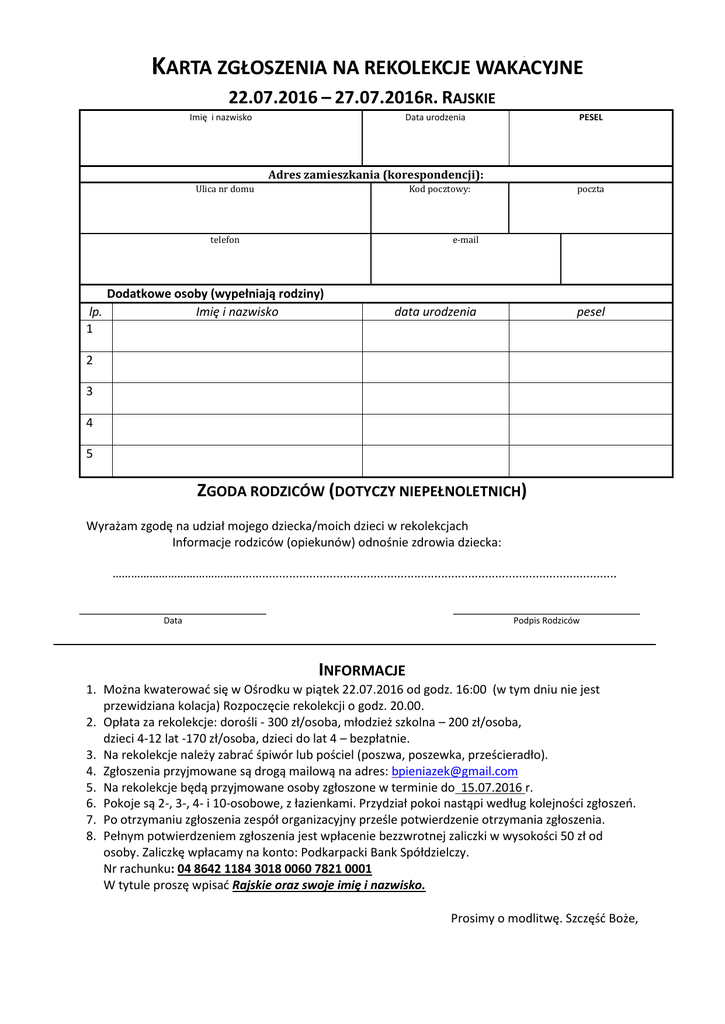 KARTA ZGŁOSZENIA NA REKOLEKCJE WAKACYJNE 22.07.2016 – 27.07.2016R. RAJSKIE Imię i nazwisko Data urodzenia PESEL Adres zamieszkania (korespondencji): Ulica nr domu Kod pocztowy: telefon poczta e-mail Dodatkowe osoby (wypełniają rodziny) lp. Imię i nazwisko 1 data urodzenia pesel 2 3 4 5 ZGODA RODZICÓW (DOTYCZY NIEPEŁNOLETNICH) Wyrażam zgodę na udział mojego dziecka/moich dzieci w rekolekcjach Informacje rodziców (opiekunów) odnośnie zdrowia dziecka: ……………………………………............................................................................................................... Data Podpis Rodziców INFORMACJE 1. Można kwaterować się w Ośrodku w piątek 22.07.2016 od godz. 16:00 (w tym dniu nie jest przewidziana kolacja) Rozpoczęcie rekolekcji o godz. 20.00. 2. Opłata za rekolekcje: dorośli - 300 zł/osoba, młodzież szkolna – 200 zł/osoba, dzieci 4-12 lat -170 zł/osoba, dzieci do lat 4 – bezpłatnie. 3. Na rekolekcje należy zabrać śpiwór lub pościel (poszwa, poszewka, prześcieradło). 4. Zgłoszenia przyjmowane są drogą mailową na adres: [email protected] 5. Na rekolekcje będą przyjmowane osoby zgłoszone w terminie do 15.07.2016 r. 6. Pokoje są 2-, 3-, 4- i 10-osobowe, z łazienkami. Przydział pokoi nastąpi według kolejności zgłoszeń. 7. Po otrzymaniu zgłoszenia zespół organizacyjny prześle potwierdzenie otrzymania zgłoszenia. 8. Pełnym potwierdzeniem zgłoszenia jest wpłacenie bezzwrotnej zaliczki w wysokości 50 zł od osoby. Zaliczkę wpłacamy na konto: Podkarpacki Bank Spółdzielczy. Nr rachunku: 04 8642 1184 3018 0060 7821 0001 W tytule proszę wpisać Rajskie oraz swoje imię i nazwisko. Prosimy o modlitwę. Szczęść Boże,