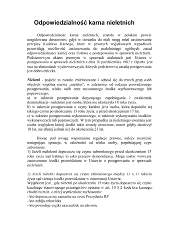 Odpowiedzialność karna nieletnich Odpowiedzialność karna nieletnich, została w polskim prawie uregulowana dwutorowo, gdyż w stosunku do nich mogą mieć zastosowanie przepisy Kodeksu Karnego, które w pewnych wyjątkowych wypadkach przewidują możliwość zastosowania do małoletniego ogólnych zasad odpowiedzialności karnej oraz Ustawa o postępowaniu w sprawach nieletnich. Podstawowym aktem prawnym w sprawach nieletnich jest Ustawa o postępowaniu w sprawach nieletnich z dnia 26 października 1982 r. Oparta jest ona na elementach wychowawczych, których podstawową zasadą postępowania jest dobro dziecka. Nieletni - pojecie to zostało zróżnicowane i odnosi się do trzech grup osób objętych wspólną nazwą ,,nieletni'', w zależności od rodzaju prowadzonego postępowania, wieku osób oraz stosowanego środka wychowawczego lub poprawczego; a) w zakresie postępowania dotyczącego zapobiegania i zwalczania demoralizacji- nieletnim jest osoba, która nie ukończyła 18 roku życia. b) w zakresie postępowania o czyny karalne je st osoba, która dopuściła się takiego czynu po ukończeniu 13 roku życia, a przed ukończeniem 17 lat. c) w zakresie postępowania wykonawczego, w zakresie wykonywania środków wykonawczych lub poprawczych. W tym przypadku za nieletniego uważana jest osoba względem której środki takie zostały orzeczone, nawet gdyby ukończył 18 lat, nie dłużej jednak niż do ukończenia 21 lat. Biorąc pod uwagę wspomniane regulacje prawne, należy rozróżnić następujące sytuacje, w zależności od wieku osoby, popełniającej czyn zabroniony. 1) Jeżeli małoletni dopuszcza się czynu zabronionego przed ukończeniem 13 roku życia sąd traktuje to jako przejaw demoralizacji. Mogą zostać wówczas zastosowane środki przewidziane w Ustawie o postępowaniu w sprawach nieletnich. 2) Jeżeli nieletni dopuszcza się czynu zabronionego między 13 a 17 rokiem życia sąd stosuje środki przewidziane w omawianej Ustawie. Wyjątkiem jest, gdy nieletni po ukończeniu 15 roku życia dopuszcza się czynu karalnego stanowiącego przestępstwo opisane w art. 10 § 2 kode ksu karnego, chodzi tu m.in. o niżej wymienione zachowania: - kto dopuszcza się zamachu na życie Prezydenta RP - kto zabija człowieka - kto powoduje ciężki uszczerbek na zdrowiu - kto sprowadza zdarzenie, które zagraża życiu lub zdrowiu wielu osób albo mieniu w wielkich rozmiarach - kto sprowadza katastrofę w ruchu lądowym, powietrznym lub wodnym W tych przypadkach osoba nieletnia, która popełniła czyn po ukończeniu 15 roku życia może odpowiadać karnie jak osoba dorosła. 3) Jeżeli sprawca dopuszcza się czy nu zabronionego po ukończeniu 17 roku życia wówczas taka osoba odpowiada karnie jako osoba pełnoletnia, zgodnie z przepisami kodeksu karnego. Zgodnie z prawem Sąd Rodzinny wszczyna postępowanie, jeżeli zachodzi podejrzenie, że nieletni wykazuje przejawy demoralizacji lub tez dopuścił się czyny karalnego. Postępowanie wyjaśniające ma na celu ustalenie, czy rzeczywiście istnieją okoliczności świadczące o demoralizacji nieletniego, a w sprawie o czyn karalny czy faktycznie został on popełniony. Postępowanie wyjaśniające jest najważniejszym etapem, ponieważ podczas jego trwania są zbierane informacje o nieletnich, jego środowisku i na tej podstawie sędzia podejmuje decyzje o dalszym toku postępowania. Sąd rodzinny wobec nieletniego może zastosować środki w ychowawcze lub poprawcze m.in.: 1) udzielić upomnienia, 2) zobowiązać do określonego postępowania, a zwłaszcza do naprawienia wyrządzonej szkody 3) ustanowić nadzór odpowiedzialny rodziców lub opiekun 4) ustanowić nadzór organizacji młodzieżowej lub innej organizacji społecznej 5) zastosować nadzór kuratora 6) skierować do ośrodka kuratorskiego 7) orzec zakaz prowadzenia pojazdów 8) orzec przepadek rzeczy uzyskanych związku z popełnieniem czynu karalnego 9) orzec umieszczenie w rodzinie zastępczej, w młodz ieżowym ośrodku wychowawczym albo w młodzieżowym ośrodku socjoterapii 10) orzec umieszczenie w zakładzie poprawczym 11) zastosować inne środki zastrzeżone w niniejszej ustawie do właściwości sądu rodzinnego, jak również zastosować środki przewidziane w Kod eksie rodzinnym i opiekuńczym Najsurowszą karą dla nieletniego jest umieszczenie nieletniego w zakładzie poprawczym. Za zastosowaniem tego środka przemawia wysoki stopień demoralizacji nieletniego oraz okoliczności i charakter czynu zwłaszcza, gdy inne zastosowane środki okazały się nieskuteczne lub nie rokują resocjalizacji nieletniego. Sąd może zmienić lub uchylać środki wychowawcze, podstawą zmiany są względy wychowawcze przed wszystkim to, czy osobowość i postępowanie młodej osoby zmieniają się na kor zyć.