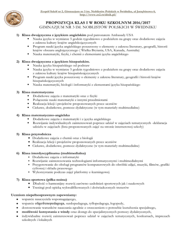 Zespół Szkół nr 2, Gimnazjum nr 3 im. Noblistów Polskich w Świdniku, ul Jarzębinowa 6, http://www.zs2.swidnik.pl/ PROPOZYCJA KLAS I W ROKU SZKOLNYM 2016/2017 GIMNAZJUM NR 3 IM. NOBLISTÓW POLSKICH W ŚWIDNIKU 1) Klasa dwujęzyczna z językiem angielskim pod patronatem Ambasady USA Nauka języka w wymiarze 5 godzin tygodniowo z podziałem na grupy oraz dodatkowe zajęcia z zakresu kultury krajów angielskojęzycznych Program nauki języka angielskiego poszerzony o elementy z zakresu literatury, geografii, historii krajów obszaru anglojęzycznego ( Wielka Brytania, USA, Kanada, Australia) Nauka matematyki, fizyki, i chemii z elementami języka angielskiego 2) Klasa dwujęzyczna z językiem hiszpańskim. Nauka języka hiszpańskiego od podstaw Nauka języka w wymiarze 5 godzin tygodniowo z podziałem na grupy oraz dodatkowe zajęcia z zakresu kultury krajów hiszpańskojęzycznych Program nauki języka poszerzony o elementy z zakresu literatury, geografii i historii krajów hiszpańskojęzycznych Nauka matematyki, biologii i informatyki z elementami języka hiszpańskiego 3) Klasa matematyczna Dodatkowe zajęcia z matematyki oraz z fizyki Połączenie nauki matematyki z innymi przedmiotami Realizacja lekcji i projektów proponowanych przez uczniów Ciekawe, dodatkowe, pomoce dydaktyczne (w tym materiały multimedialne) 4) Klasa matematyczno-angielska Dodatkowe zajęcia z matematyki i z języka angielskiego Rozwijanie indywidualnych zainteresowań poprzez udział w zajęciach tematycznych -deklaracja udziału w zajęciach (lista proponowanych zajęć na stronie internetowej szkoły) 5) Klasa przyrodnicza Dodatkowe zajęcia z chemii oraz z biologii Realizacja lekcji i projektów proponowanych przez uczniów Ciekawe, dodatkowe, pomoce dydaktyczne (w tym materiały multimedialne) 6) Klasa interdyscyplinarna (multimedialna) Dodatkowe zajęcia z informatyki Rozwijanie zainteresowania technologiami informatycznymi i multimedialnymi Przygotowanie do obsługi programów komputerowych do obróbki zdjęć, muzyki, filmów, grafiki cyfrowej i składu prasowego Wykorzystanie podczas zajęć platformy e-learningowej 7) Klasa sportowa (piłka nożna) Dbałość o harmonijny rozwój zarówno uzdolnień sportowych jak i naukowych Treningi pod opieką wykwalifikowanych i doświadczonych trenerów Uczniom niepełnosprawnym zapewniamy: wsparcie nauczyciela wspomagającego, wsparcie oligofrenopedagoga, surdopedagoga, tyflopedagoga, logopedy, dostosowanie warunków nauczania zgodnie z orzeczeniem o potrzebie kształcenia specjalnego, możliwość korzystania z windy oraz dostęp do specjalistycznych pomocy dydaktycznych, indywidualne rozwój zainteresowań poprzez udział w zajęciach tematycznych, konkursach, imprezach szkolnych i lokalnych