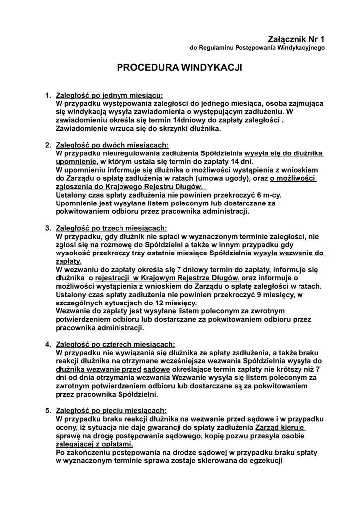 Załącznik Nr 1 do Regulaminu Postępowania Windykacyjnego PROCEDURA WINDYKACJI 1. Zaległość po jednym miesiącu: W przypadku występowania zaległości do jednego miesiąca, osoba zajmująca się windykacją wysyła zawiadomienia o występującym zadłużeniu. W zawiadomieniu określa się termin 14dniowy do zapłaty zaległości . Zawiadomienie wrzuca się do skrzynki dłużnika. 2. Zaległość po dwóch miesiącach: W przypadku nieuregulowania zadłużenia Spółdzielnia wysyła się do dłużnika upomnienie, w którym ustala się termin do zapłaty 14 dni. W upomnieniu informuje się dłużnika o możliwości wystąpienia z wnioskiem do Zarządu o spłatę zadłużenia w ratach (umowa ugody), oraz o możliwości zgłoszenia do Krajowego Rejestru Długów. Ustalony czas spłaty zadłużenia nie powinien przekroczyć 6 m-cy. Upomnienie jest wysyłane listem poleconym lub dostarczane za pokwitowaniem odbioru przez pracownika administracji. 3. Zaległość po trzech miesiącach: W przypadku, gdy dłużnik nie spłaci w wyznaczonym terminie zaległości, nie zgłosi się na rozmowę do Spółdzielni a także w innym przypadku gdy wysokość przekroczy trzy ostatnie miesiące Spółdzielnia wysyła wezwanie do zapłaty. W wezwaniu do zapłaty określa się 7 dniowy termin do zapłaty, informuje się dłużnika o rejestracji w Krajowym Rejestrze Długów, oraz informuje o możliwości wystąpienia z wnioskiem do Zarządu o spłatę zaległości w ratach. Ustalony czas spłaty zadłużenia nie powinien przekroczyć 9 miesięcy, w szczególnych sytuacjach do 12 miesięcy. Wezwanie do zapłaty jest wysyłane listem poleconym za zwrotnym potwierdzeniem odbioru lub dostarczane za pokwitowaniem odbioru przez pracownika administracji. 4. Zaległość po czterech miesiącach: W przypadku nie wywiązania się dłużnika ze spłaty zadłużenia, a także braku reakcji dłużnika na otrzymane wcześniejsze wezwania Spółdzielnia wysyła do dłużnika wezwanie przed sądowe określające termin zapłaty nie krótszy niż 7 dni od dnia otrzymania wezwania Wezwanie wysyła się listem poleconym za zwrotnym potwierdzeniem odbioru lub dostarczane są za pokwitowaniem przez pracownika Spółdzielni. 5. Zaległość po pięciu miesiącach: W przypadku braku reakcji dłużnika na wezwanie przed sądowe i w przypadku oceny, iż sytuacja nie daje gwarancji do spłaty zadłużenia Zarząd kieruje sprawę na drogę postępowania sądowego, kopię pozwu przesyła osobie zalegającej z opłatami. Po zakończeniu postępowania na drodze sądowej w przypadku braku spłaty w wyznaczonym terminie sprawa zostaje skierowana do egzekucji komorniczej. 6. Zaległość po sześciu miesiącach: W przypadku występowania zadłużenia powyżej 6 miesięcy Zarząd kieruje wniosek do Rady Nadzorczej o wykluczeniu z rejestru członków. Rada Nadzorcza podejmuje uchwałę, po uprzednim wysłuchaniu wyjaśnień zainteresowanego członka. Wezwanie na posiedzenie Rady Nadzorczej jest wysyłane listem poleconym za potwierdzeniem odbioru lub dostarczane za pokwitowaniem odbioru przez pracownika administracji. 7. Postępowanie sądowe i komornicze prowadzone jest przez Radcę Prawnego reprezentującego WSM we współpracy z pracownikami odpowiedzialnymi za windykację do czasu wyegzekwowania należności. Postępowanie prowadzone jest poprzez: komornika, wpis do księgi wieczystej zadłużenia, wpis do KRD i eksmisje. 8. W odstępach półrocznych wywieszane są na klatkach schodowych informacje o łącznym zadłużeniu wraz z odsetkami za zwłokę wszystkich lokatorów mieszkających na danej klatce i w danym budynku. Załączniki: 1. Wzór zawiadomienia do jednego miesiąca 2. Wzór upomnienia po dwóch miesiącach 3. Wzór wezwania do zapłaty po 3 miesiącach 4. Wzór wezwania przed sądowego po 4 miesiącach 5. Wzór pismo lokatora o rozłożenie zadłużenia na raty 6. Wzór pozwu sądowego po 5 miesiącach.