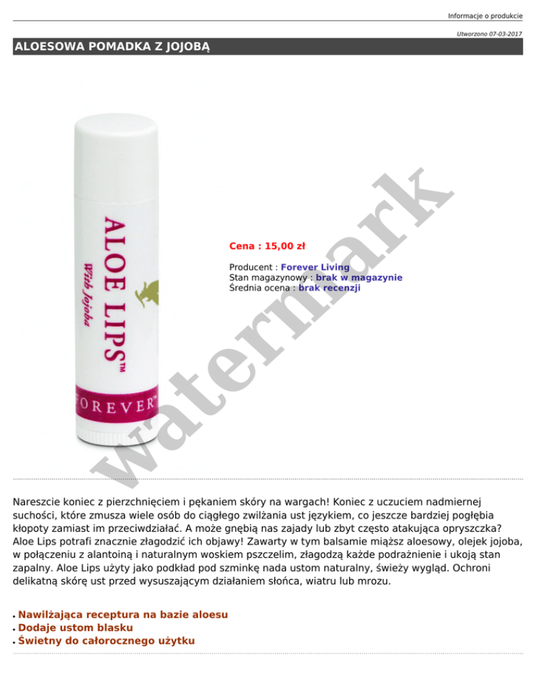 Informacje o produkcie Utworzono 07-03-2017 er m ar k ALOESOWA POMADKA Z JOJOBĄ Cena : 15,00 zł w at Producent : Forever Living Stan magazynowy : brak w magazynie Średnia ocena : brak recenzji Nareszcie koniec z pierzchnięciem i pękaniem skóry na wargach! Koniec z uczuciem nadmiernej suchości, które zmusza wiele osób do ciągłego zwilżania ust językiem, co jeszcze bardziej pogłębia kłopoty zamiast im przeciwdziałać. A może gnębią nas zajady lub zbyt często atakująca opryszczka? Aloe Lips potrafi znacznie złagodzić ich objawy! Zawarty w tym balsamie miąższ aloesowy, olejek jojoba, w połączeniu z alantoiną i naturalnym woskiem pszczelim, złagodzą każde podrażnienie i ukoją stan zapalny. Aloe Lips użyty jako podkład pod szminkę nada ustom naturalny, świeży wygląd. Ochroni delikatną skórę ust przed wysuszającym działaniem słońca, wiatru lub mrozu. ● ● ● Nawilżająca receptura na bazie aloesu Dodaje ustom blasku Świetny do całorocznego użytku